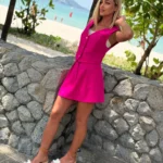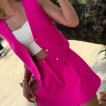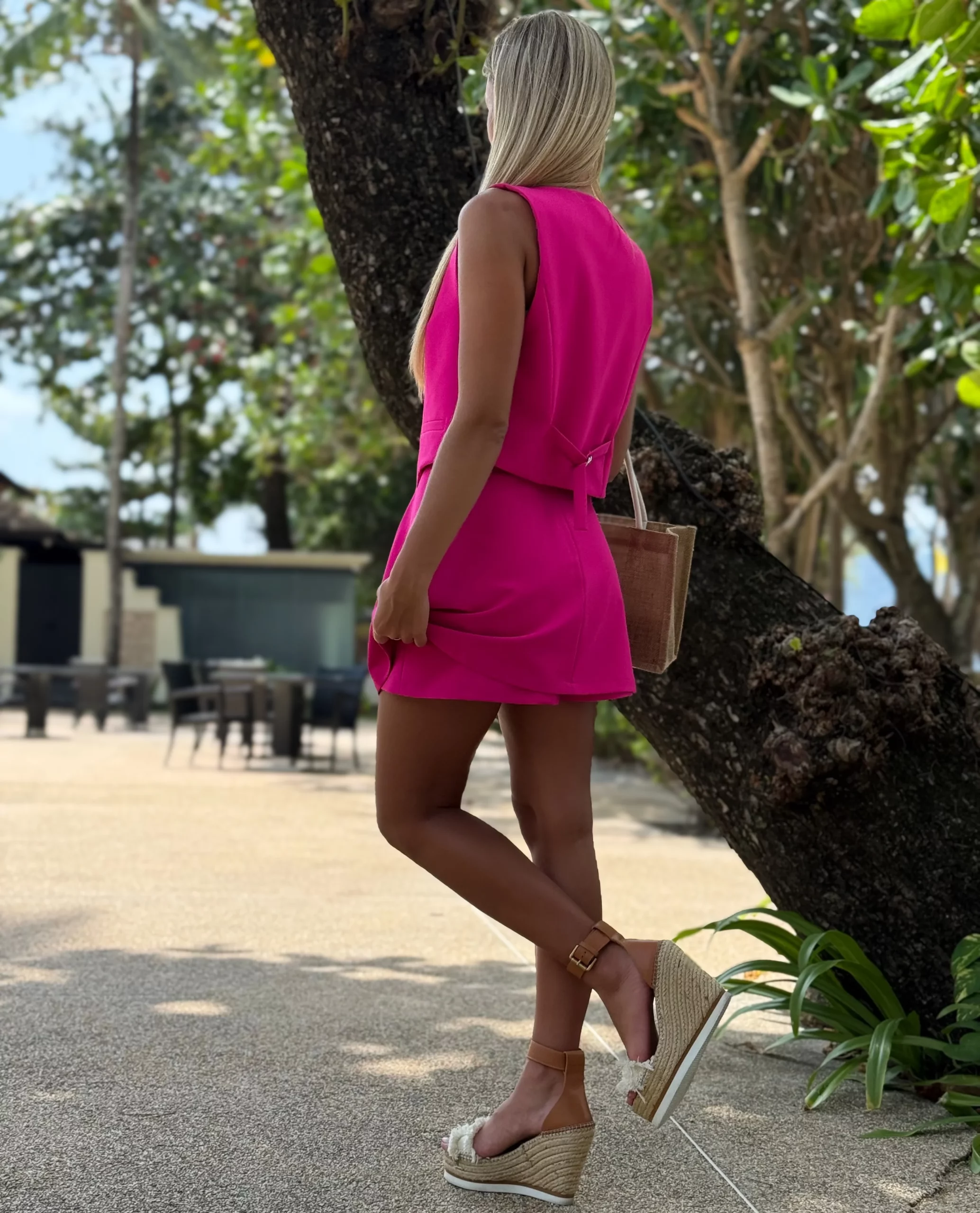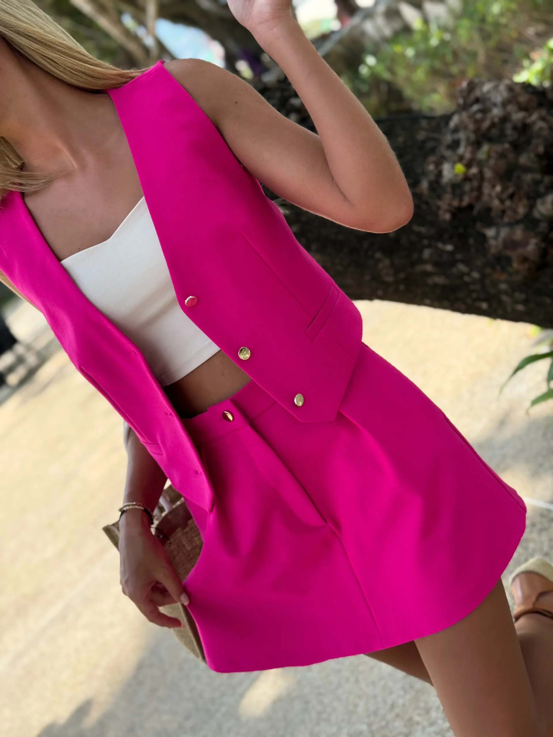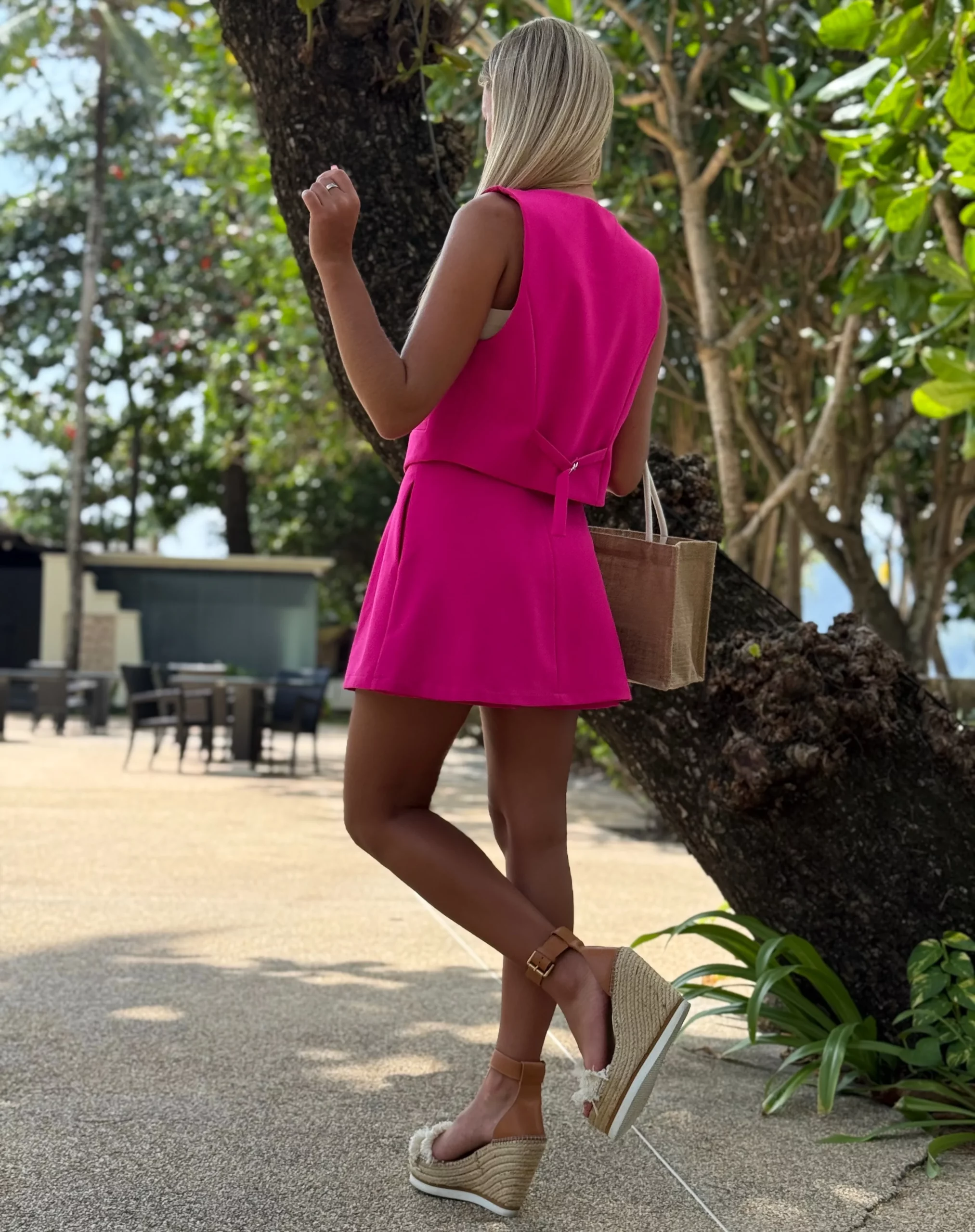 Kamizelka zapinana na trzy guziki, z atrapami kieszeni i regulowanym paskiem z tyłu, została wykończona podszewką dla większego komfortu. W zestawie znajdują się spódnico-spodenki z ozdobnymi zaszewkami, zapinane na guzik i zamek.