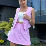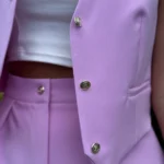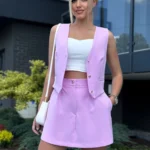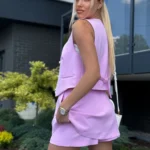 Kamizelka zapinana na trzy guziki, z atrapami kieszeni i regulowanym paskiem z tyłu, została wykończona podszewką dla większego komfortu. W zestawie znajdują się spódnico-spodenki z ozdobnymi zaszewkami, zapinane na guzik i zamek.