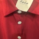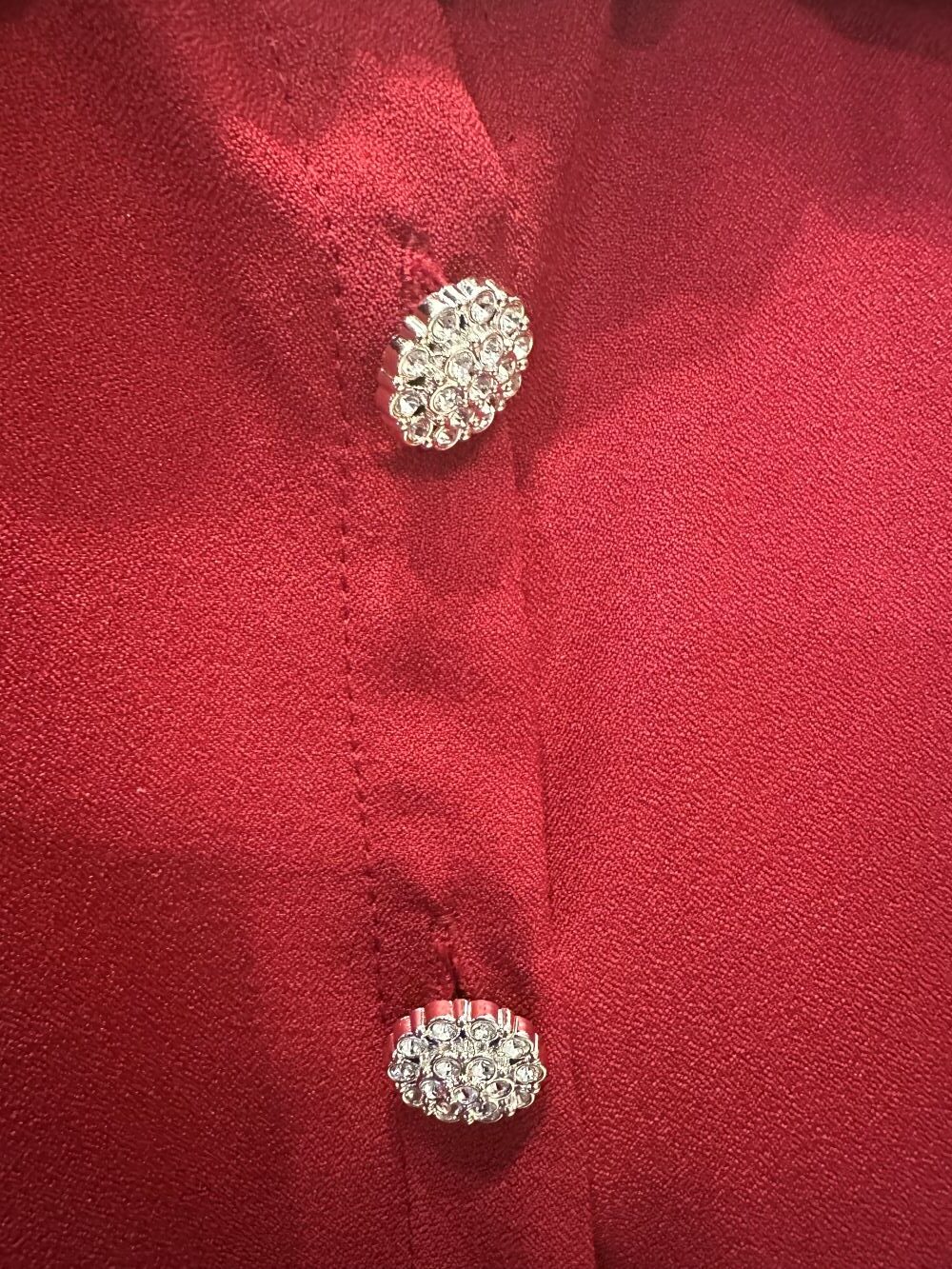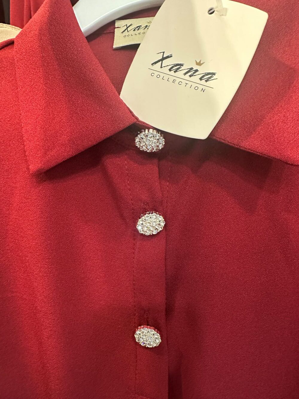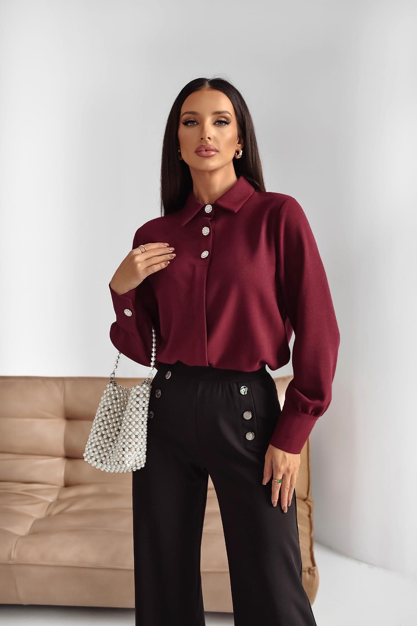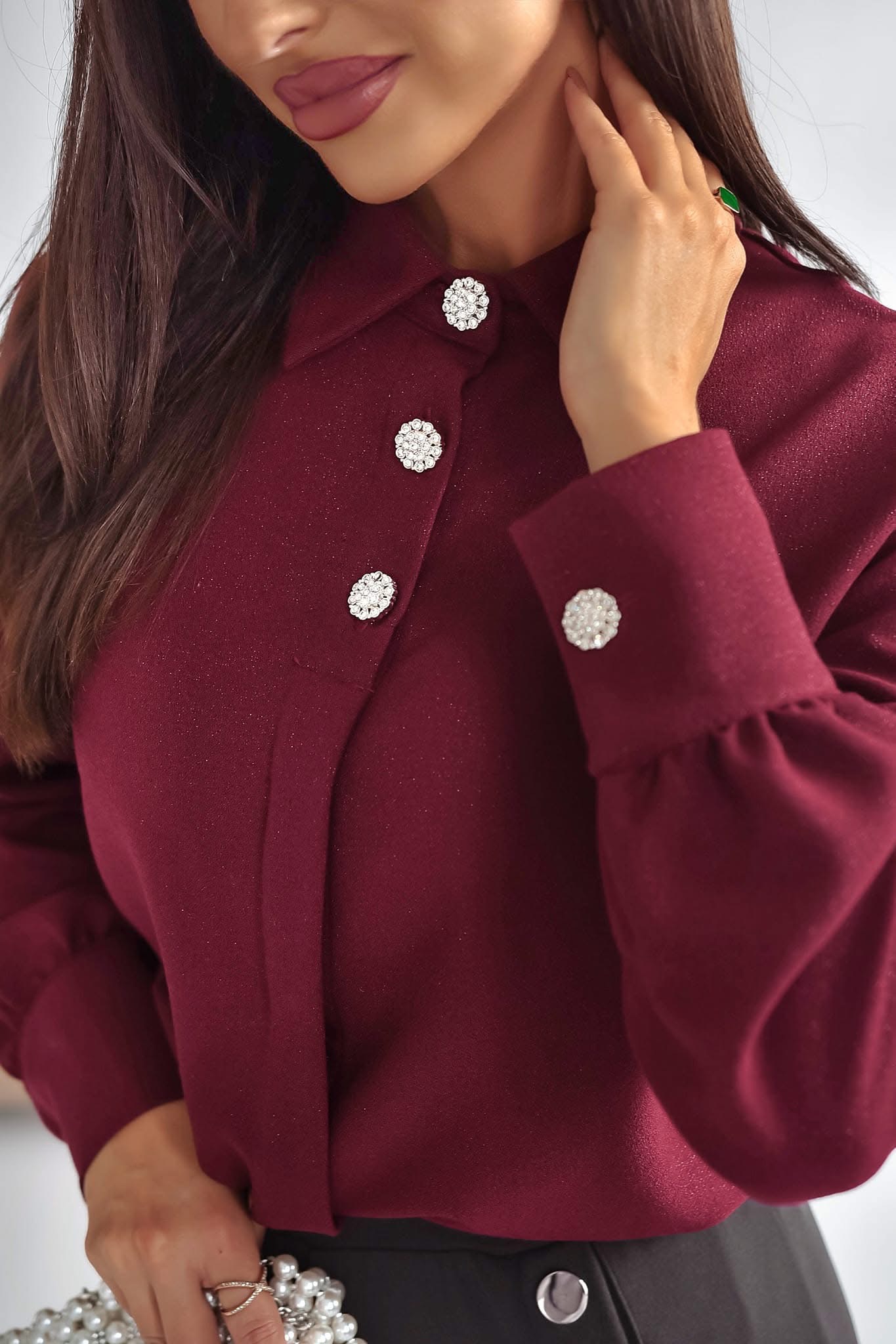 Koszula z kołnierzykiem o prostym kroju łączy elegancję z wygodą. Zapinana na trzy biżuteryjne guziki, które zdobią górną część, a pozostałe ukryte są pod listwą maskującą, nadając całości minimalistyczny wygląd. Mankiety wykończone tym samym ozdobnym guzikiem podkreślają dopracowany styl modelu.