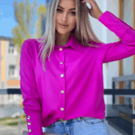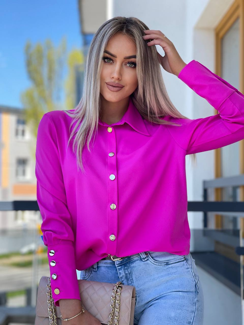 Koszula MARINA to elegancki model o prostym kroju, zapinany na złote guziki. Długie rękawy zakończone mankietami ze złotym wykończeniem dodają jej szyku. Wykonana z wysokiej jakości, niemnącego materiału, gwarantuje komfort noszenia. Kolor pozostaje intensywny nawet po wielokrotnym praniu.