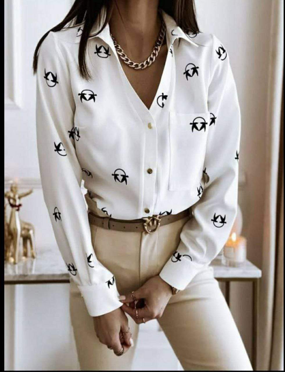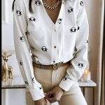 Koszula JASKÓŁKI kolor biały z czarnymi wzorami, długi rękaw, krój przylegający do ciała, obudowa ma kieszonkę oraz jest zapinana na guziki koloru złotego SKŁAD