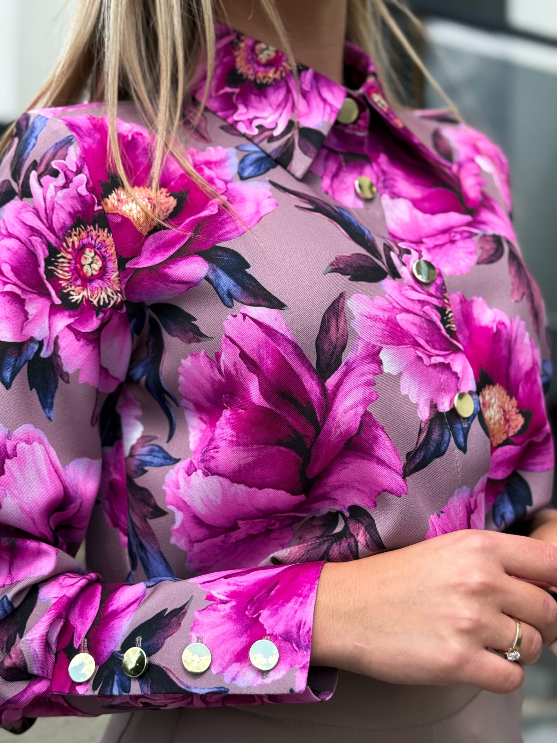 Koszula MARINA to elegancki model o prostym kroju, zapinany na złote guziki. Długie rękawy zakończone mankietami ze złotym wykończeniem dodają jej szyku. Wykonana z wysokiej jakości, niemnącego materiału, gwarantuje komfort noszenia. Kolor pozostaje intensywny nawet po wielokrotnym praniu.