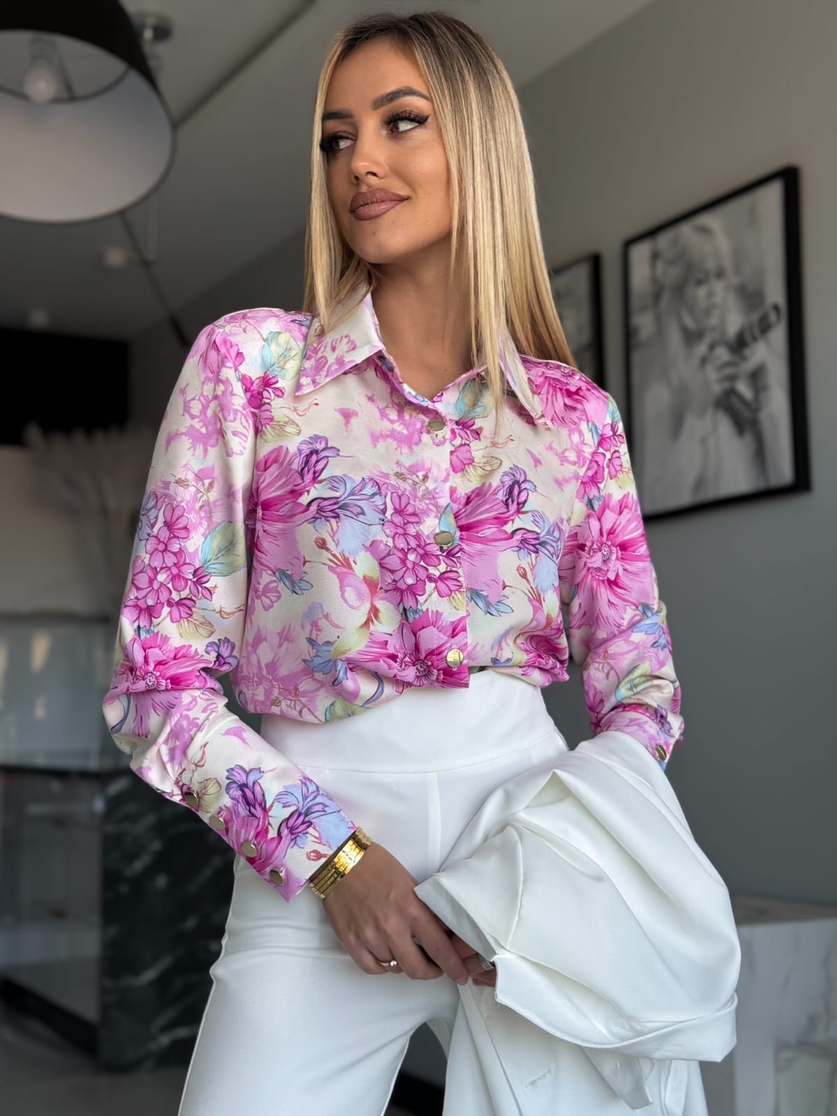 Koszula MARINA to elegancki model o prostym kroju, zapinany na złote guziki. Długie rękawy zakończone mankietami ze złotym wykończeniem dodają jej szyku. Wykonana z wysokiej jakości, niemnącego materiału, gwarantuje komfort noszenia. Kolor pozostaje intensywny nawet po wielokrotnym praniu.