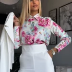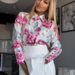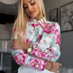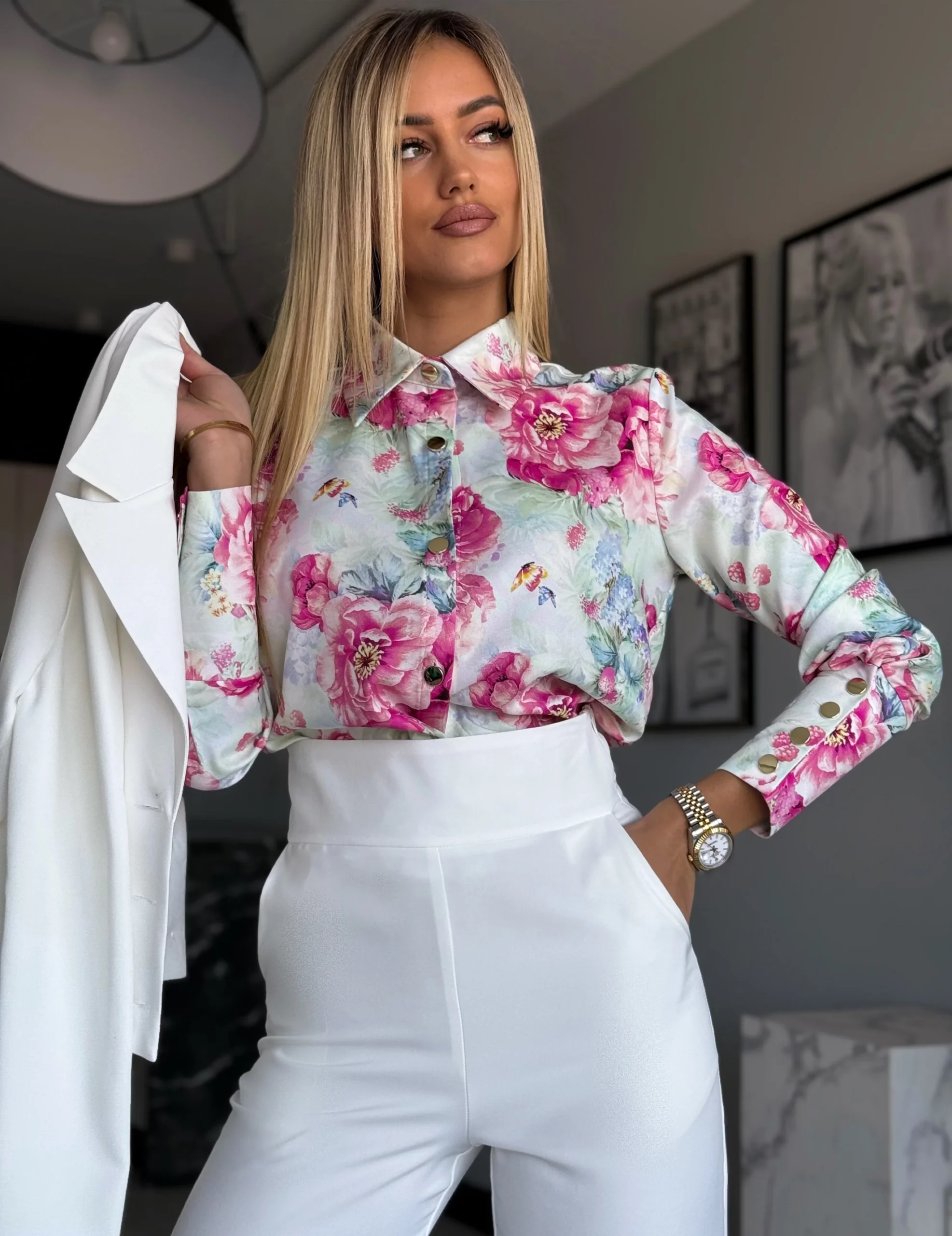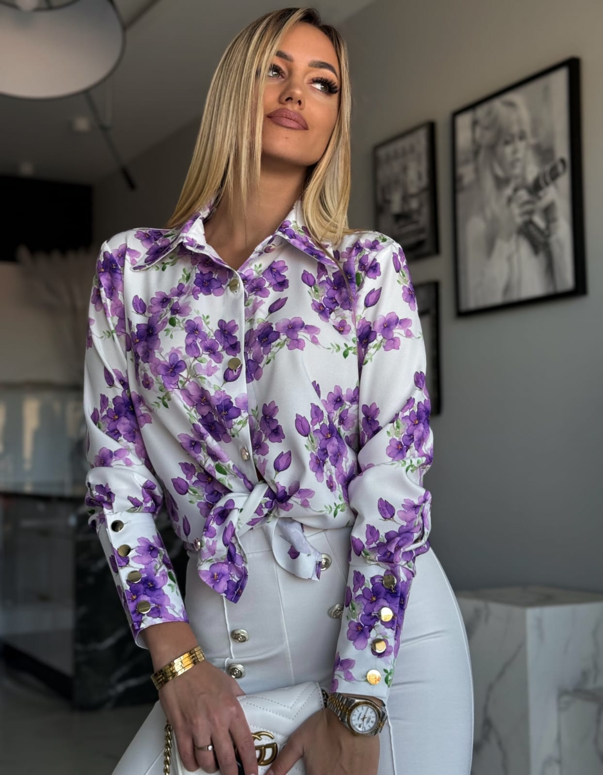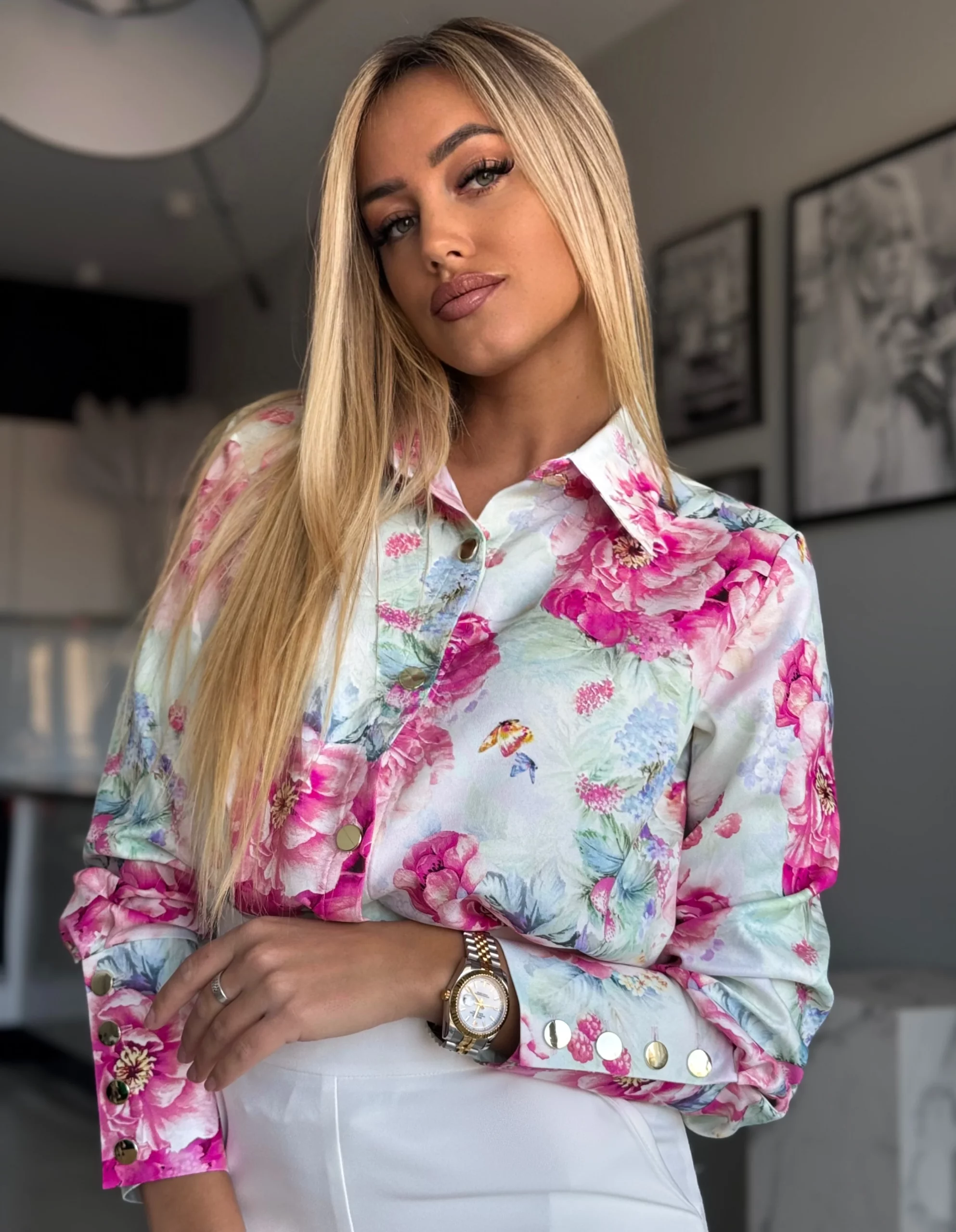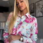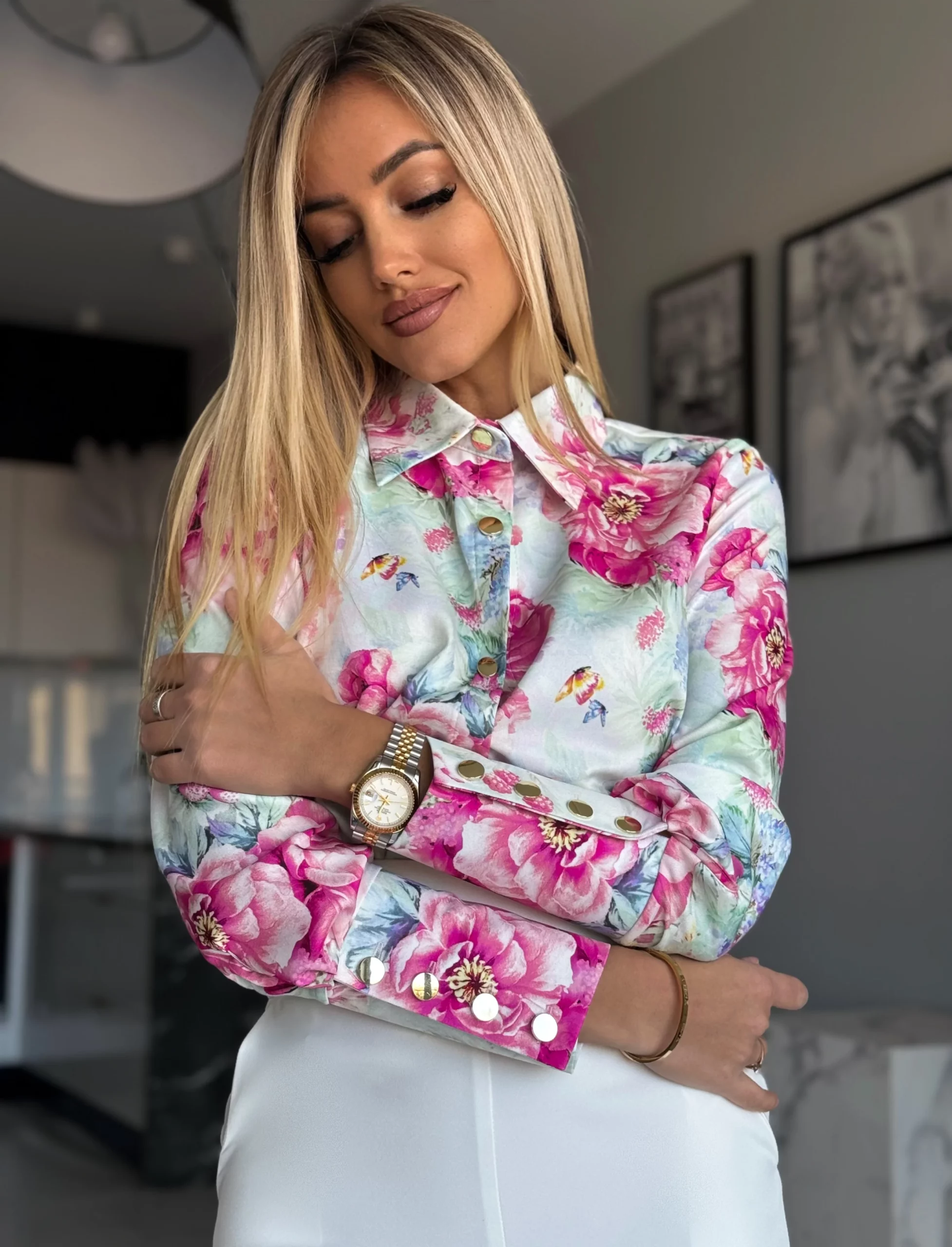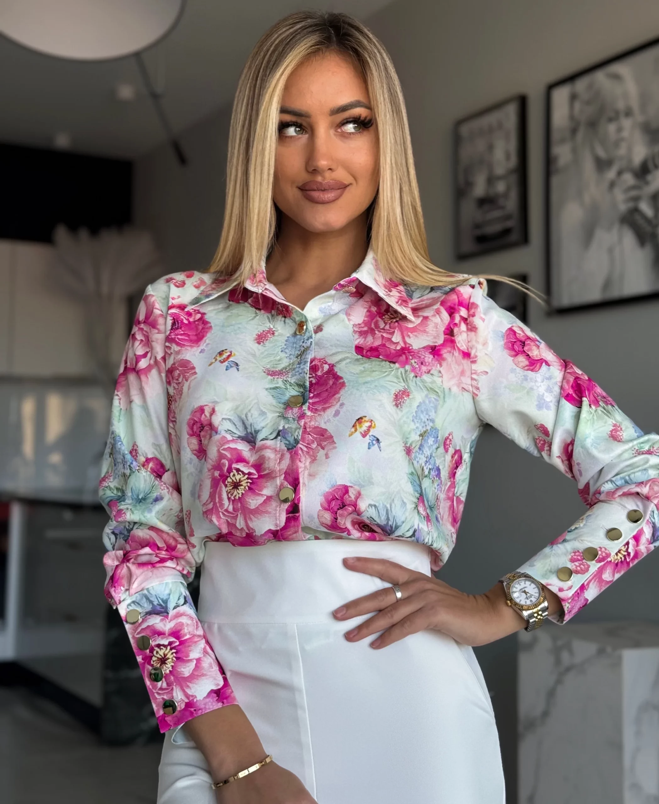 Koszula MARINA to elegancki model o prostym kroju, zapinany na złote guziki. Długie rękawy zakończone mankietami ze złotym wykończeniem dodają jej szyku. Wykonana z wysokiej jakości, niemnącego materiału, gwarantuje komfort noszenia. Kolor pozostaje intensywny nawet po wielokrotnym praniu.