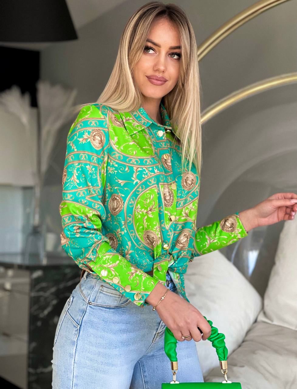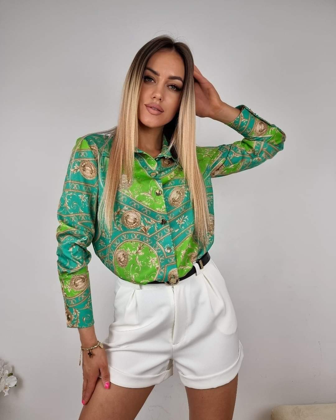 Koszula MARINA to elegancki model o prostym kroju, zapinany na złote guziki. Długie rękawy zakończone mankietami ze złotym wykończeniem dodają jej szyku. Wykonana z wysokiej jakości, niemnącego materiału, gwarantuje komfort noszenia. Kolor pozostaje intensywny nawet po wielokrotnym praniu.