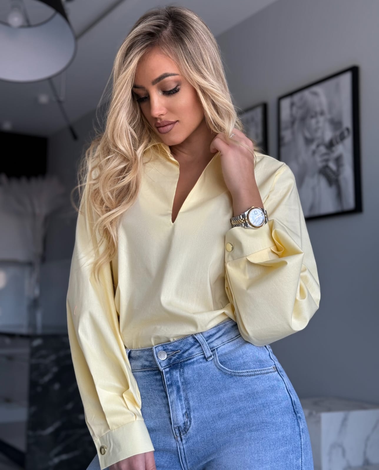 Elegancka koszula bawełniana z bufiastym rękawem to uniwersalny model, który dopełni wiele stylizacji. Klasyczny krój z dekoltem w kształcie litery V, kołnierzykiem i mankietami zapinanymi na ozdobne guziki dodaje jej szyku.