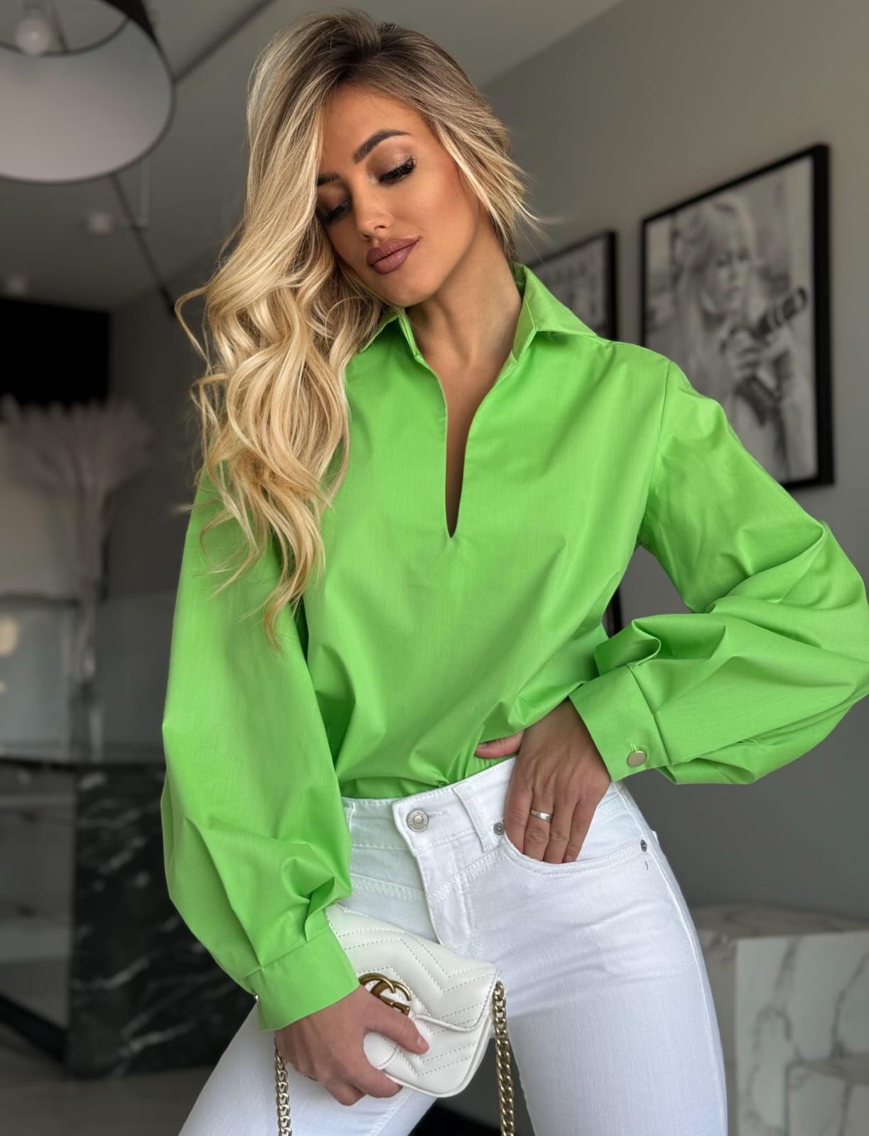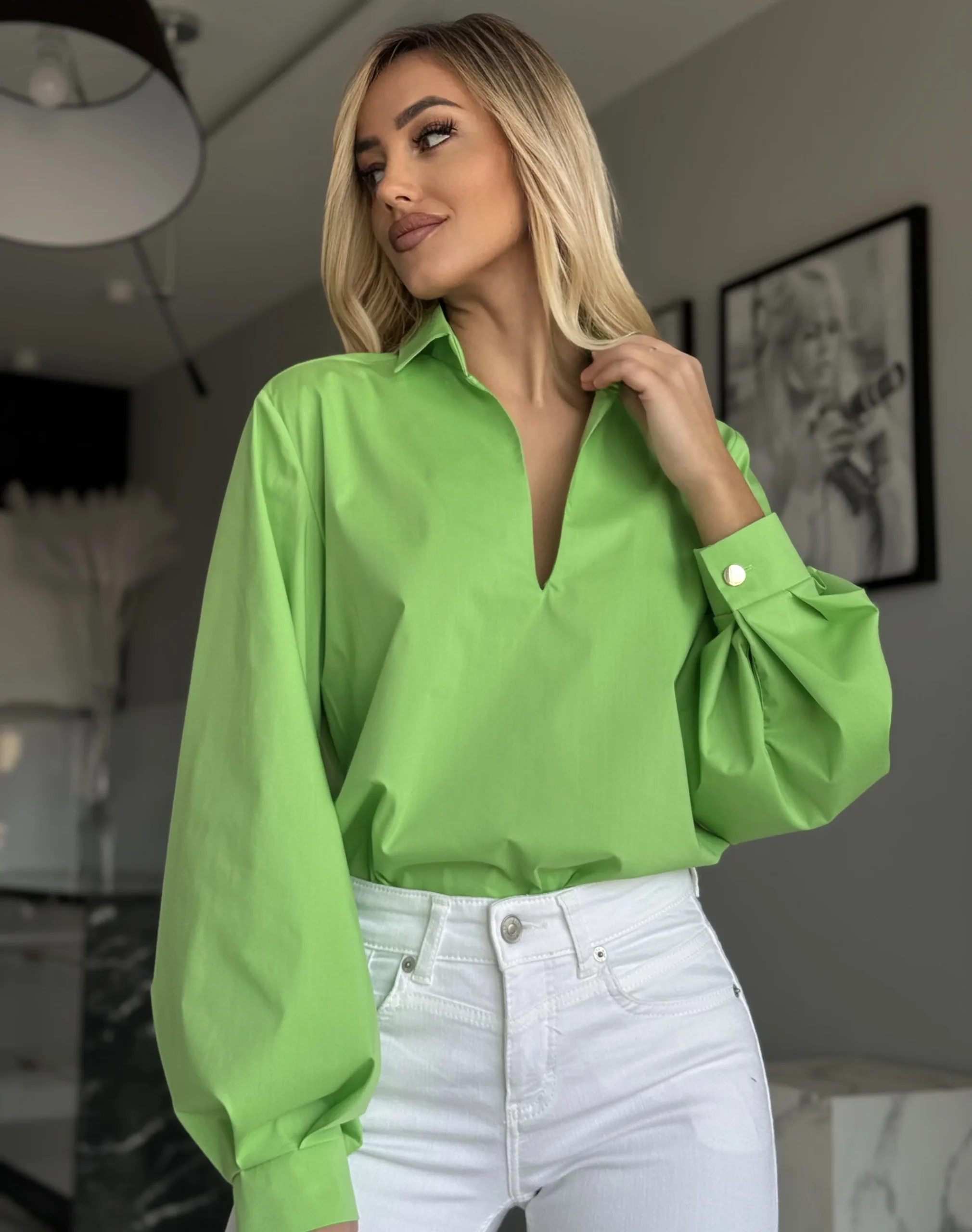 Elegancka koszula bawełniana z bufiastym rękawem to uniwersalny model, który dopełni wiele stylizacji. Klasyczny krój z dekoltem w kształcie litery V, kołnierzykiem i mankietami zapinanymi na ozdobne guziki dodaje jej szyku.