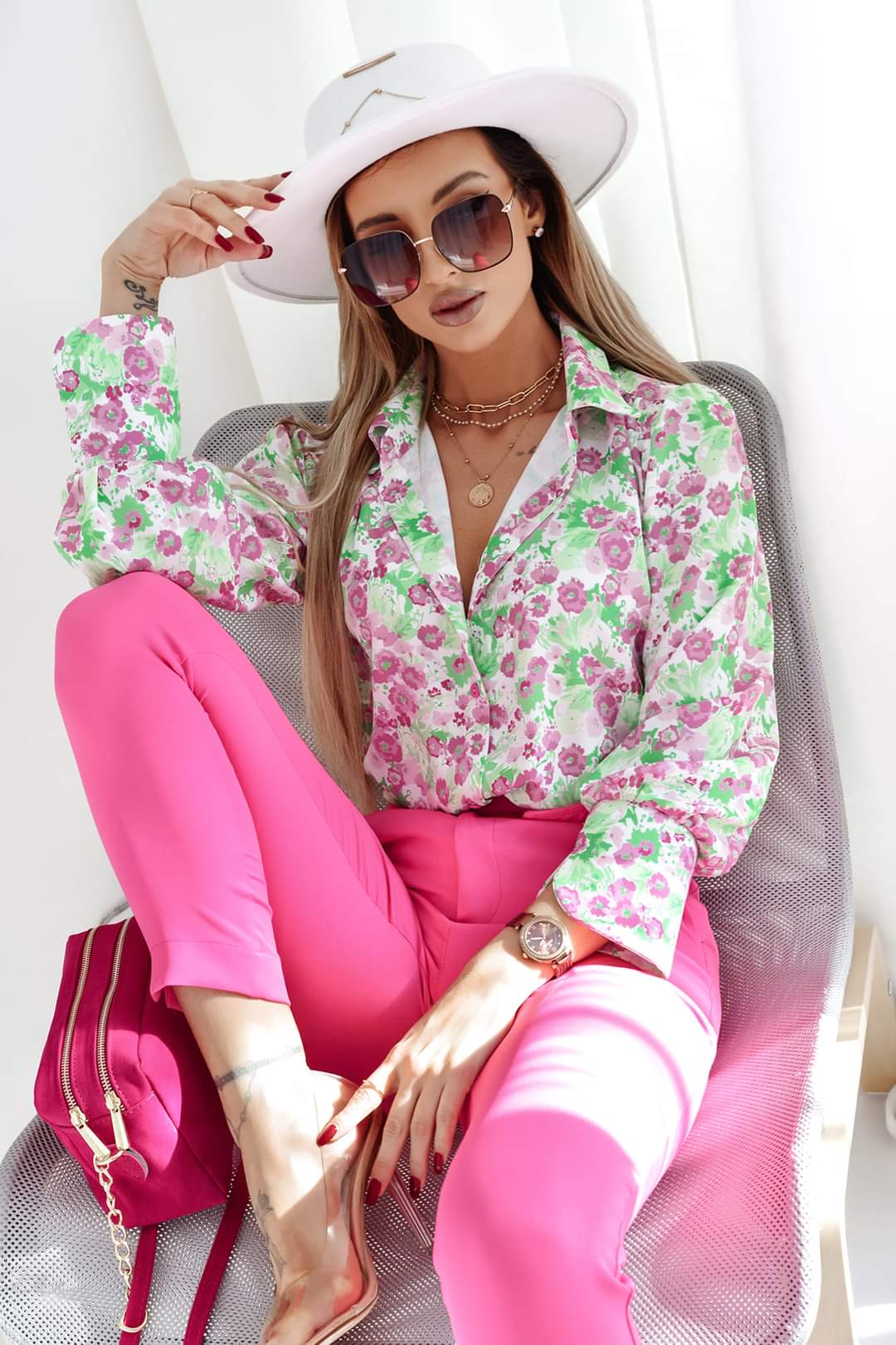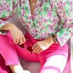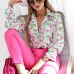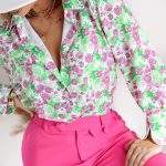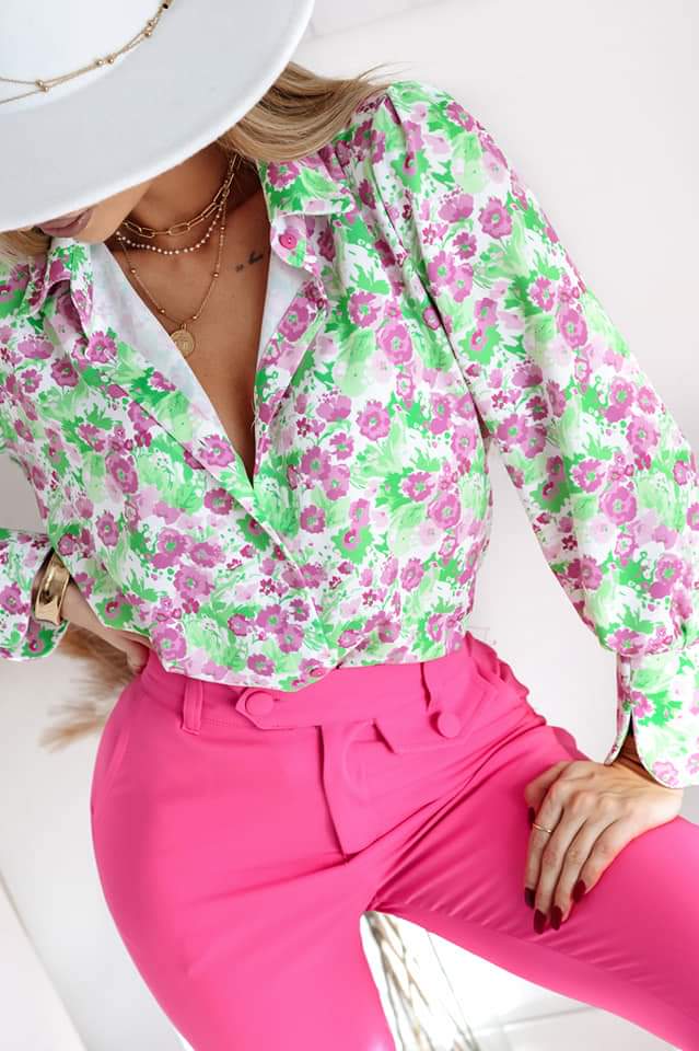 Koszula ROXI, w różowe kwiaty i zielone liście, z kołnierzykiem, długi rękaw, rękawy zakończone mankietem zapinanym na trzy guziki. Klasyczny, prosty krój koszuli świetnie sprawdzi się w połączeniu z jeansami, eleganckimi spodniami, spódnico-szortami, a także spódnicami. Koszula, lekka, zwiewna, miła w dotyku, uszyta z wysokiej jakości wiskozy. Jakość premium.