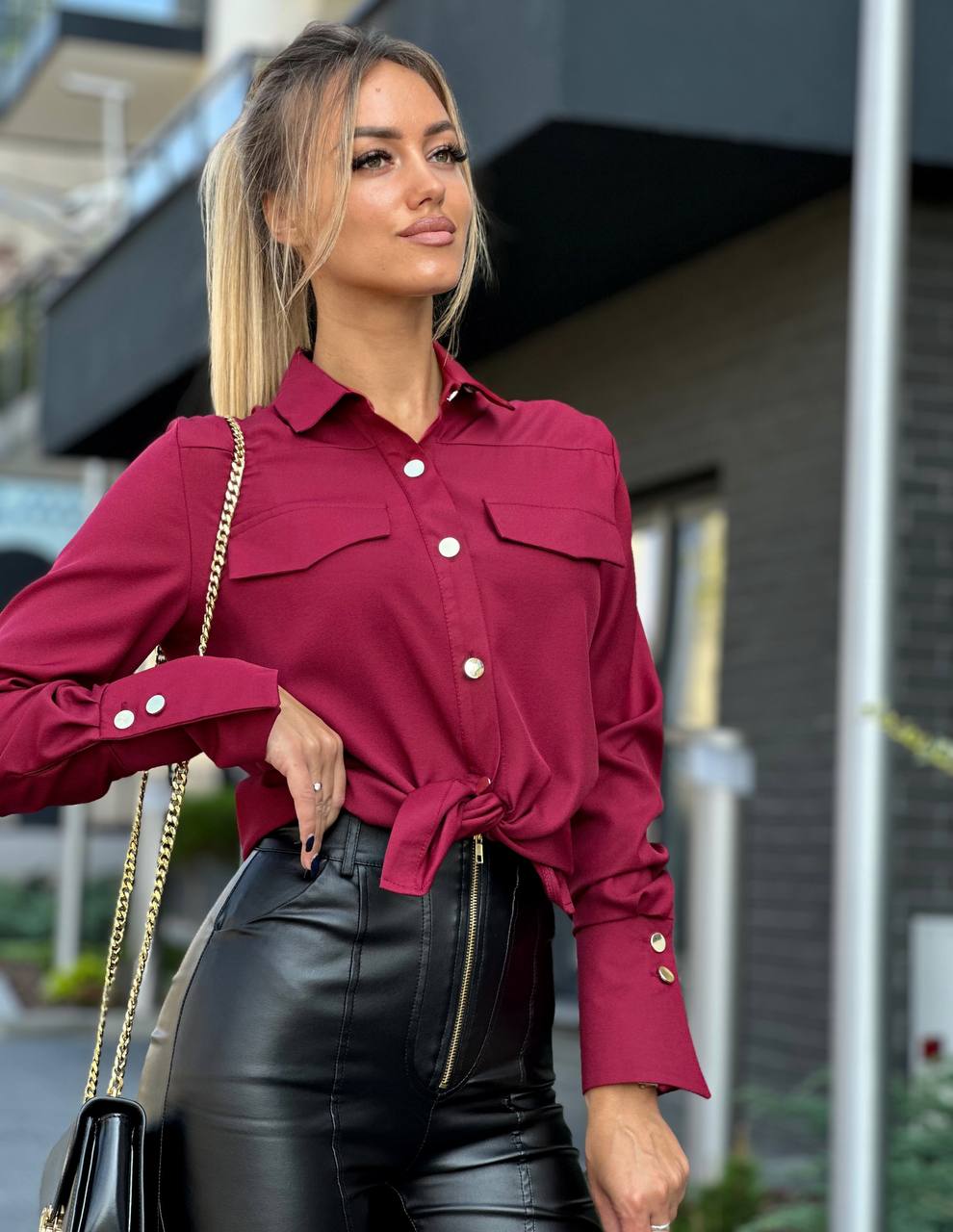 Koszula MARINA to elegancki model o prostym kroju, zapinany na złote guziki. Długie rękawy zakończone mankietami ze złotym wykończeniem dodają jej szyku. Wykonana z wysokiej jakości, niemnącego materiału, gwarantuje komfort noszenia. Kolor pozostaje intensywny nawet po wielokrotnym praniu.