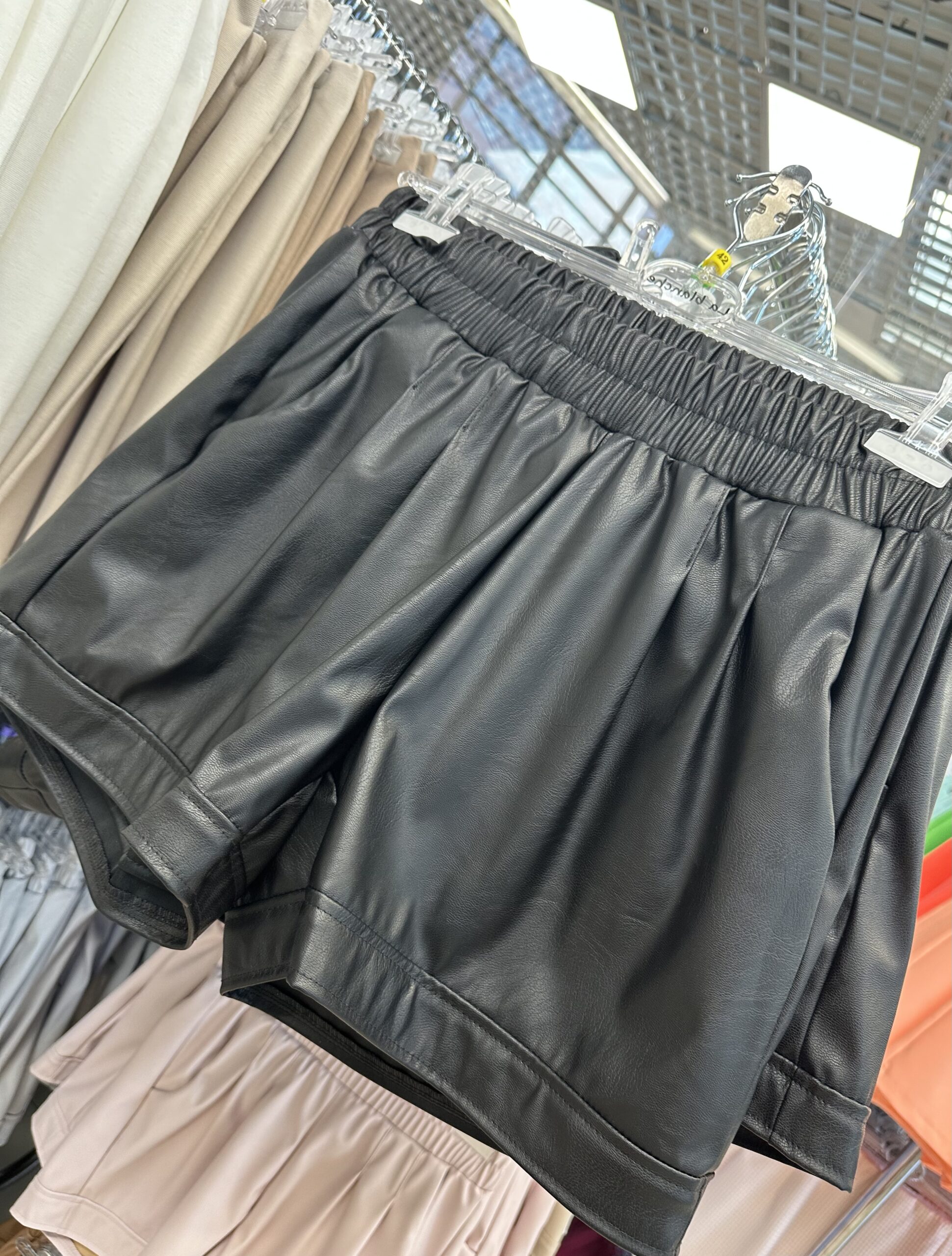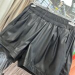 Krótkie szorty EKO, kolor czarny, krój dopasowany, uszyte z miękkiej eko skóry, miłej w dotyku, wyższe w stanie, w pasie posiadają szeroki ściągacz gumkowy oraz kieszenie po lewej i prawej stronie. Nogawki obszyte mankietami. Bardzo wygodny i elegancki model szortów. Świetny do t-shirtów, koszul, sweterków, żakietów.