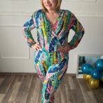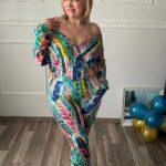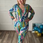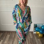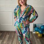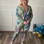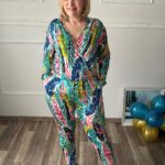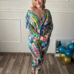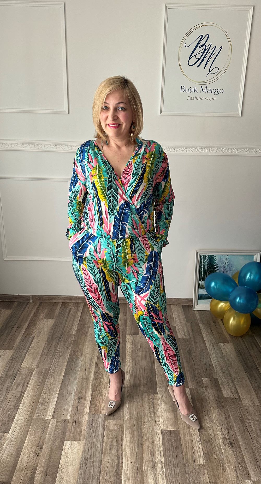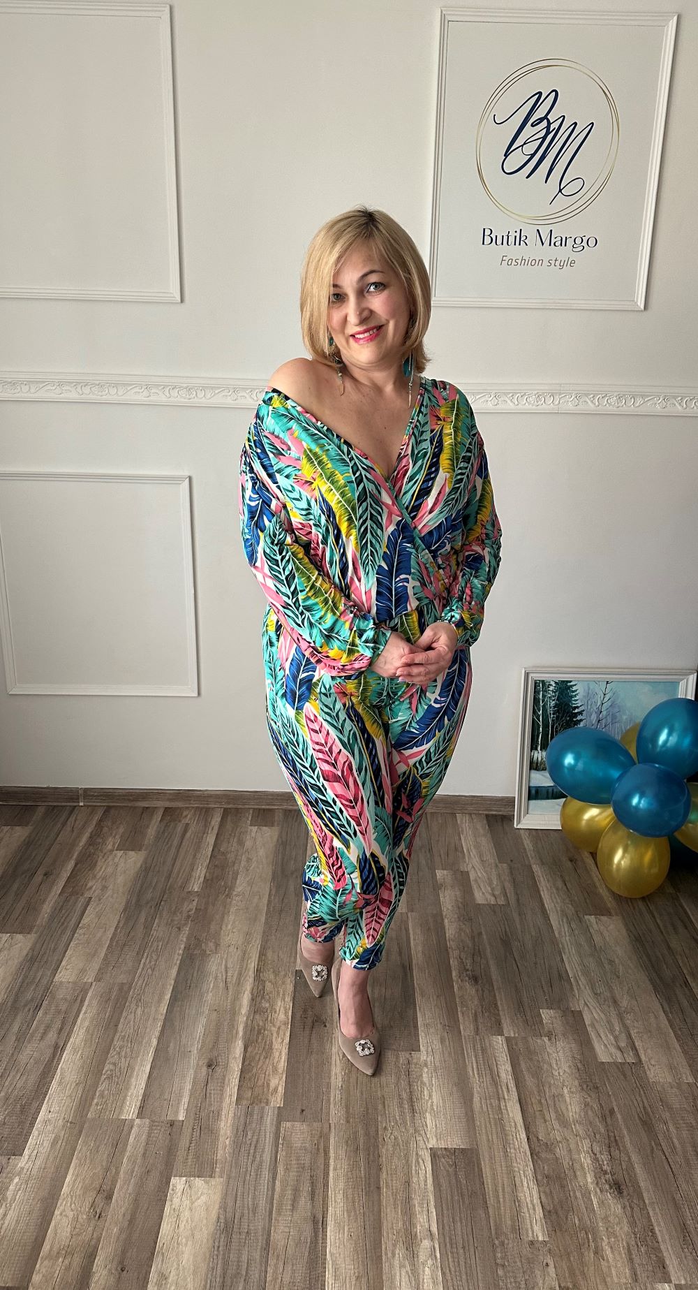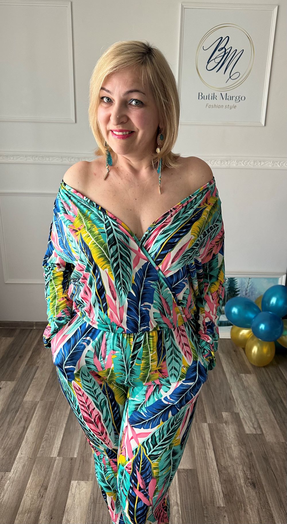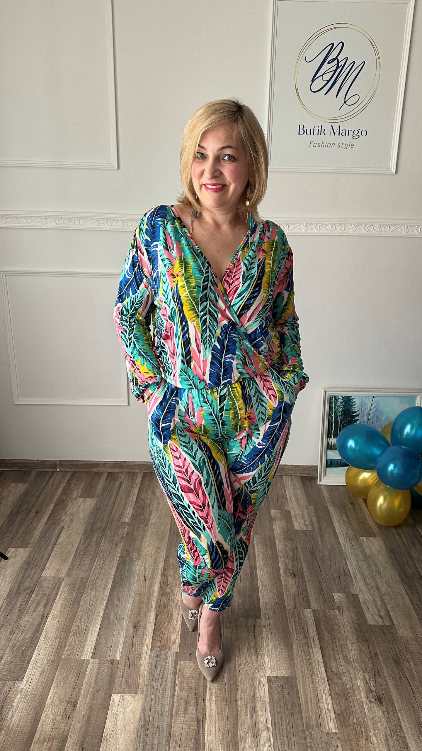 Kombinezon DORIS, elastyczny kombinezon z długim rękawem, uszyty z chłodzącego materiału, print: kolorowe piórka, w pasie posiada ściągacz gumkowy. Dekolt jest w kształcie litery V z przodu oraz z tyłu z możliwością opadania na jedno ramię. Kombinezon jest z długimi nogawkami, posiada kieszenie, jest w kolorze miętowo-granatowo-różowym. Spodnie mają wąskie nogawki. W tym kombinezonie będziesz wyglądać olśniewająco. Model ten zachwyci każdą z Was. Idealnie maskuje brzuszek i bioderka. Przyda się Wam również na wakacje, w ciepłe kraje. Oryginalnie zaprojektowany, a każdy szczegół starannie dopracowany. Jakość premium. Materiał niemnący. Kombinezon przepięknie układa się na sylwetce. Zabłyśniesz w nim na niejednej firmowej imprezie, weselu, urodzinach.