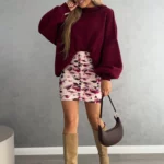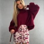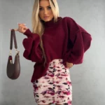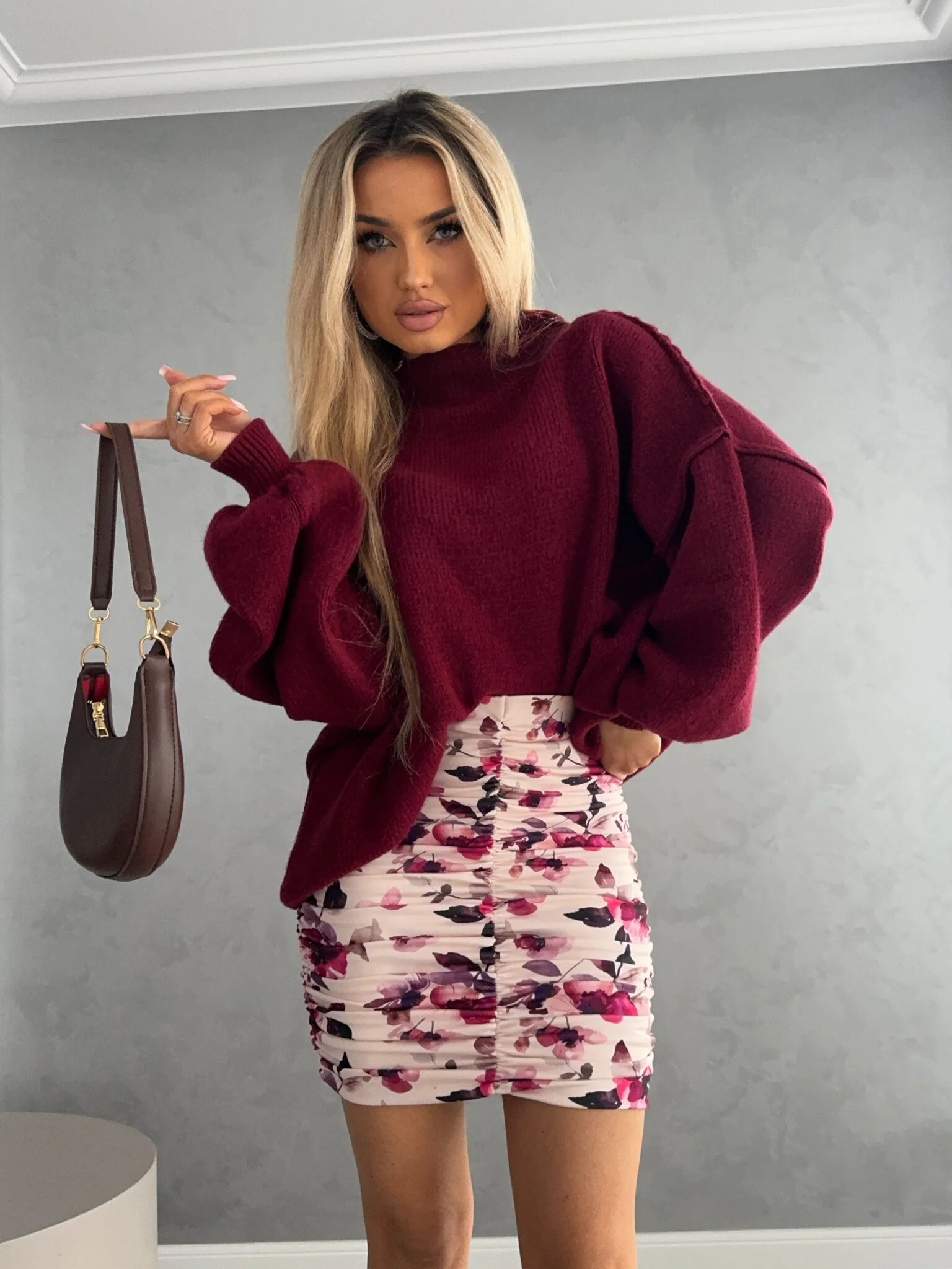Spódnica marszczona print kwiaty – beżowo – bordowa