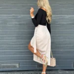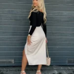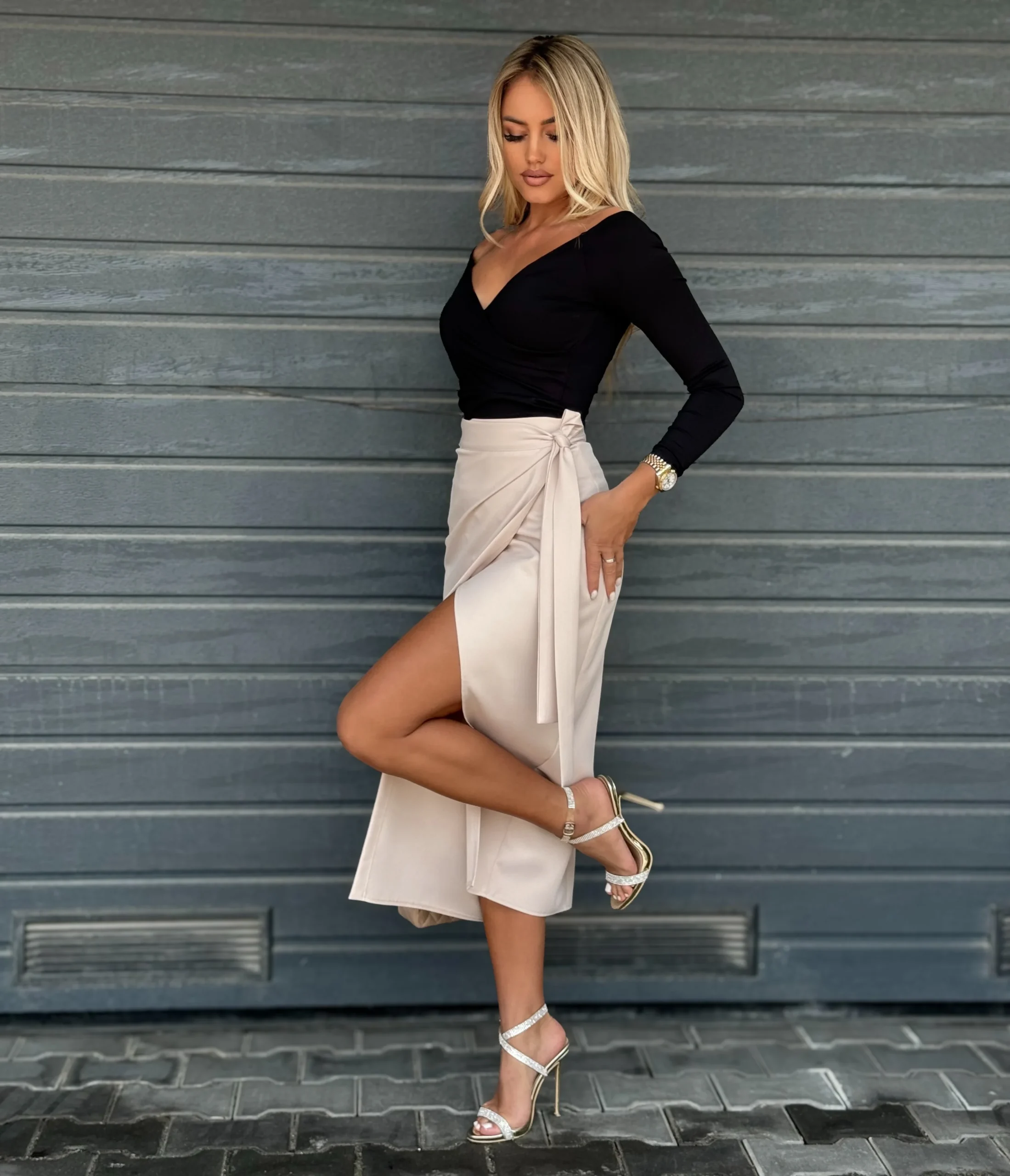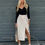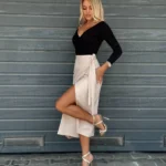 Spódnica midi o przekładanym fasonie, wiązana na boku, z regulowanym pasem dla idealnego dopasowania. Wysoki stan i rozcięcie na nodze podkreślają kobiecą sylwetkę.
