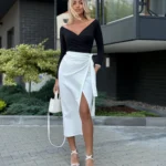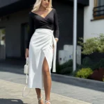 Spódnica midi o przekładanym fasonie, wiązana na boku, z regulowanym pasem dla idealnego dopasowania. Wysoki stan i rozcięcie na nodze podkreślają kobiecą sylwetkę.