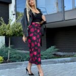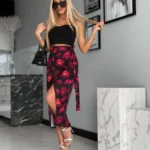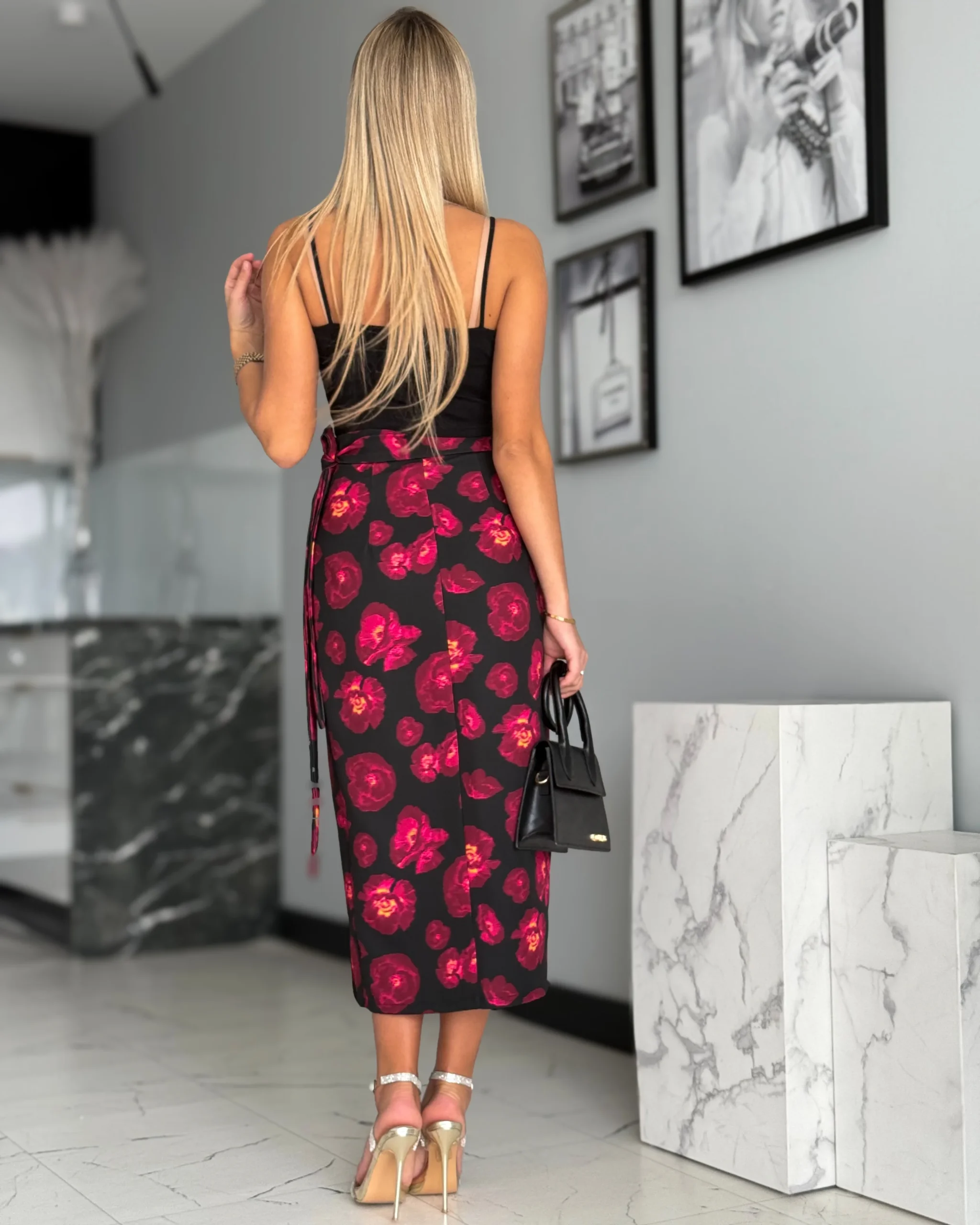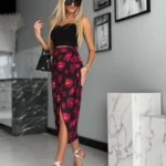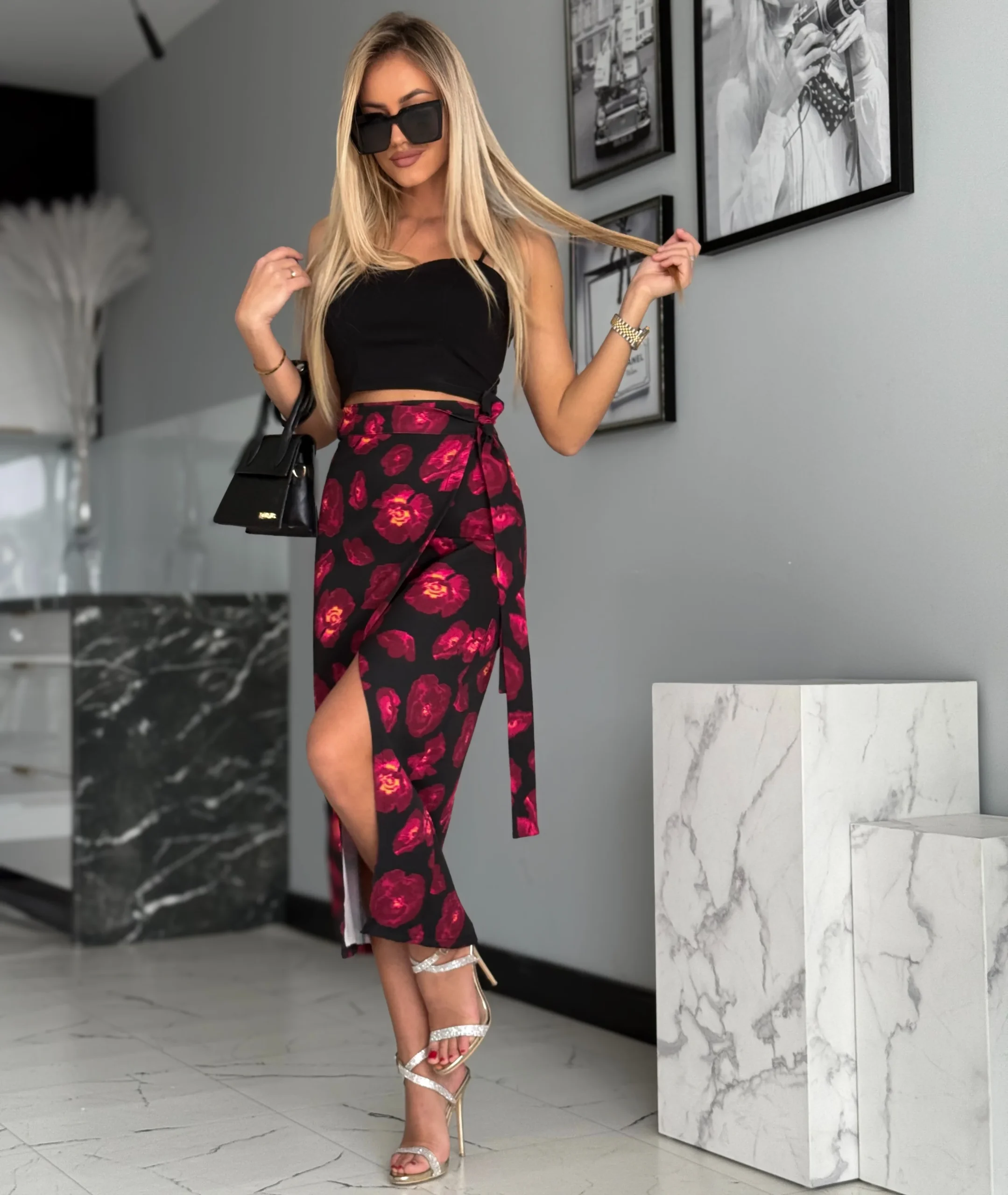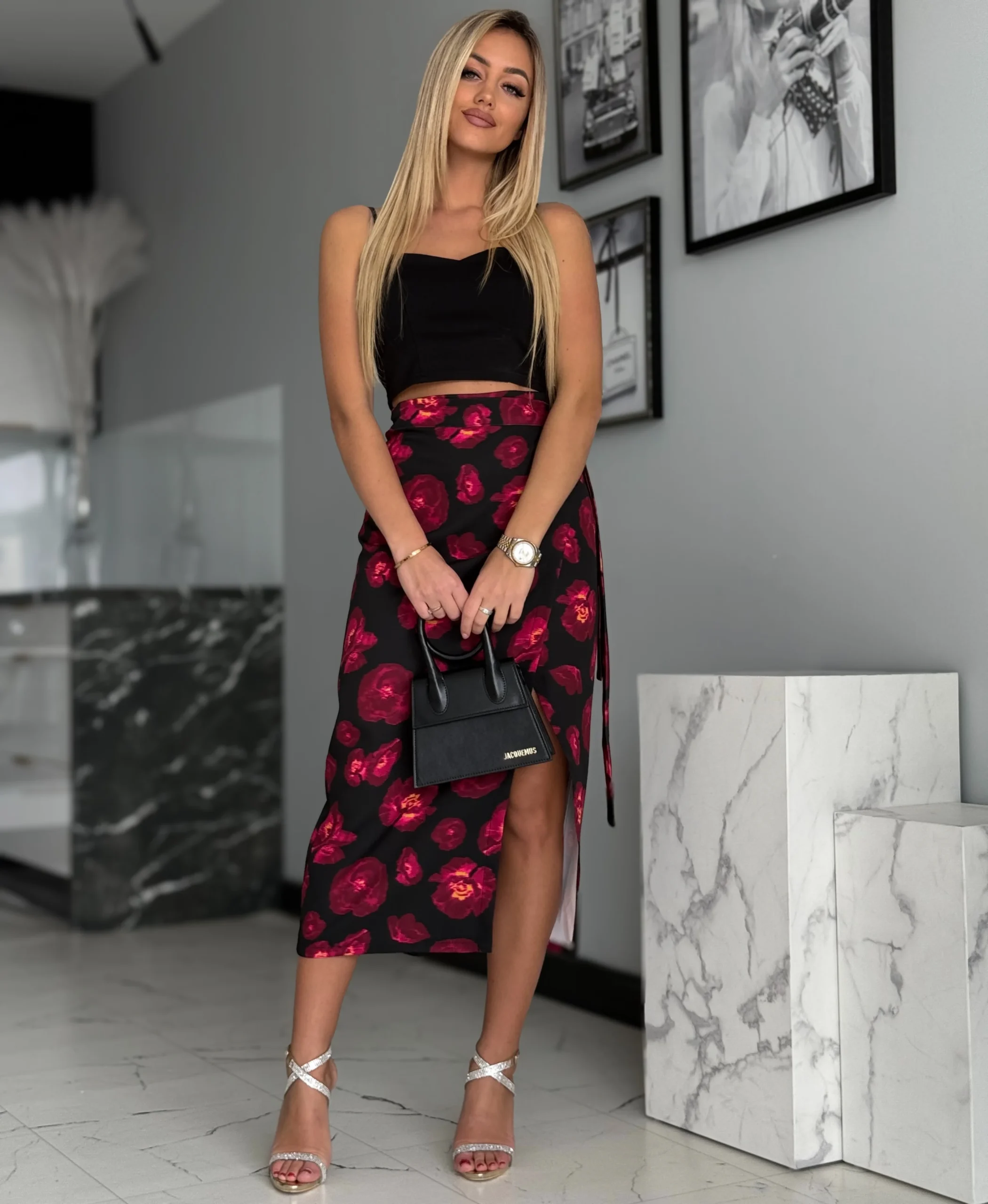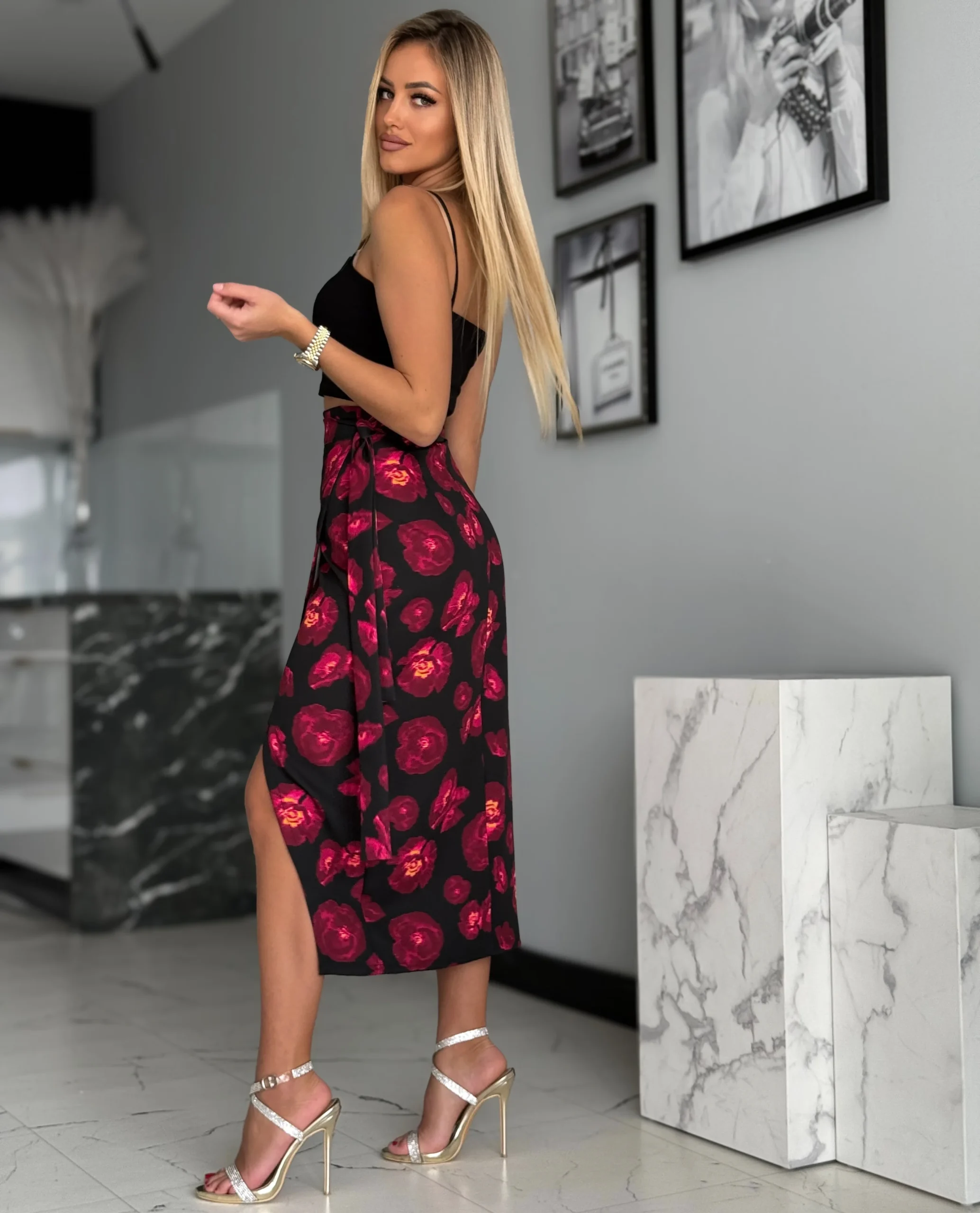 Spódnica midi o przekładanym fasonie, wiązana na boku, z regulowanym pasem dla idealnego dopasowania. Wysoki stan i rozcięcie na nodze podkreślają kobiecą sylwetkę.