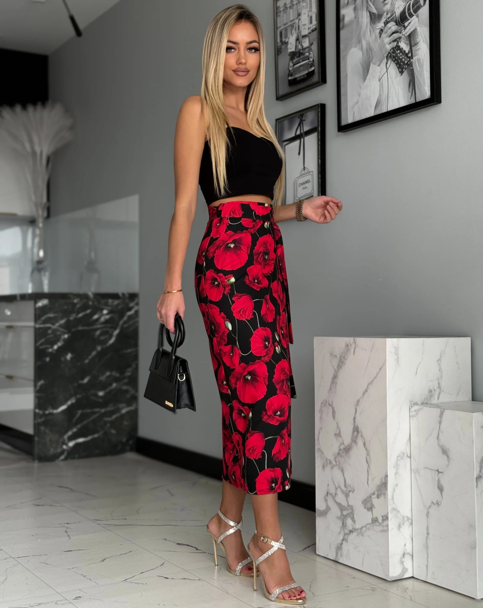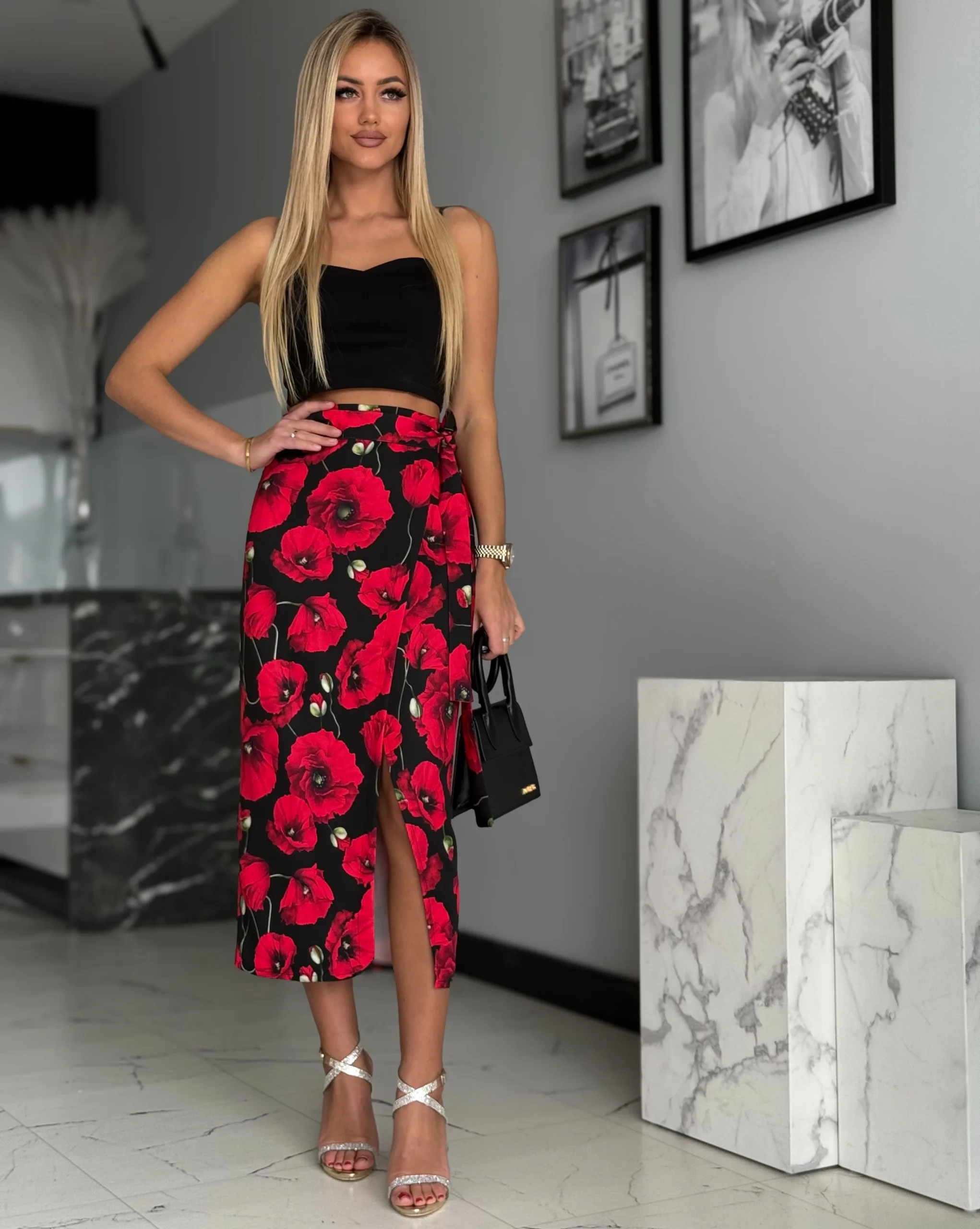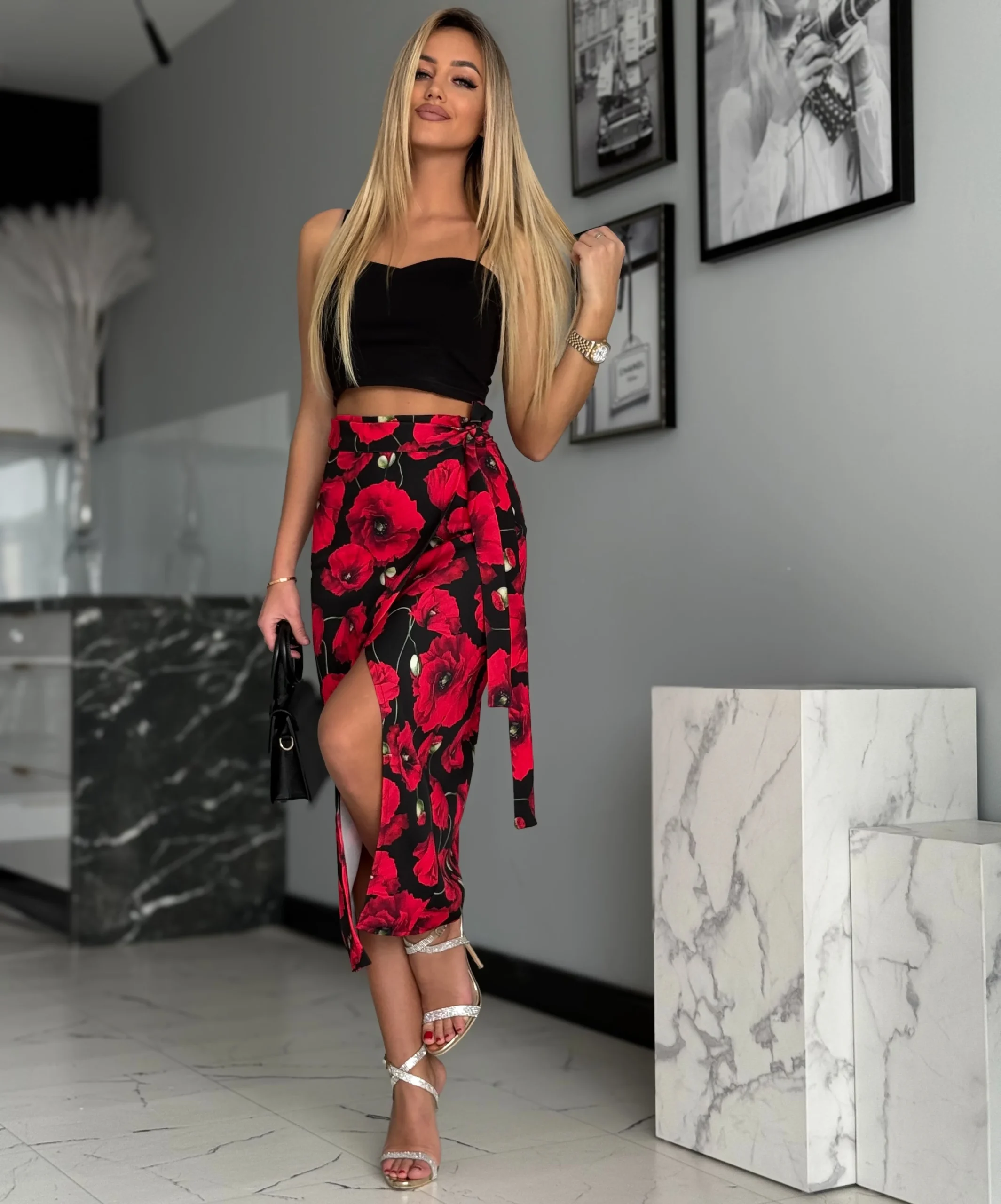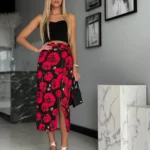 Spódnica midi o przekładanym fasonie, wiązana na boku, z regulowanym pasem dla idealnego dopasowania. Wysoki stan i rozcięcie na nodze podkreślają kobiecą sylwetkę.