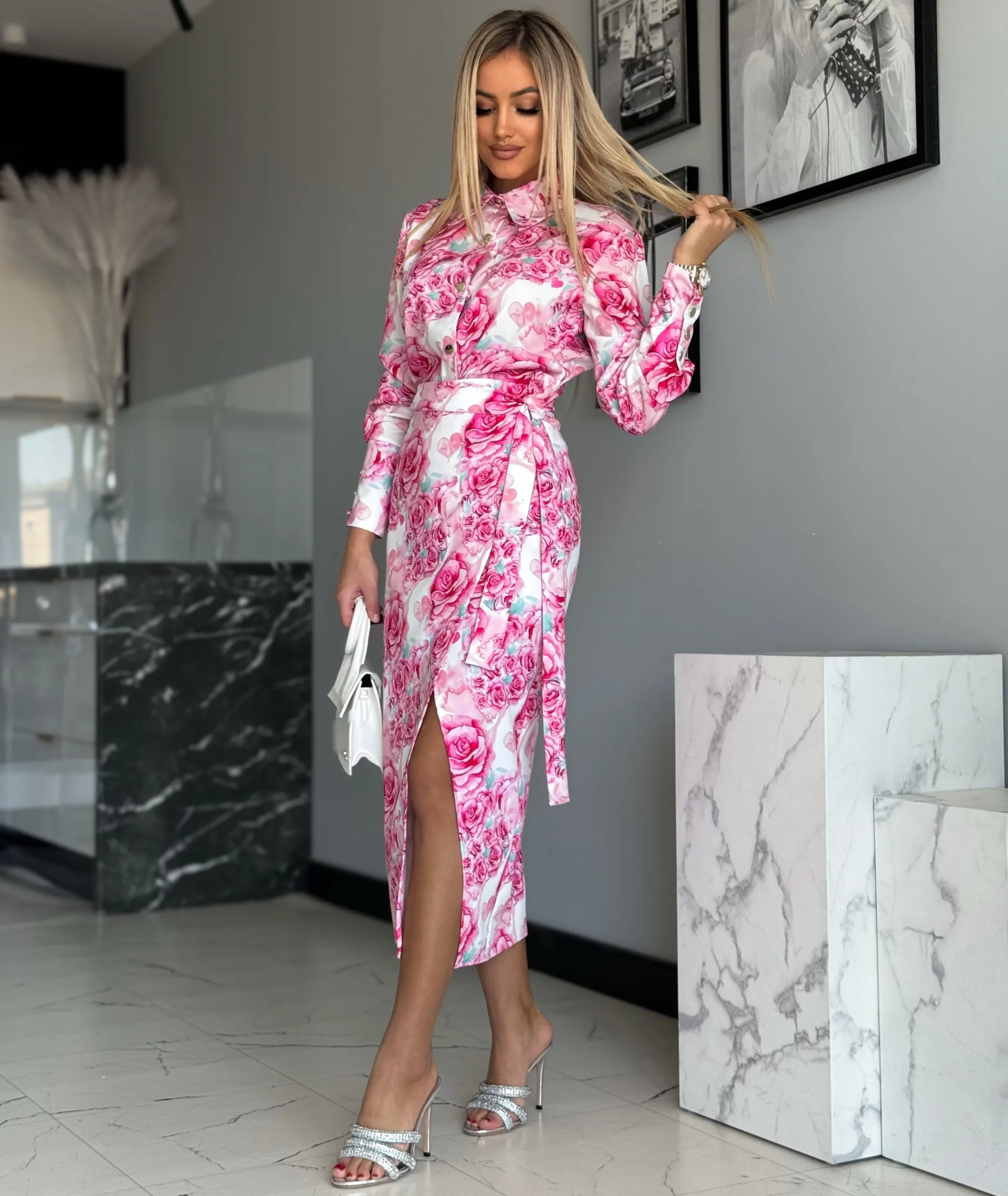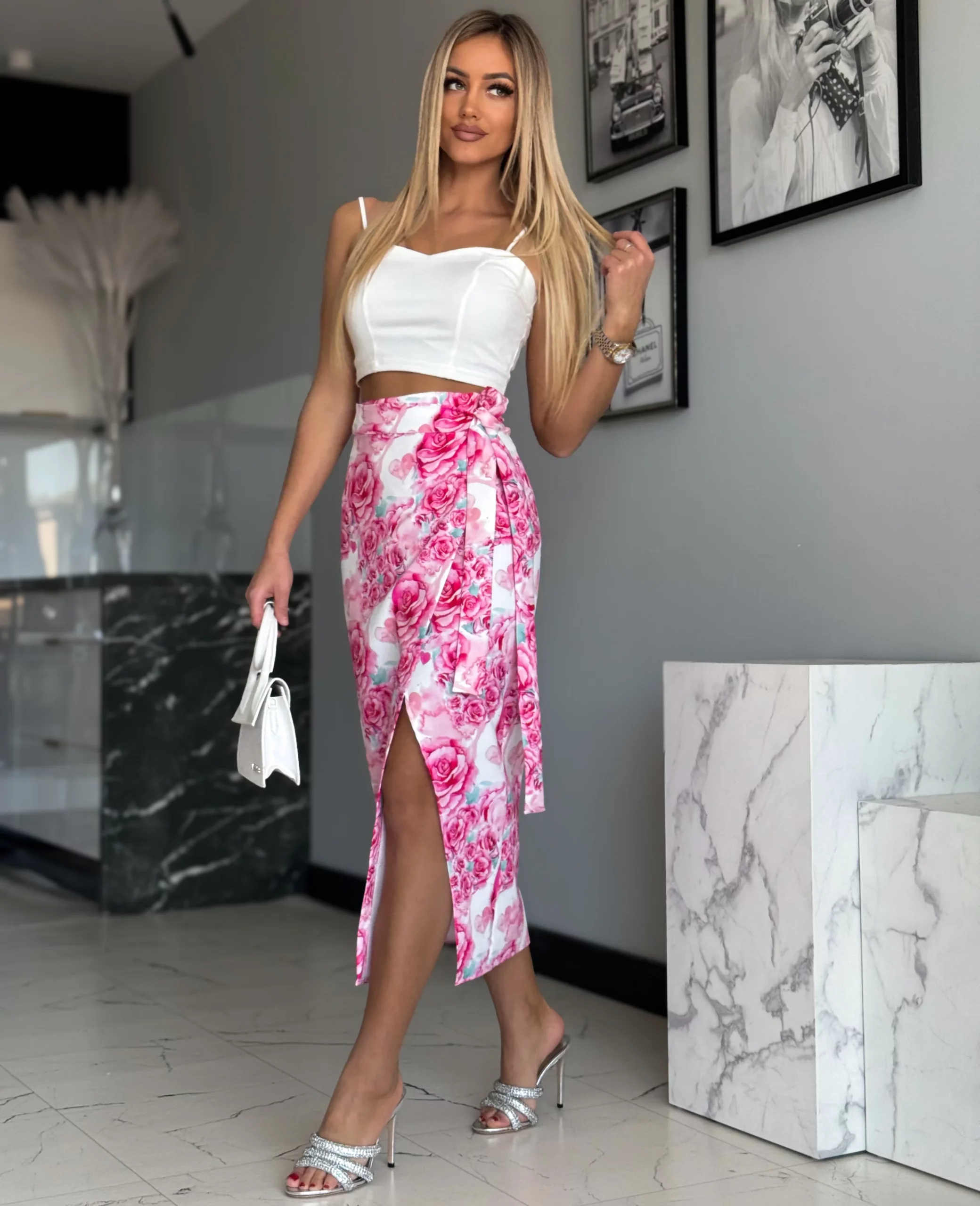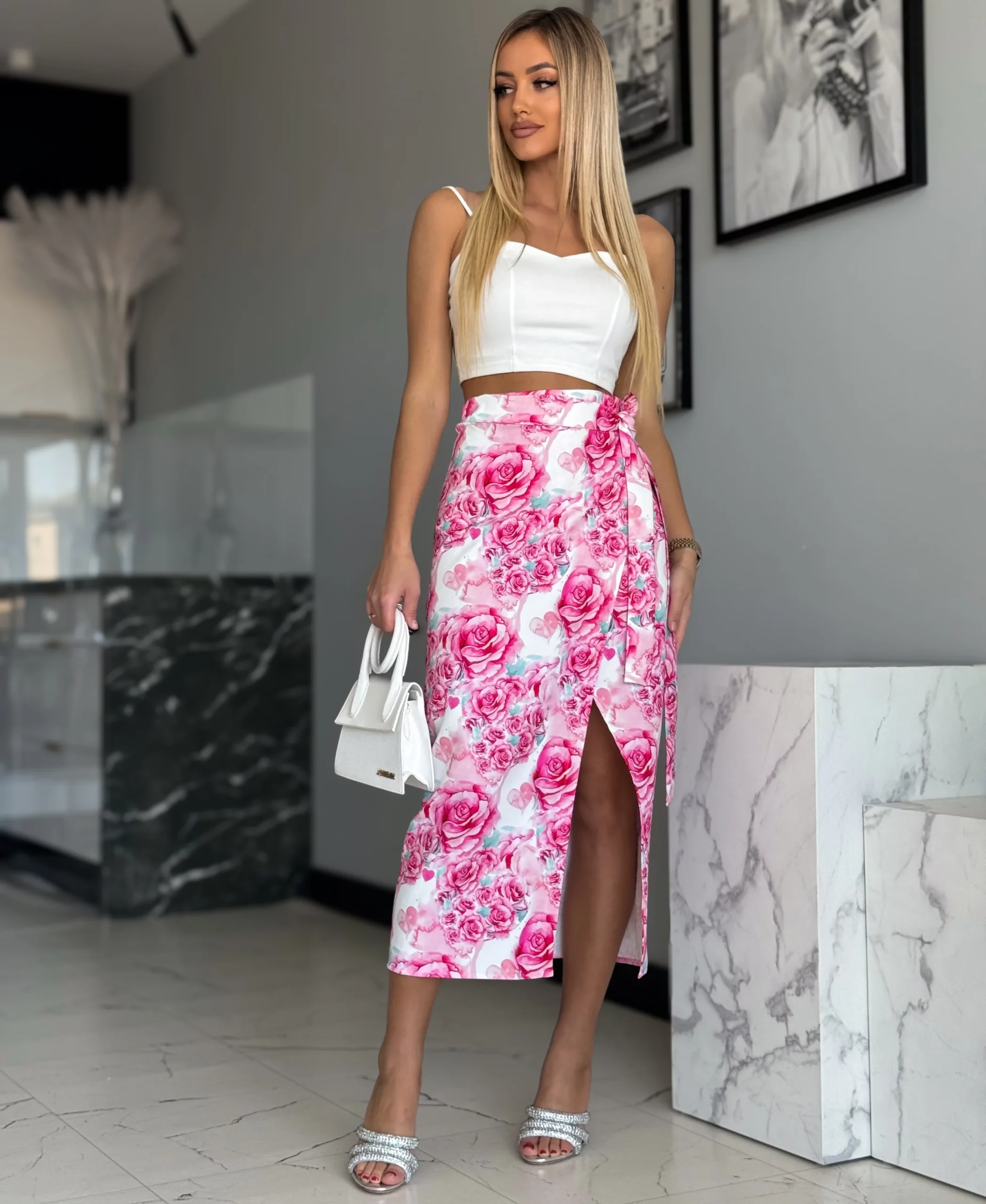 Spódnica midi o przekładanym fasonie, wiązana na boku, z regulowanym pasem dla idealnego dopasowania. Wysoki stan i rozcięcie na nodze podkreślają kobiecą sylwetkę.