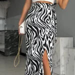Spódnica midi o przekładanym fasonie, wiązana na boku, z regulowanym pasem dla idealnego dopasowania. Wysoki stan i rozcięcie na nodze podkreślają kobiecą sylwetkę.