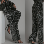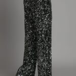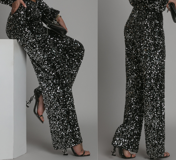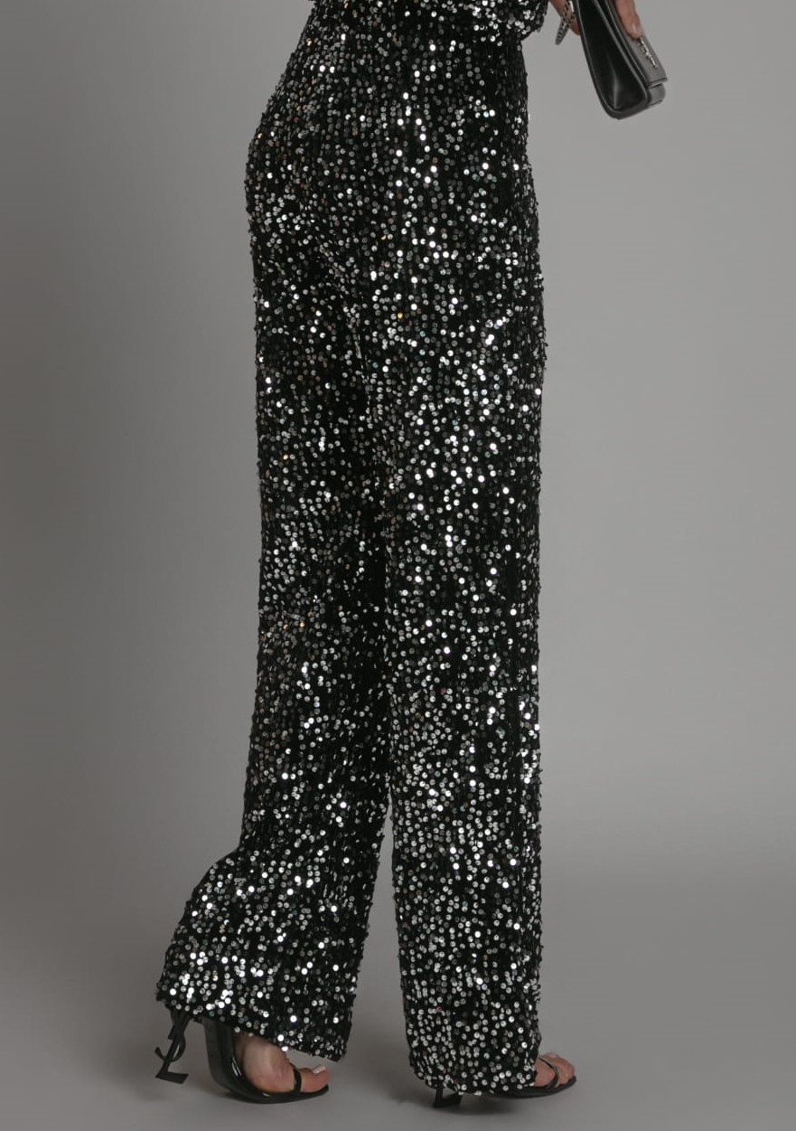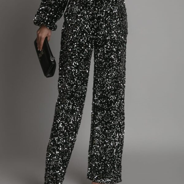 Eleganckie spodnie typu wide-leg zachwycają połyskiem drobnych srebrnych cekinów, które pięknie odbijają światło. Dopasowany w talii fason podkreśla sylwetkę, a długie, szerokie nogawki dodają lekkości i elegancji.