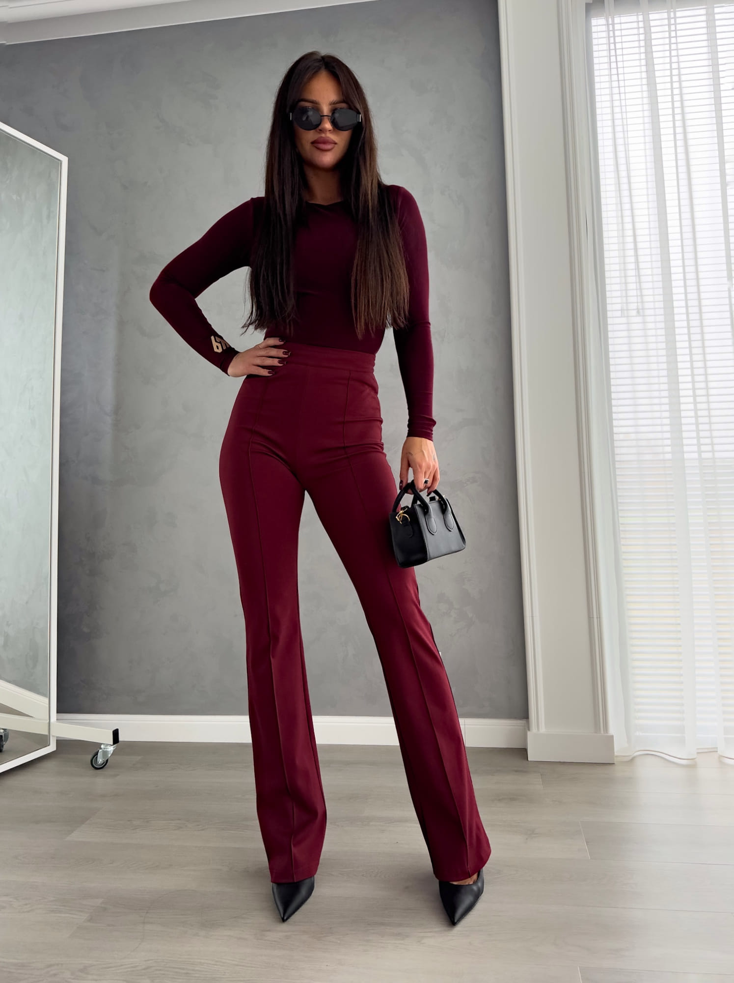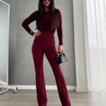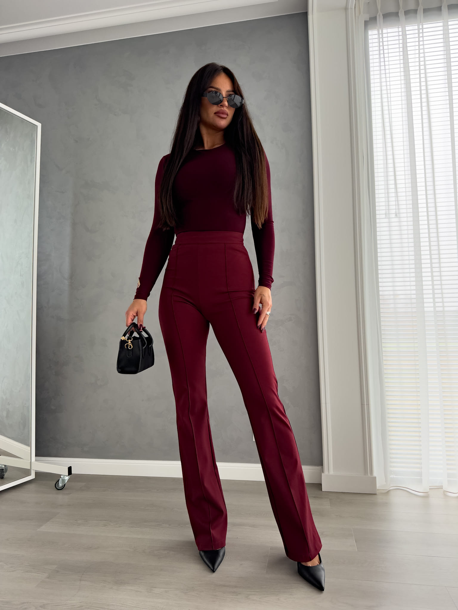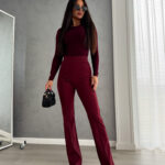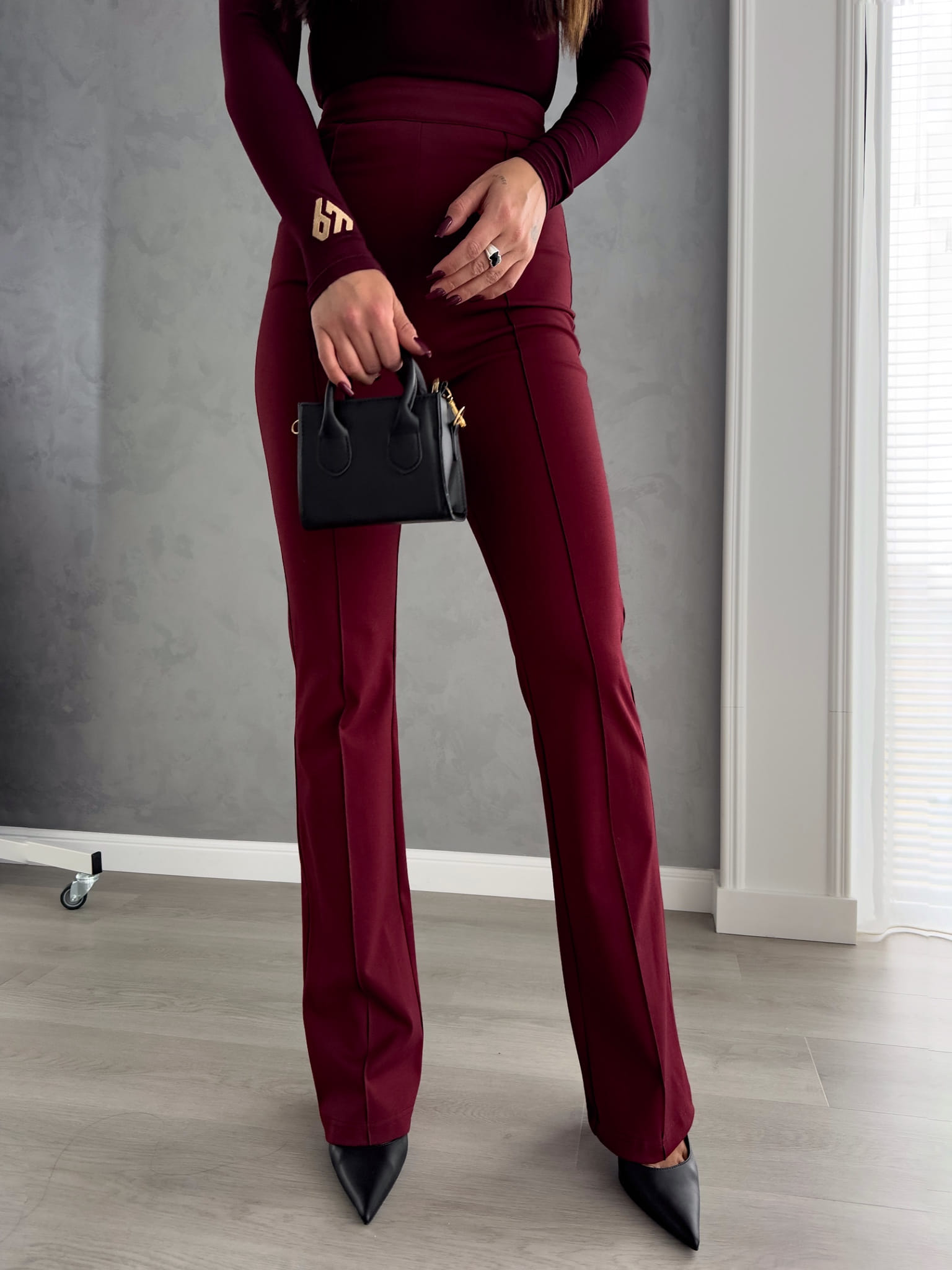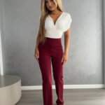 Spodnie z luźnymi, rozszerzającymi się ku dołowi nogawkami ozdobione pionowym przeszyciem.