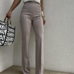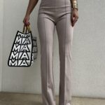 Spodnie z luźnymi, rozszerzającymi się ku dołowi nogawkami ozdobione pionowym przeszyciem.