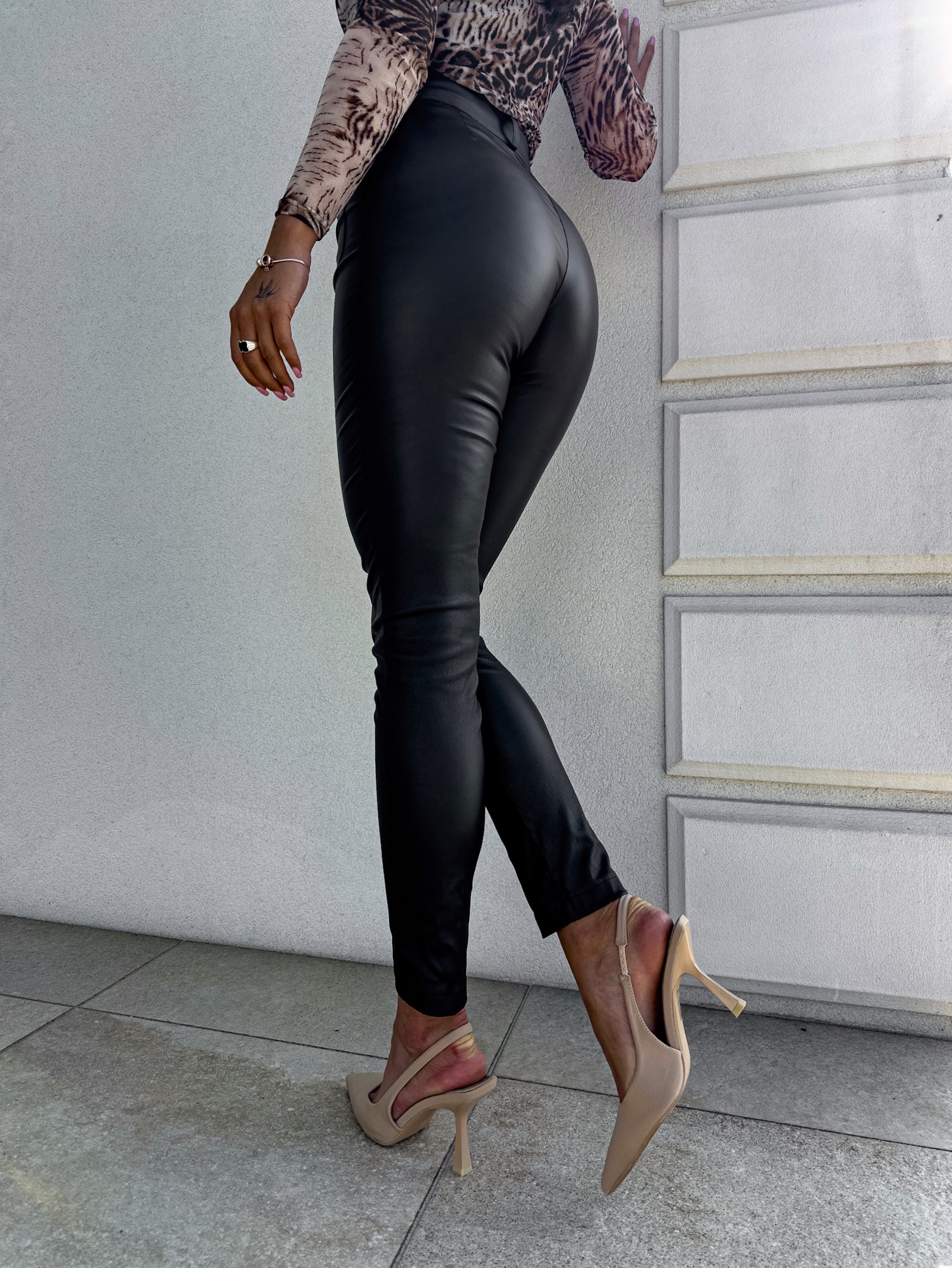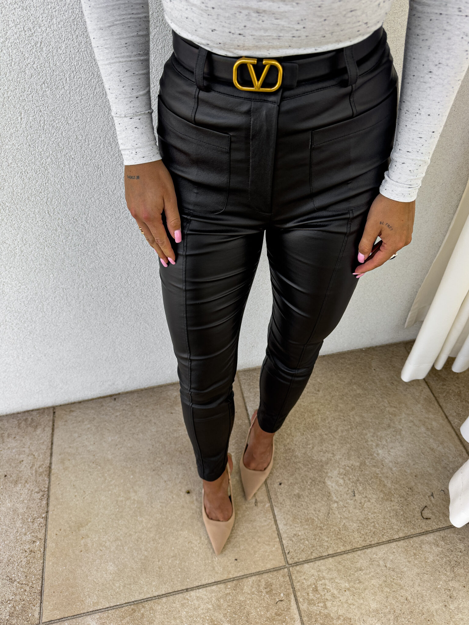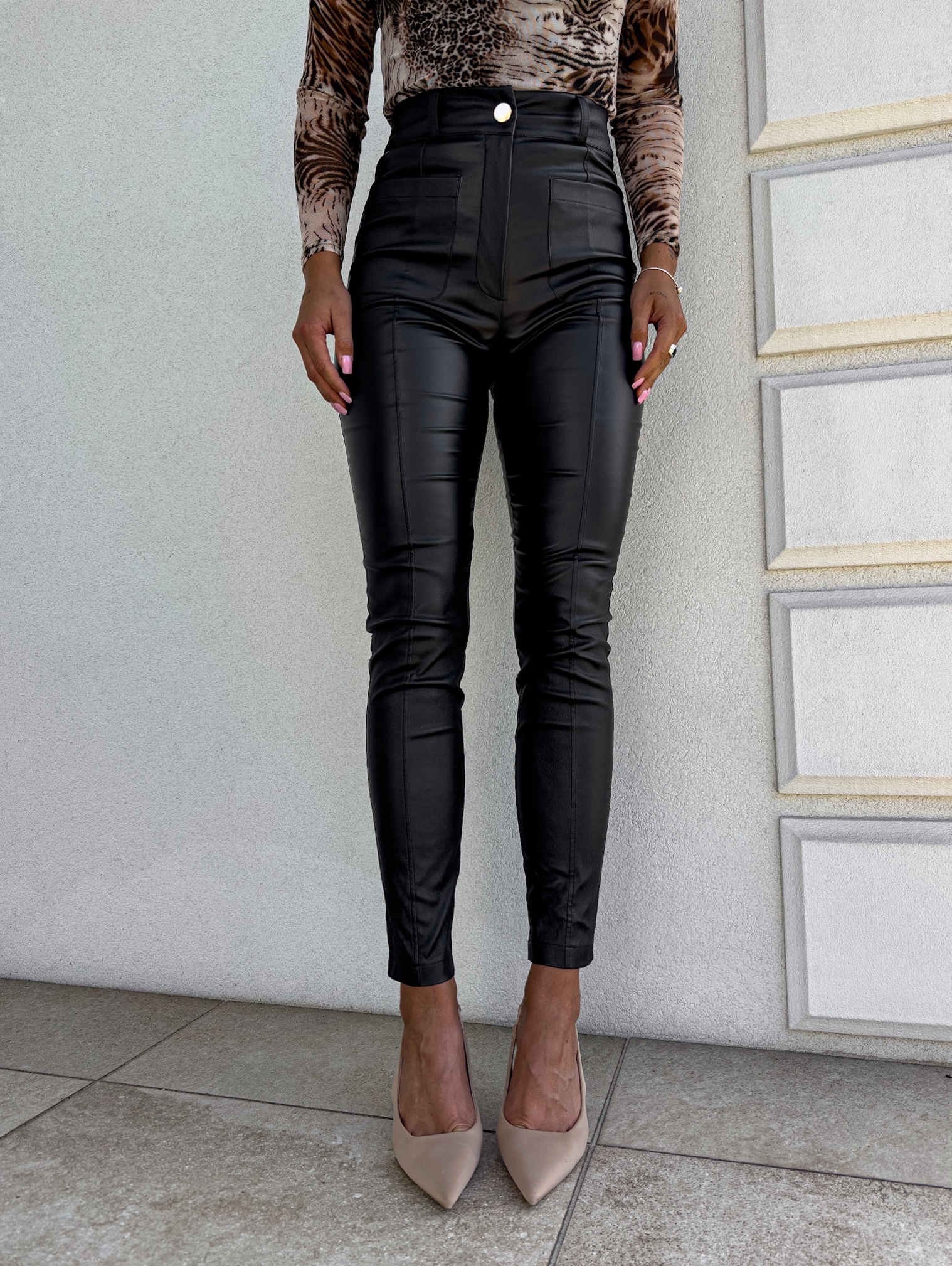 Spodnie POCKET wyróżniają się eleganckim, woskowanym wykończeniem i złotą napą. Nogawki ozdobione suwakami i pionowymi przeszyciami optycznie wydłużają sylwetkę. Z przodu umieszczono dwie praktyczne kieszenie.