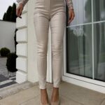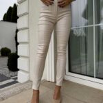 Spodnie POCKET wyróżniają się eleganckim, woskowanym wykończeniem i złotą napą. Nogawki ozdobione suwakami i pionowymi przeszyciami optycznie wydłużają sylwetkę. Z przodu umieszczono dwie praktyczne kieszenie.