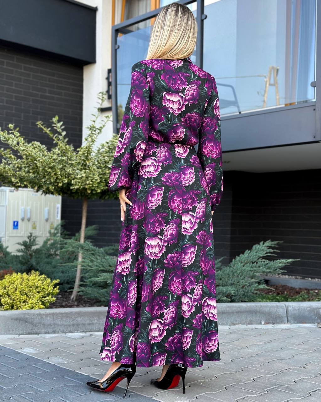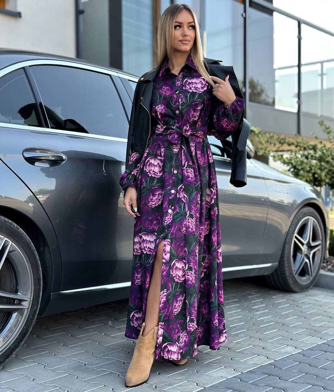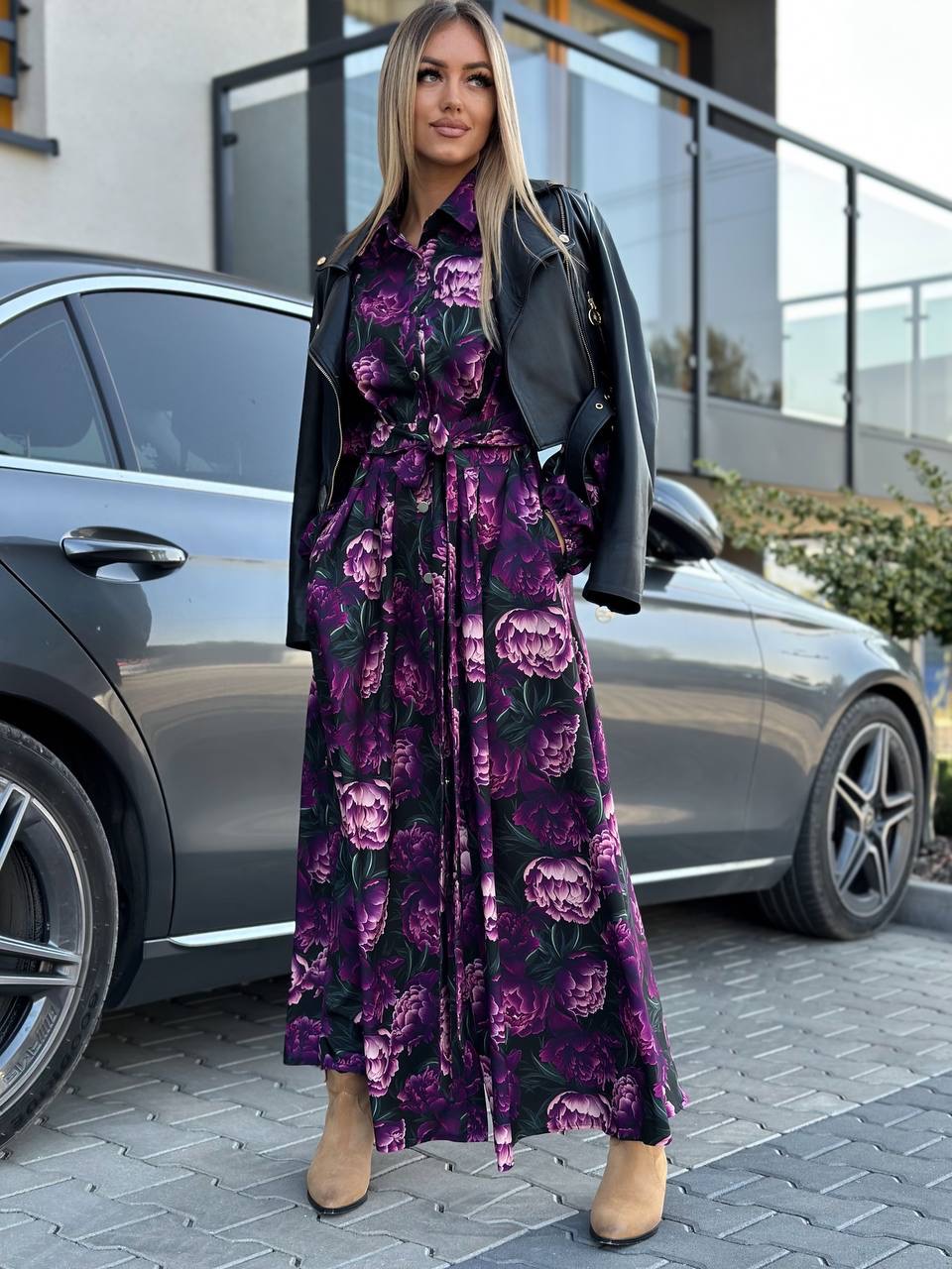 Elegancka sukienka midi z kołnierzykiem, zapinana na złote guziki, to kobieca i uniwersalna propozycja. Długie rękawy zakończone gumką, pasek w talii oraz praktyczne kieszenie podkreślają funkcjonalność i styl. Wykonana z wysokiej jakości materiału, zapewnia komfort noszenia. Pasek dołączony do zestawu.