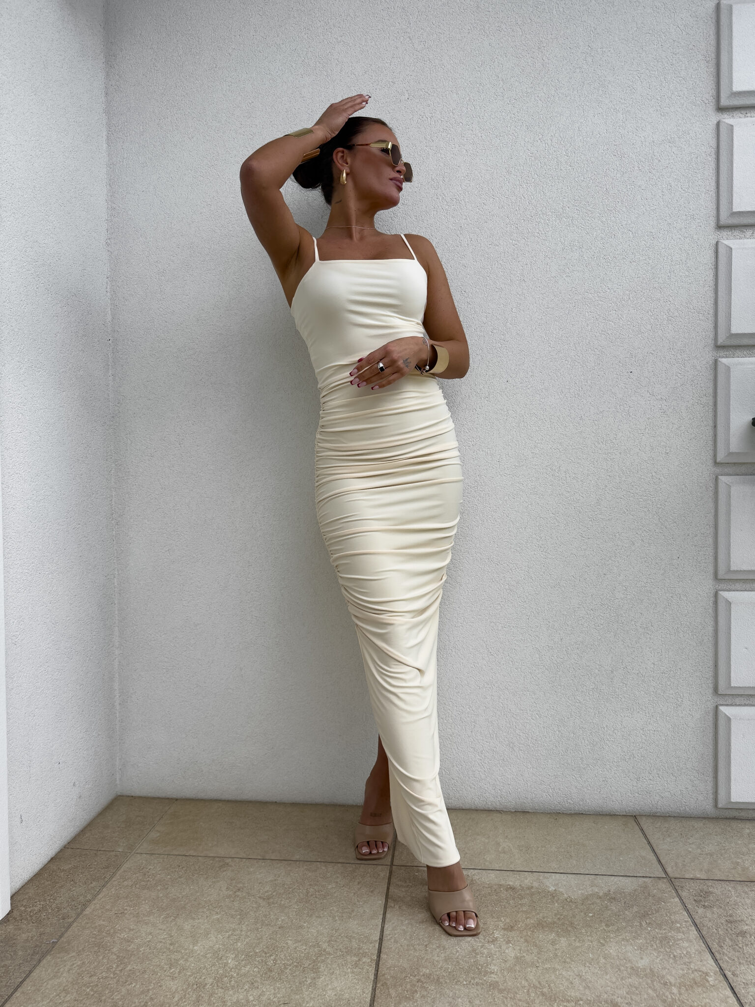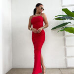 Sukienka Aura to dopasowana maxi kreacja wykonana z lekkiego, przyjemnego materiału. Posiada cienkie ramiączka, subtelne rozcięcie z tyłu i prosty, minimalistyczny krój.