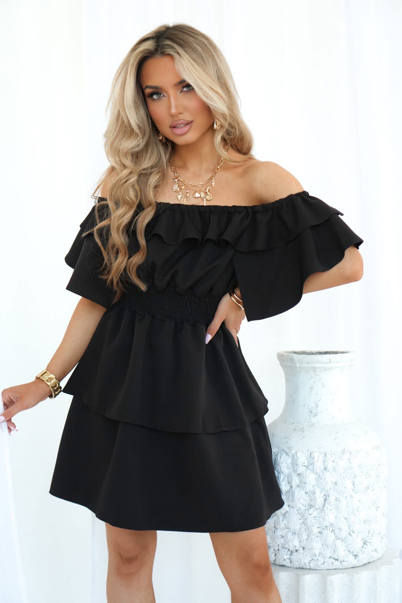 Sukienka hiszpanka VALENTINA to model premium, który łączy kobiecość i komfort. Dekolt zdobią efektowne falbany, a szeroki ściągacz w pasie z drobnych gumek podkreśla talię. Dół z dwóch szerokich falban optycznie wydłuża nogi. Sukienka nie posiada podszewki i doskonale maskuje brzuszek oraz biodra, jednocześnie eksponując ramiona i dekolt.