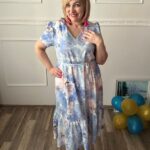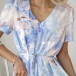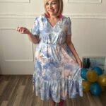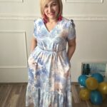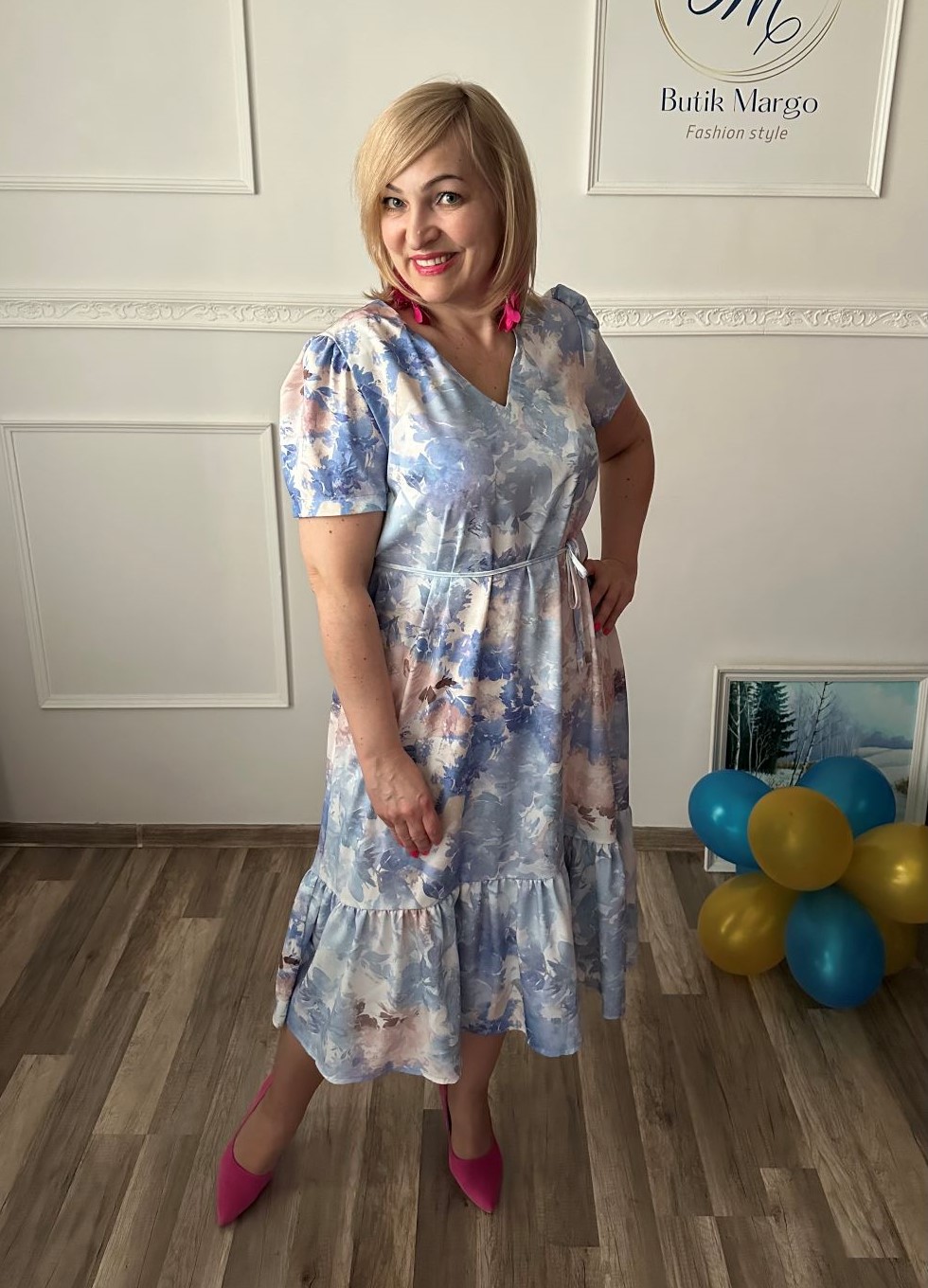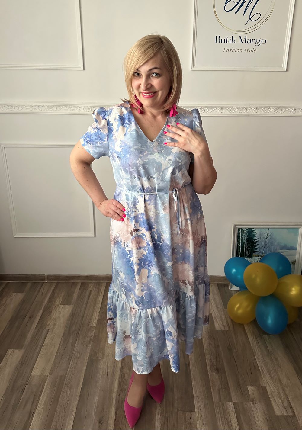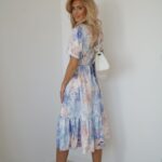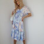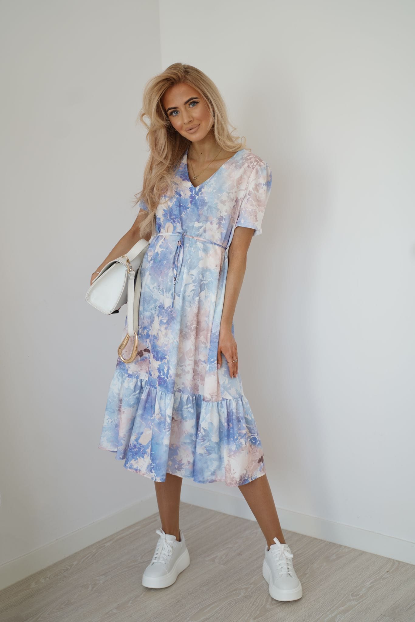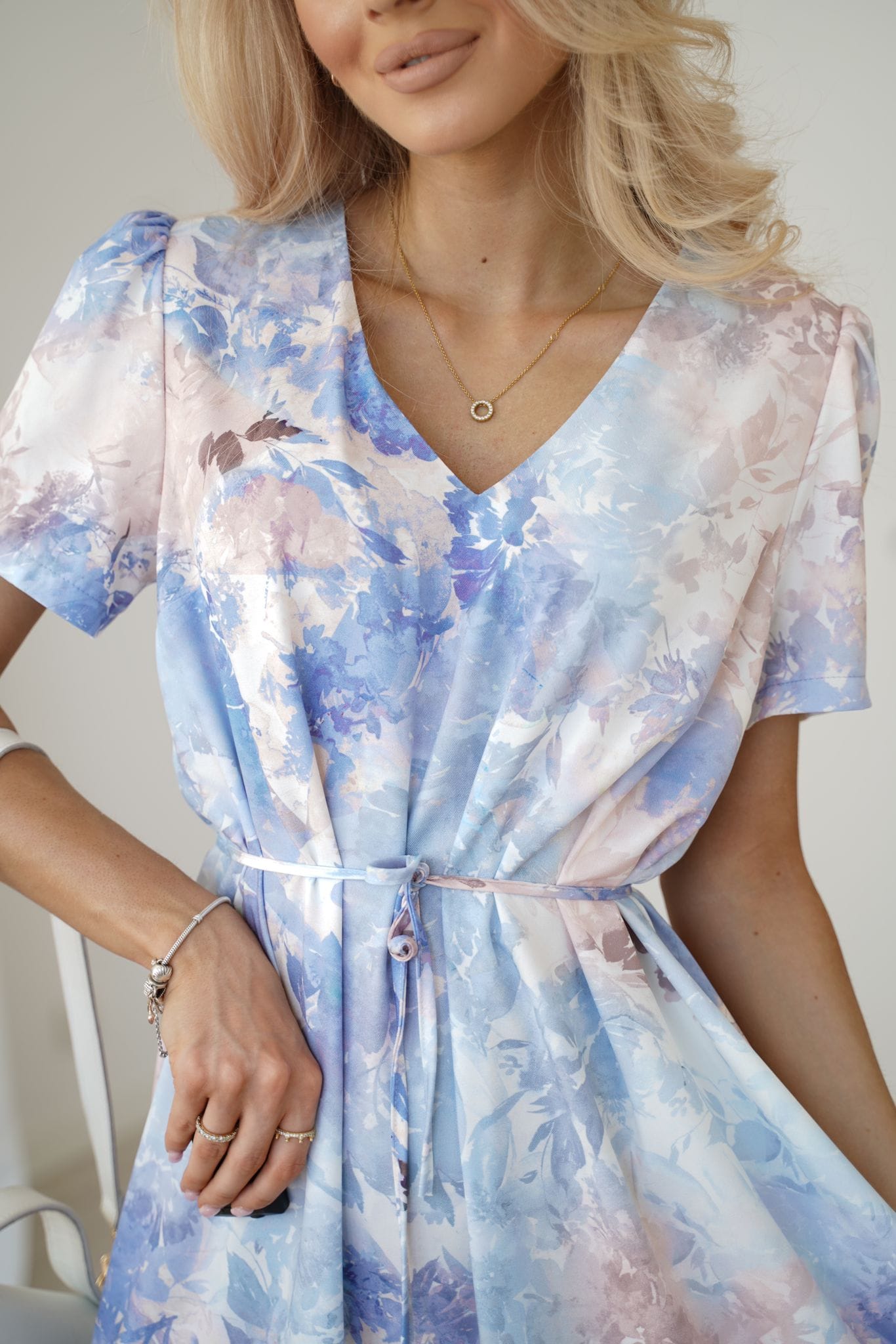 Sukienka LISA, kolor błękitny z dodatkiem beżu oraz granatu, print w liście, długa sukienka w kształcie litery A z cieniutkim paskiem do wiązania oraz krótkim rękawkiem, dekolt w kształcie litery V. Rękawek tworzy bufkę, który dodaje uroku całej sukience. Dół sukienki wykończony szerszą falbaną. Sukienka posiada kieszenie, jest lekka i zwiewna, nie zawiera podszewki, jest niemnąca. Model niezwykle kobiecy i elegancki. Idealna na oficjalne wyjścia, do pracy oraz uroczystości. Olśnij swoim stylem. 😊 Będziesz czuć się w niej wyjątkowo, kobieco i stylowo.