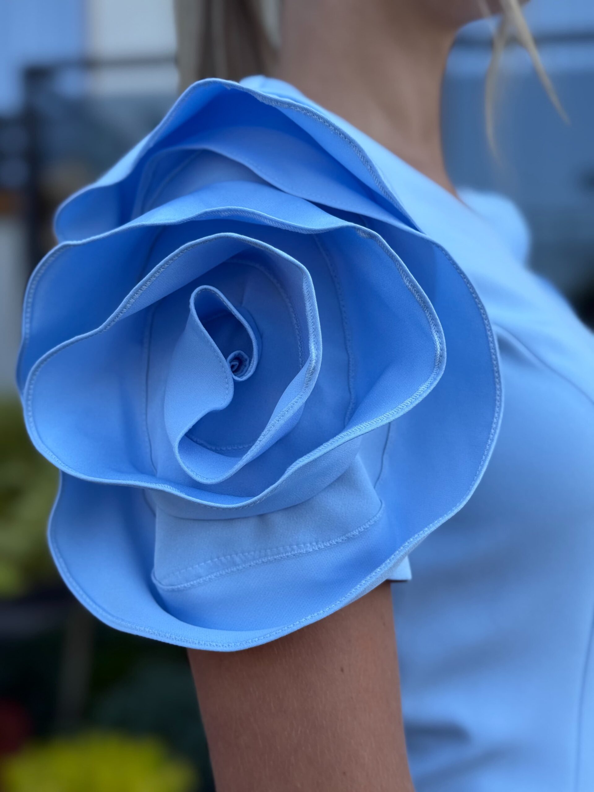 Elegancka sukienka mini z krótkim rękawem ozdobionym kwiatem w tonacji sukienki to kobieca i stylowa propozycja. Taliowany krój podkreśla sylwetkę, a kryty zamek z tyłu zapewnia wygodne zapięcie. Przód zdobią modne patki, dodając całości charakteru.