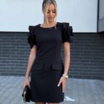 Elegancka sukienka mini z krótkim rękawem ozdobionym kwiatem w tonacji sukienki to kobieca i stylowa propozycja. Taliowany krój podkreśla sylwetkę, a kryty zamek z tyłu zapewnia wygodne zapięcie. Przód zdobią modne patki, dodając całości charakteru.