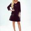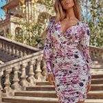 Sukienka MISSY II, z dużymi kwiatami i liśćmi w kolorze różu i ciemnej śliwki, sukienka z dekoltem pięknie podkreślającym biust, od pasa w dół jest marszczona, nie posiada podszewki, z tyłu ma suwak. Sukienka ma luźny długi rękaw zakończony wąskim mankietem. Ten model to prawdziwy hit modelujący kobiecą sylwetkę. Świetna dla pań o wyższym wzroście (od 165 cm). W tym modelu zawsze będziesz wyglądać kobieco i seksownie. Można ją nosić na wiele różnych okazji.