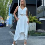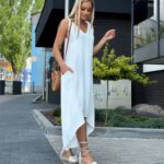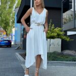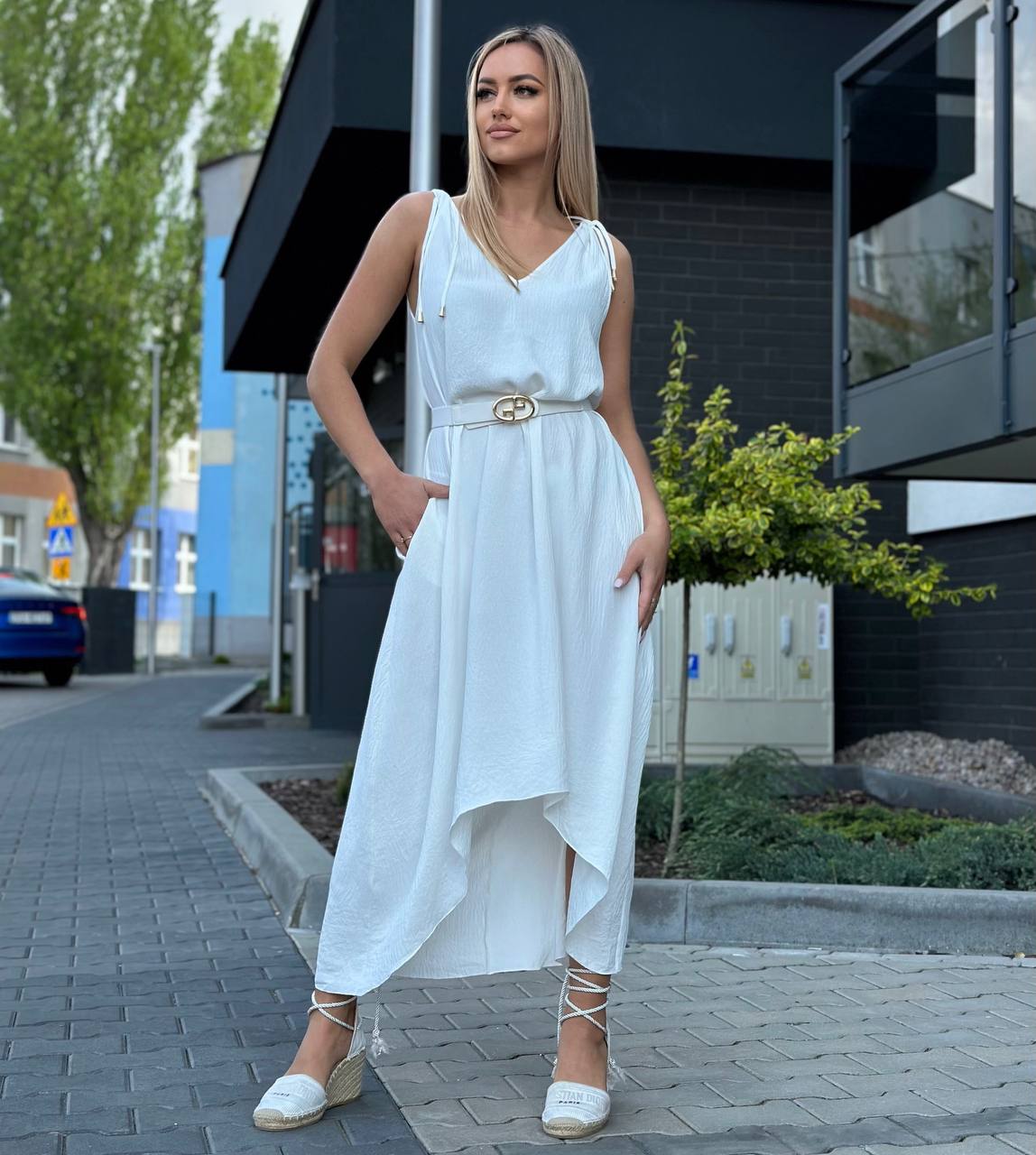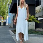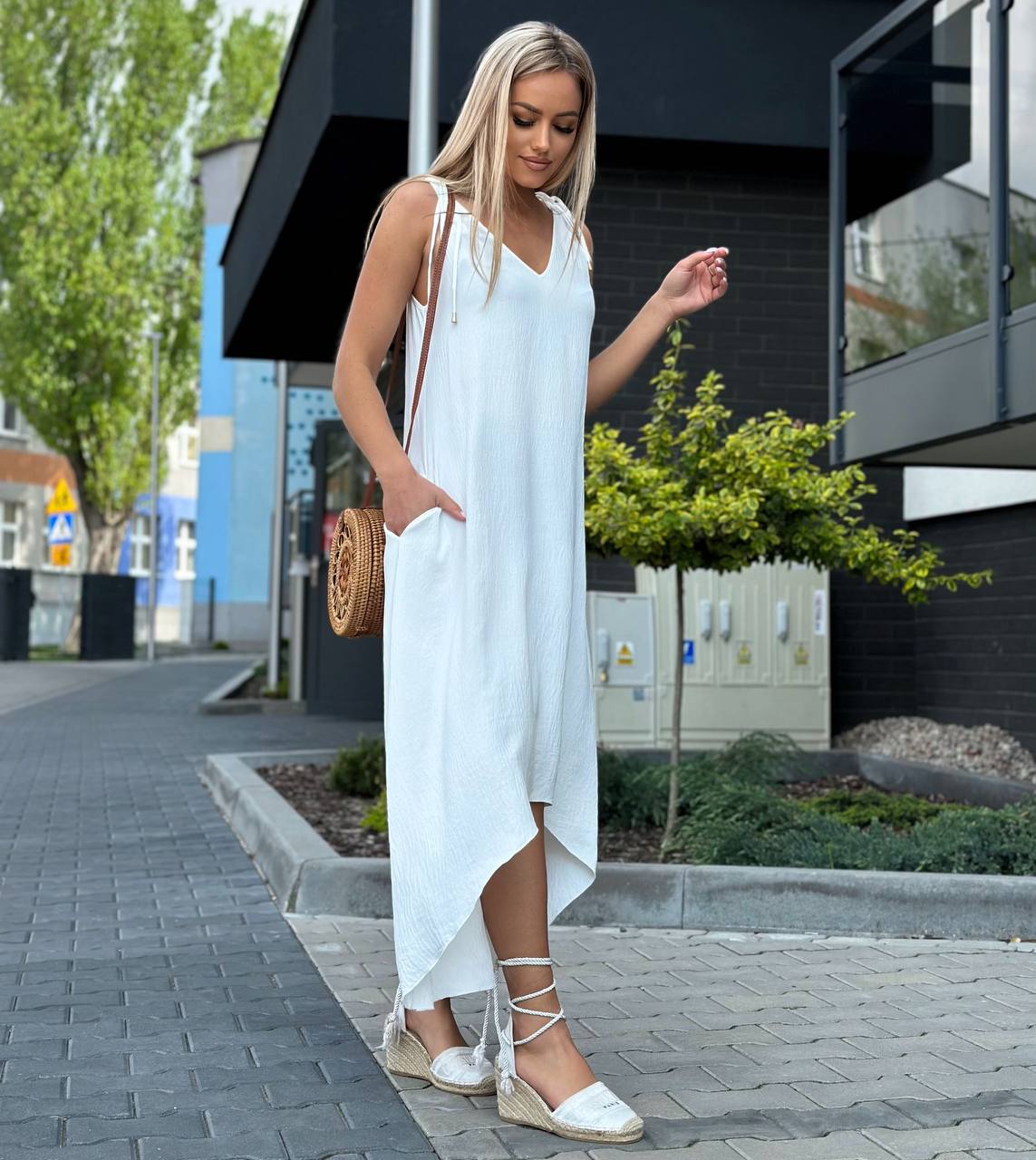 Sukienka o trapezowym kroju, uszyta ze zwiewnego i przyjemnego materiału, zapewnia komfort noszenia. Dekolt w literę V subtelnie podkreśla biust, a fason w literę A pasuje do każdej sylwetki. Z przodu krótsza, z tyłu dłuższa, posiada praktyczne kieszenie po bokach.