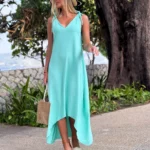 Sukienka o trapezowym kroju, uszyta ze zwiewnego i przyjemnego materiału, zapewnia komfort noszenia. Dekolt w literę V subtelnie podkreśla biust, a fason w literę A pasuje do każdej sylwetki. Z przodu krótsza, z tyłu dłuższa, posiada praktyczne kieszenie po bokach.