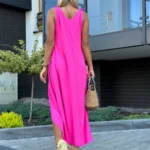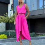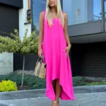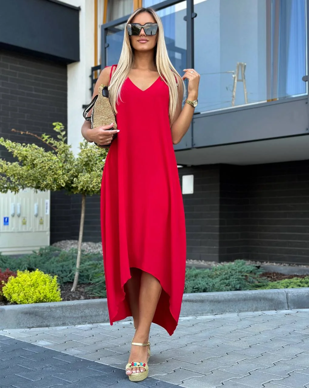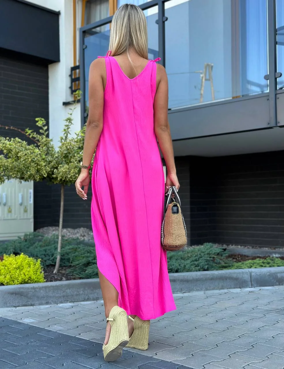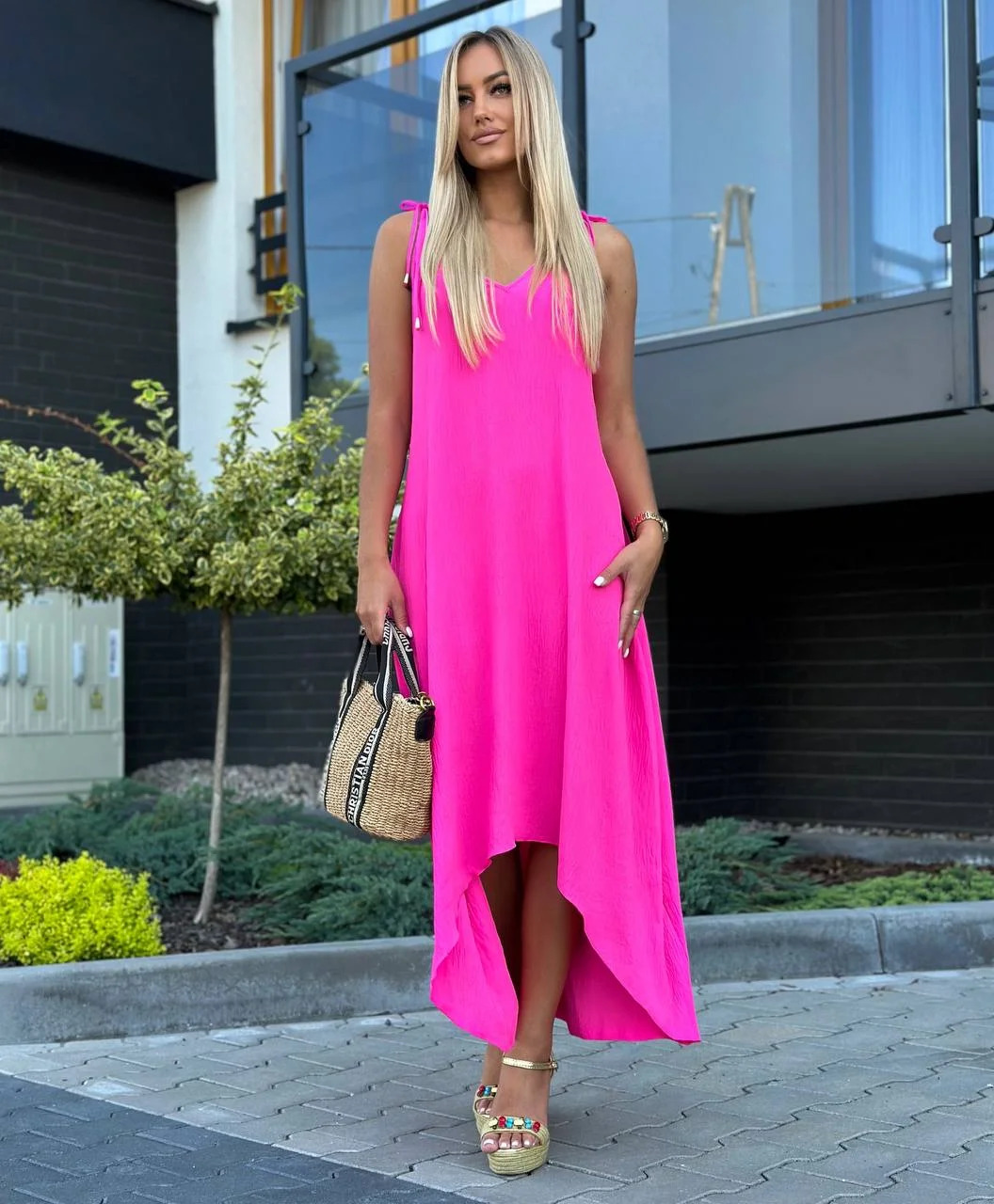 Sukienka o trapezowym kroju, uszyta ze zwiewnego i przyjemnego materiału, zapewnia komfort noszenia. Dekolt w literę V subtelnie podkreśla biust, a fason w literę A pasuje do każdej sylwetki. Z przodu krótsza, z tyłu dłuższa, posiada praktyczne kieszenie po bokach.