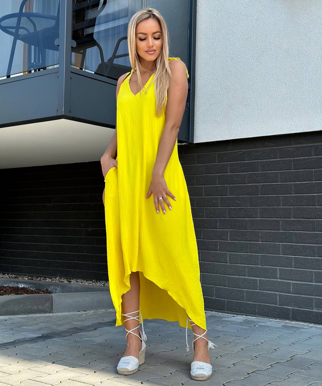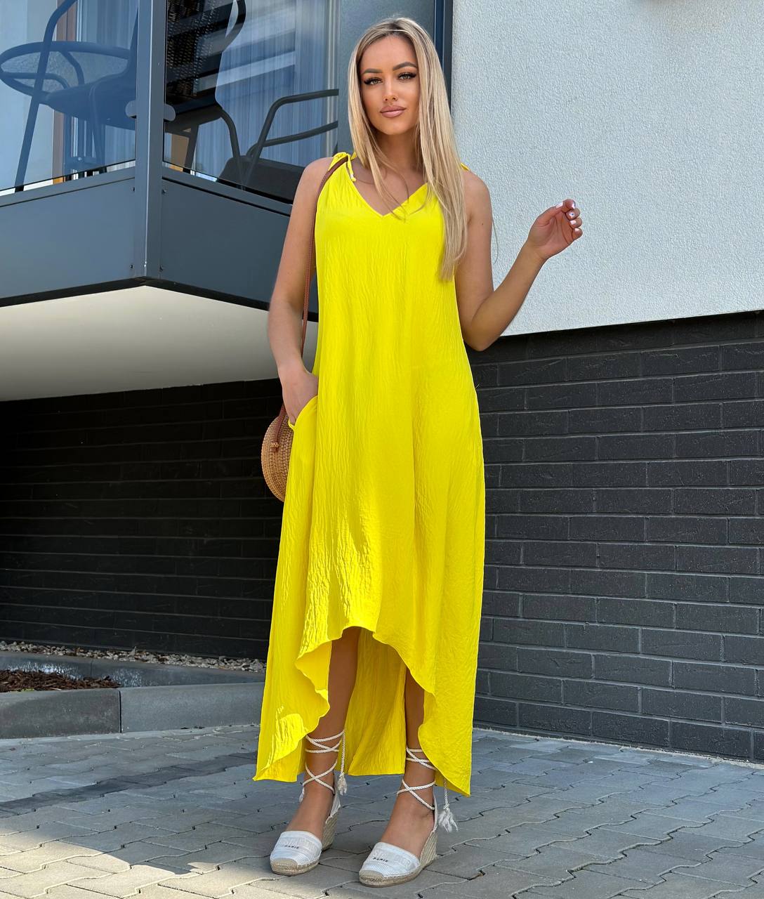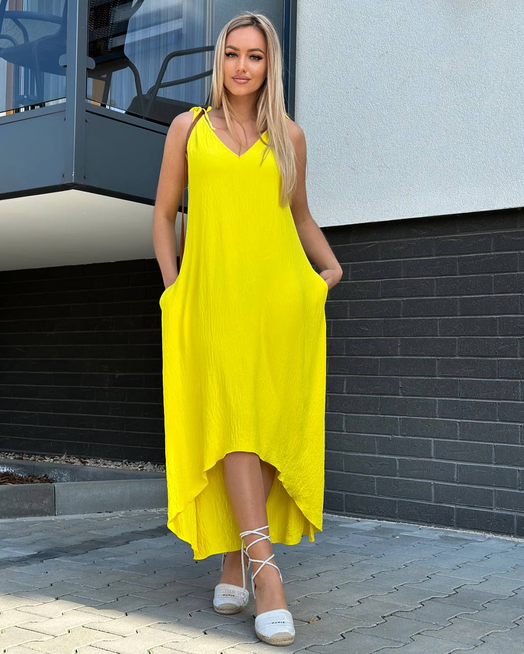 Sukienka o trapezowym kroju, uszyta ze zwiewnego i przyjemnego materiału, zapewnia komfort noszenia. Dekolt w literę V subtelnie podkreśla biust, a fason w literę A pasuje do każdej sylwetki. Z przodu krótsza, z tyłu dłuższa, posiada praktyczne kieszenie po bokach.