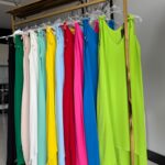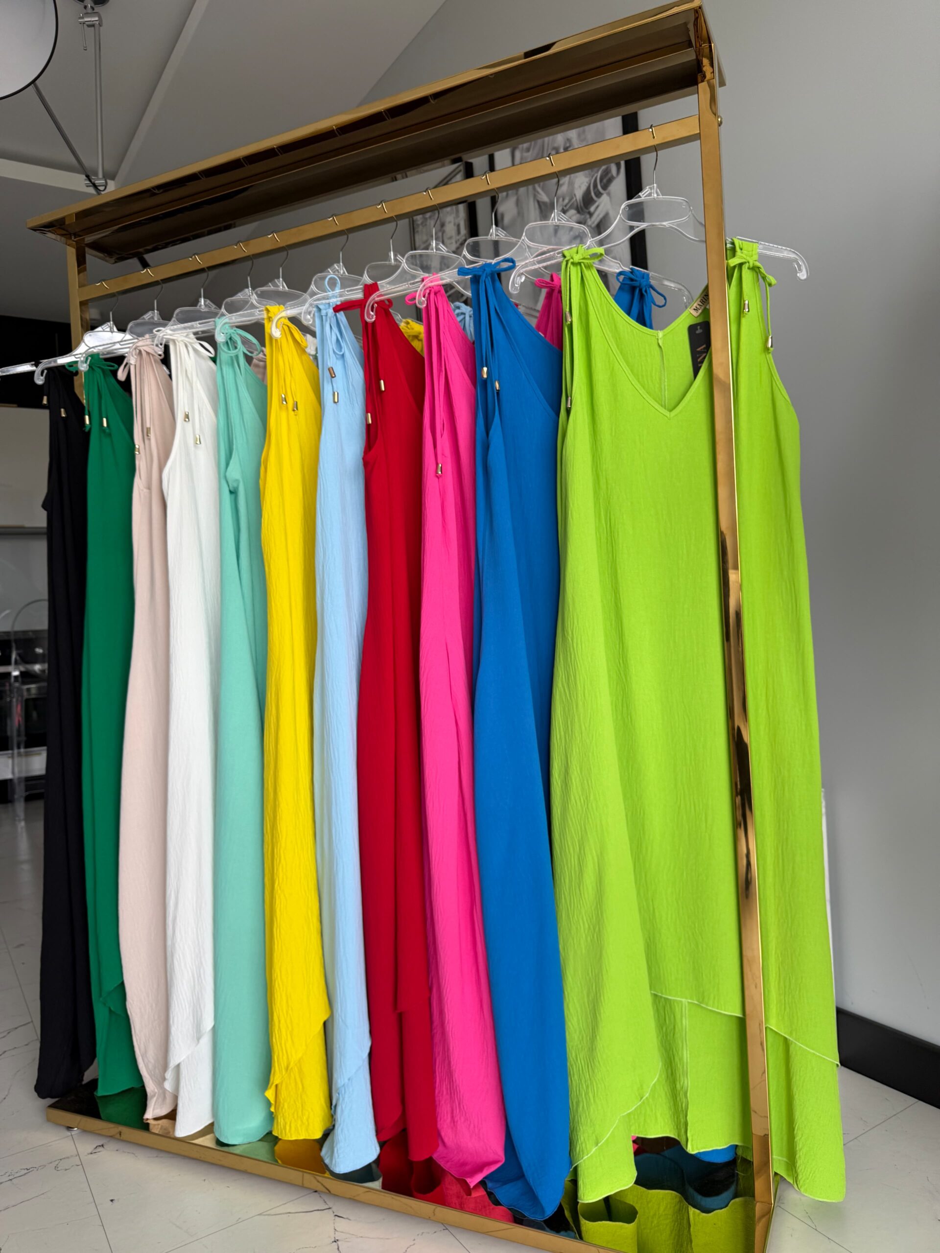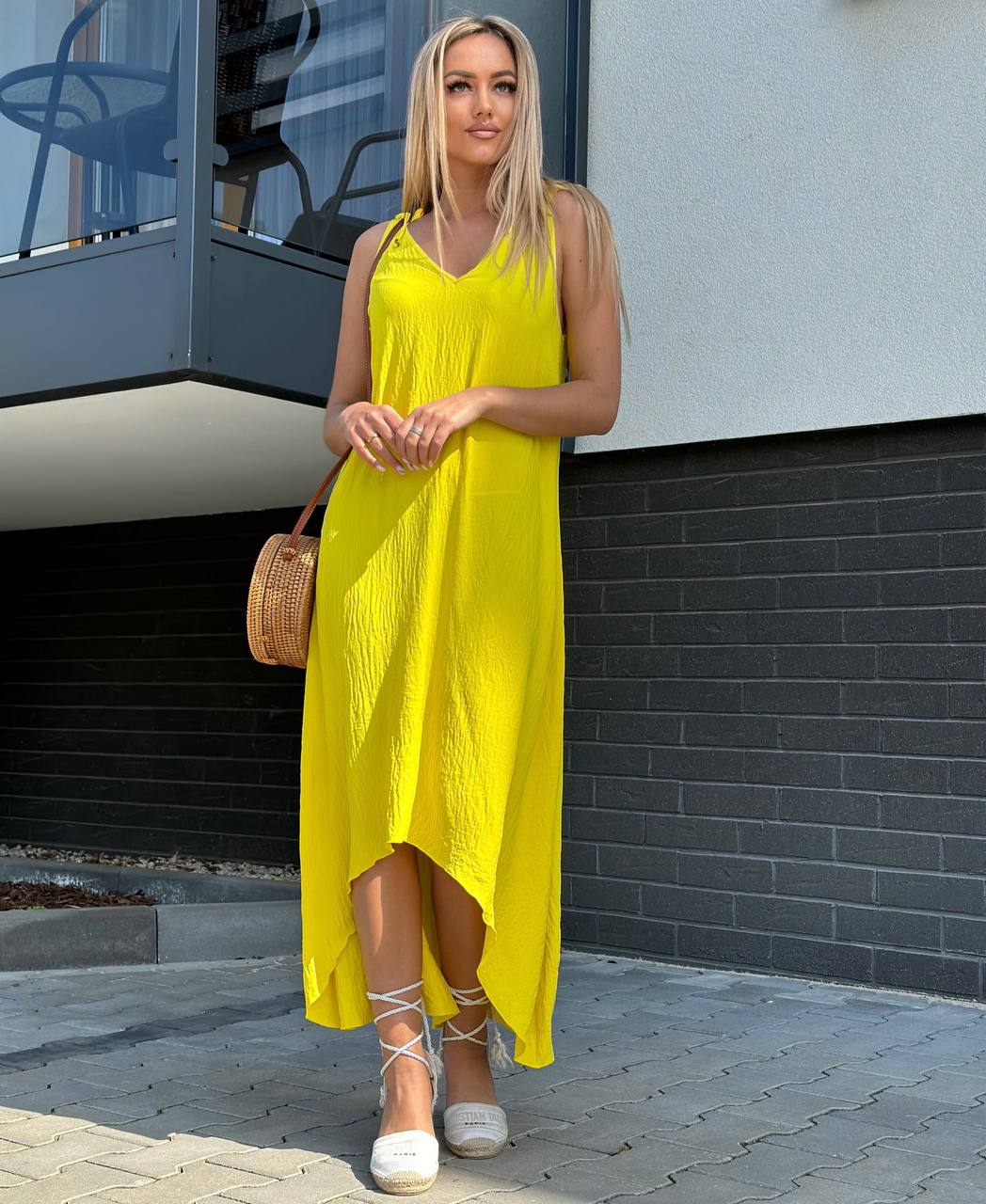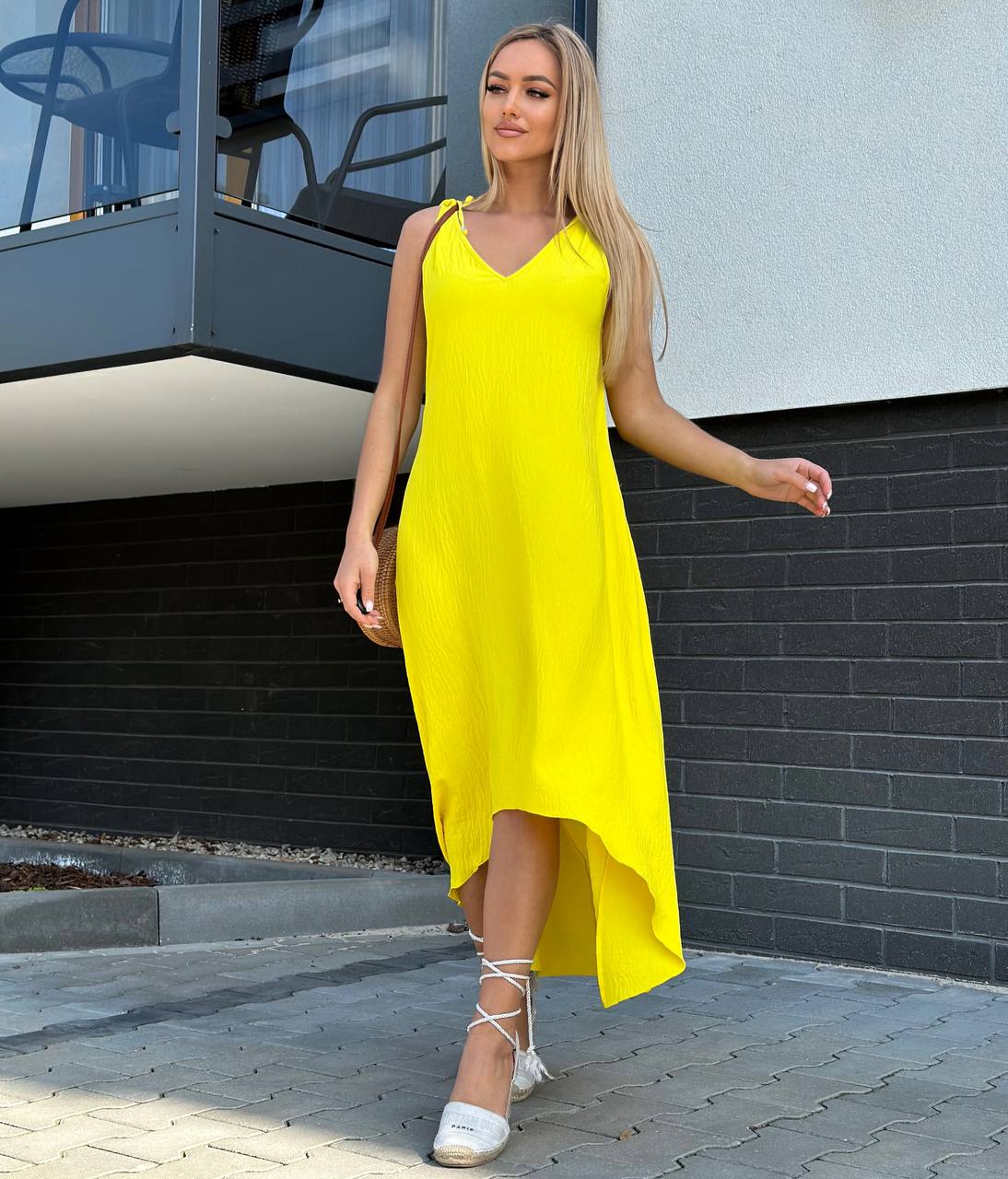 Sukienka o trapezowym kroju, uszyta ze zwiewnego i przyjemnego materiału, zapewnia komfort noszenia. Dekolt w literę V subtelnie podkreśla biust, a fason w literę A pasuje do każdej sylwetki. Z przodu krótsza, z tyłu dłuższa, posiada praktyczne kieszenie po bokach.