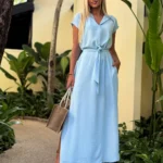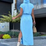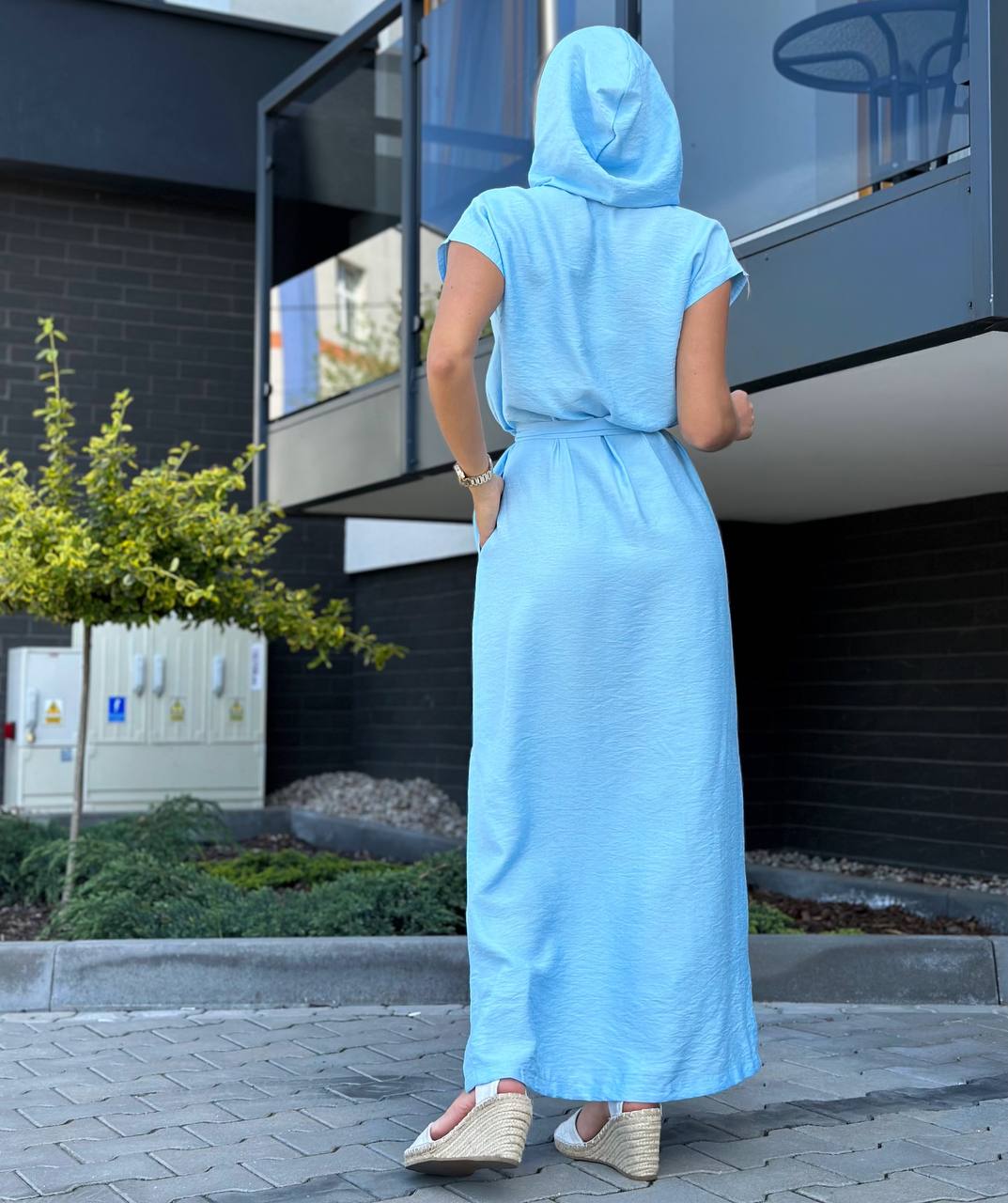 Zwiewna sukienka maxi z kapturem to stylowa i wygodna propozycja na co dzień. Przewiązywana w pasie paskiem (w zestawie), z bocznymi kieszeniami i rozcięciami po bokach, zapewnia swobodę i kobiecy wygląd.