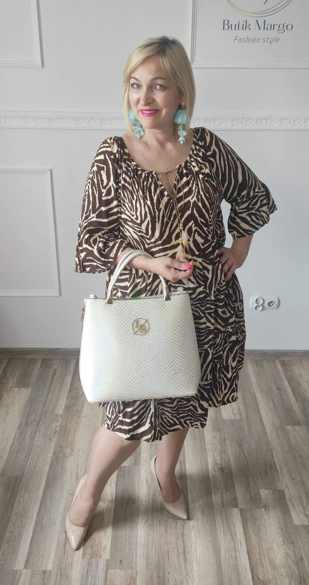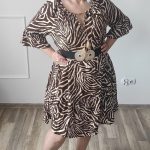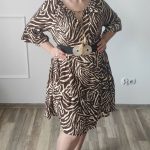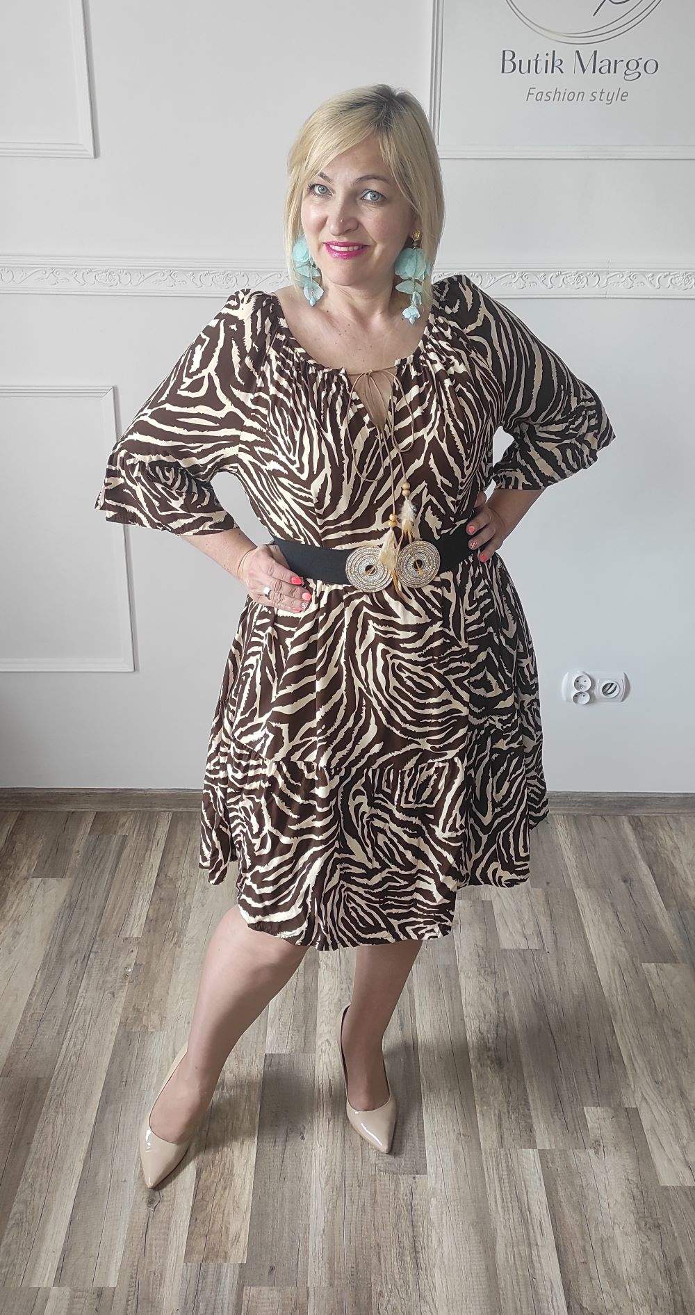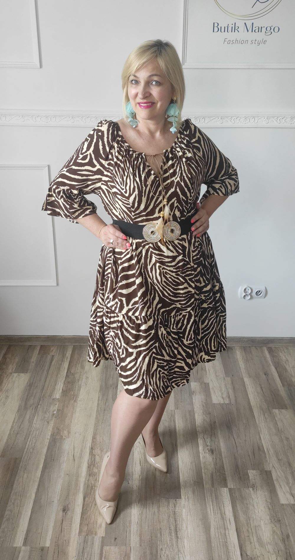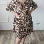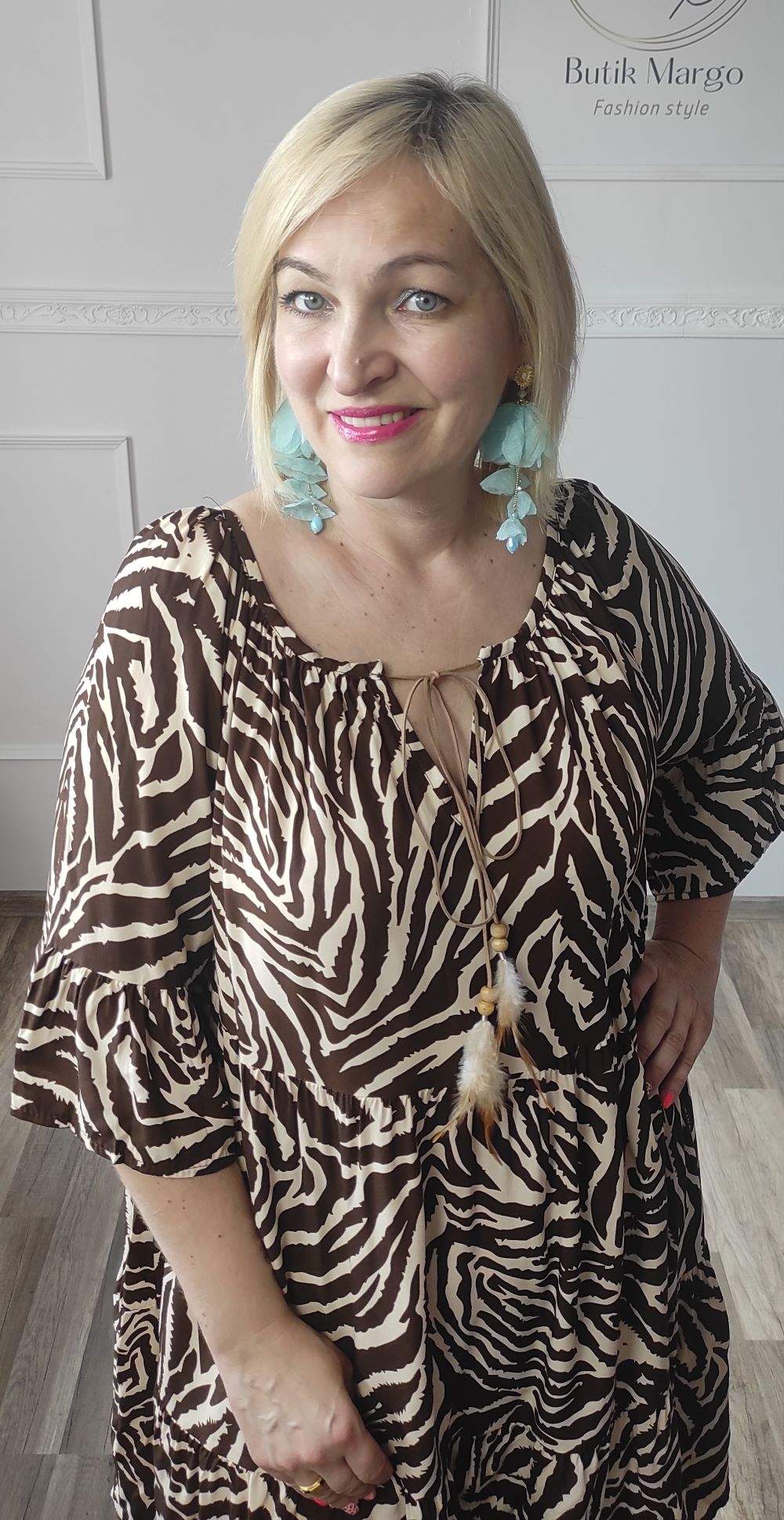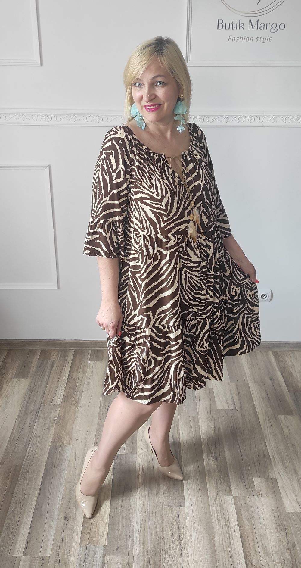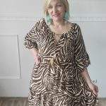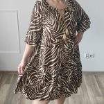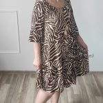 Sukienka ZEBRA, lekka i zwiewna sukienka, bez podszewki, wiskozowa o kroju oversize. Ma krótki do łokcia, dzwonowaty rękaw. Print: zebra, kolor brązowo-beżowy. Sukienka ma krój luźny w kształt litery A. Idealna propozycja do pracy lub na co dzień, do pracy w biurze, urzędzie. Założysz ją z powodzeniem do trampka, szpilki, botka i kozaczka, a także do ramoneski i kurtki jeansowej, pod kardigan. Świetnie sprawdzi się z paskiem i będzie pięknie podkreślać talię. Możesz nosić ją każdego dnia ciesząc się lekkością noszenia.