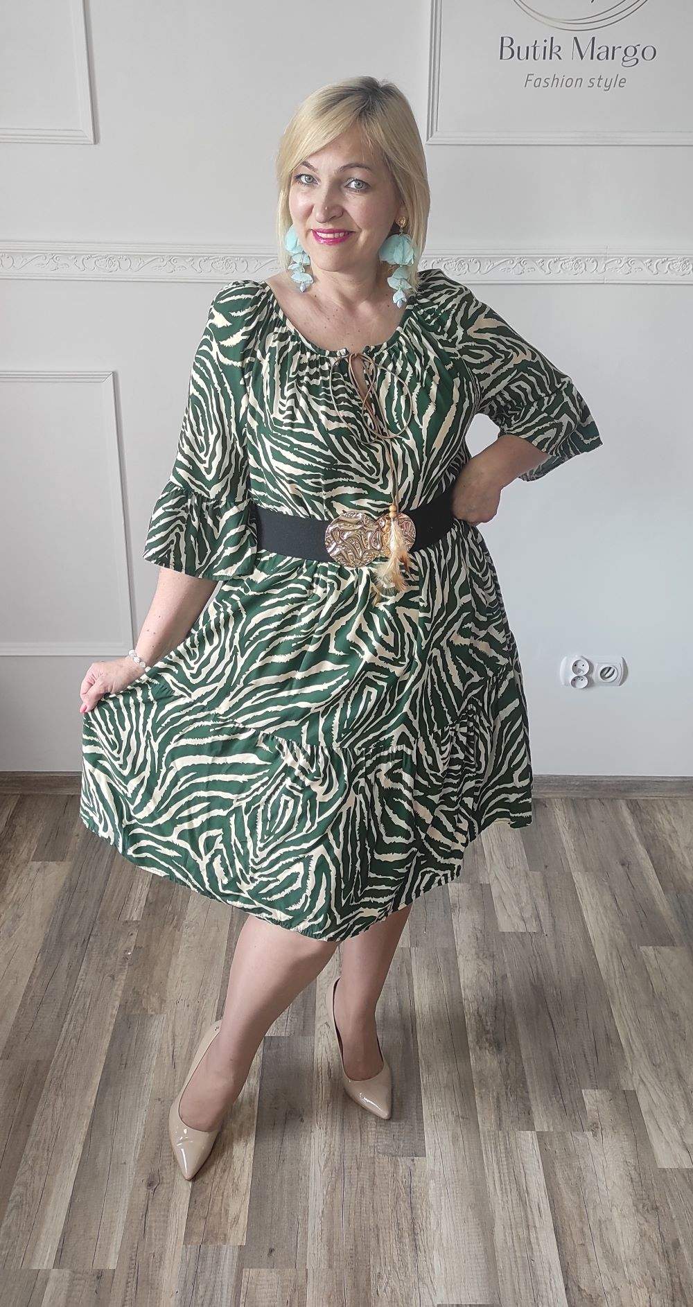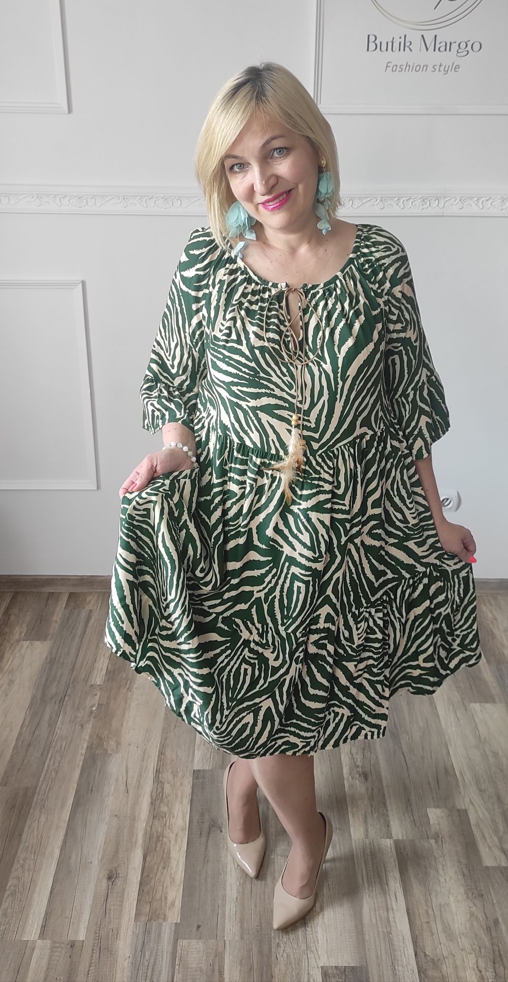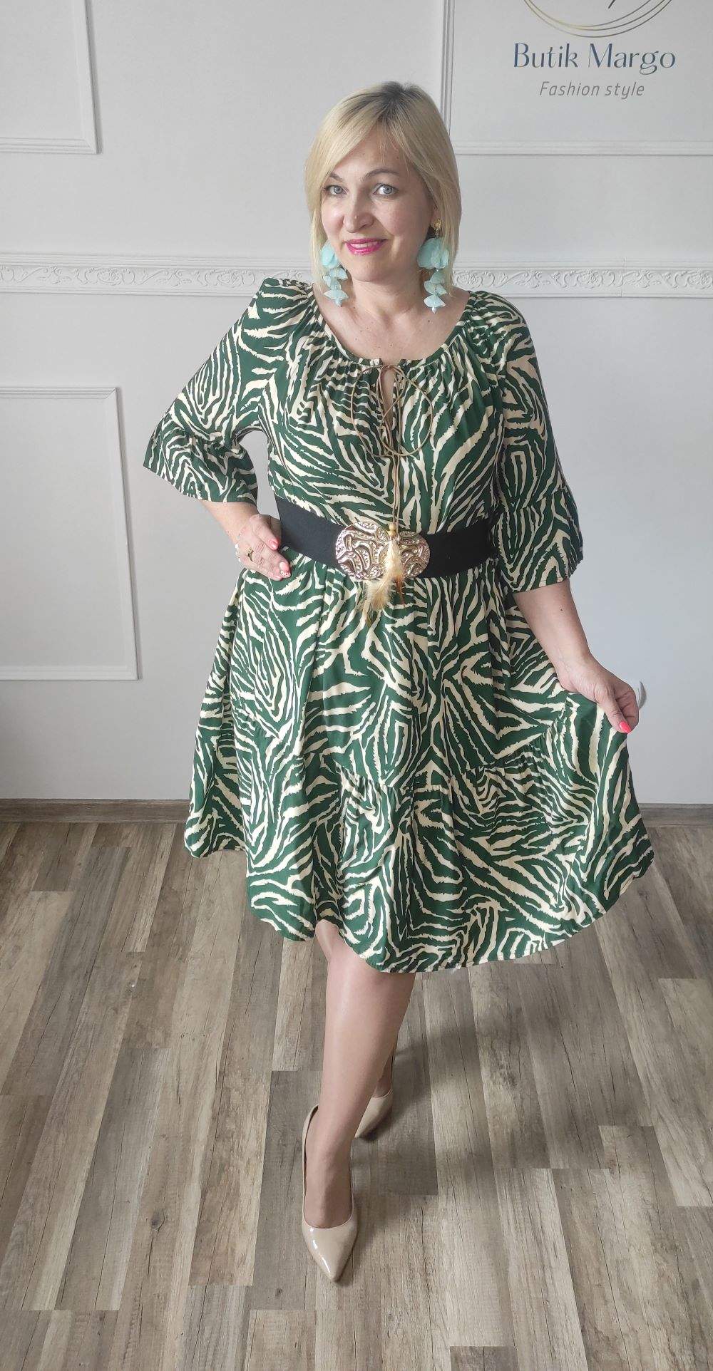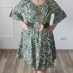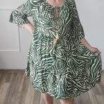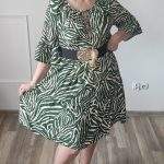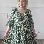 Sukienka ZEBRA, lekka i zwiewna sukienka, bez podszewki, wiskozowa o kroju oversize. Ma krótki do łokcia, dzwonowaty rękaw. Print: zebra, kolor zielono-beżowy. Sukienka ma krój luźny w kształt litery A. Idealna propozycja do pracy lub na co dzień, do pracy w biurze, urzędzie. Założysz ją z powodzeniem do trampka, szpilki, botka i kozaczka, a także do ramoneski i kurtki jeansowej, pod kardigan. Świetnie sprawdzi się z paskiem i będzie pięknie podkreślać talię. Możesz nosić ją każdego dnia ciesząc się lekkością noszenia.