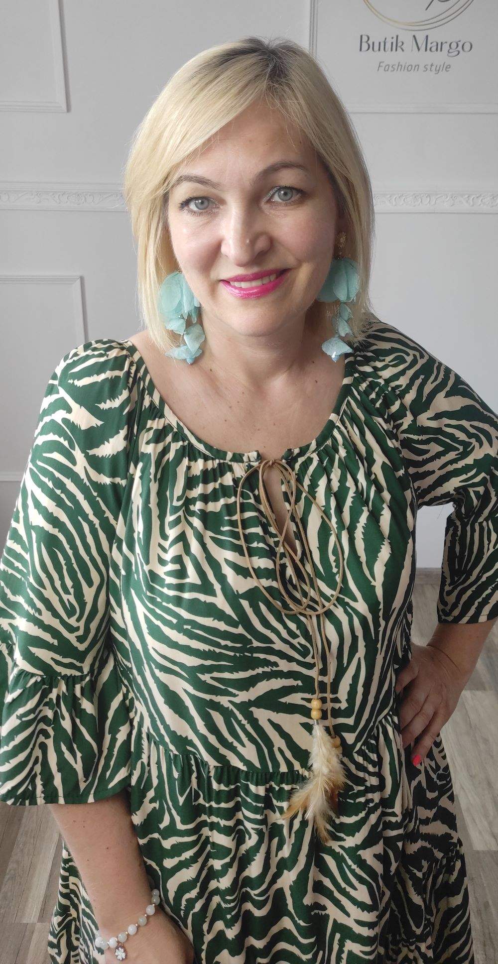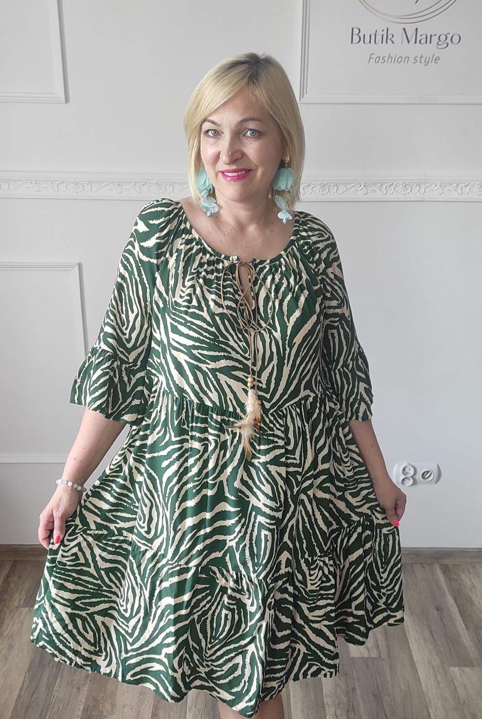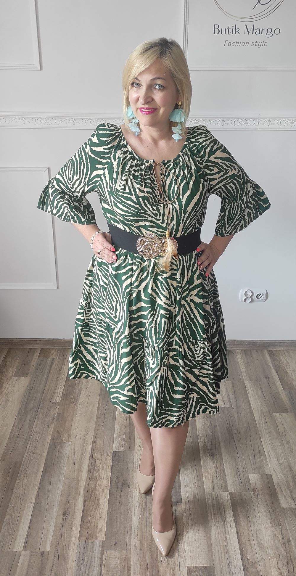 Sukienka ZEBRA, lekka i zwiewna sukienka, bez podszewki, wiskozowa o kroju oversize. Ma krótki do łokcia, dzwonowaty rękaw. Print: zebra, kolor zielono-beżowy. Sukienka ma krój luźny w kształt litery A. Idealna propozycja do pracy lub na co dzień, do pracy w biurze, urzędzie. Założysz ją z powodzeniem do trampka, szpilki, botka i kozaczka, a także do ramoneski i kurtki jeansowej, pod kardigan. Świetnie sprawdzi się z paskiem i będzie pięknie podkreślać talię. Możesz nosić ją każdego dnia ciesząc się lekkością noszenia.