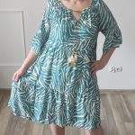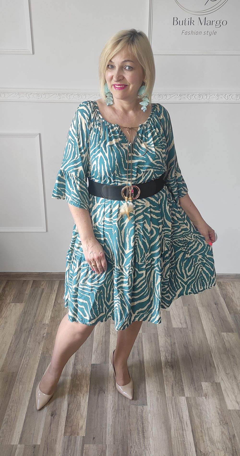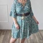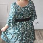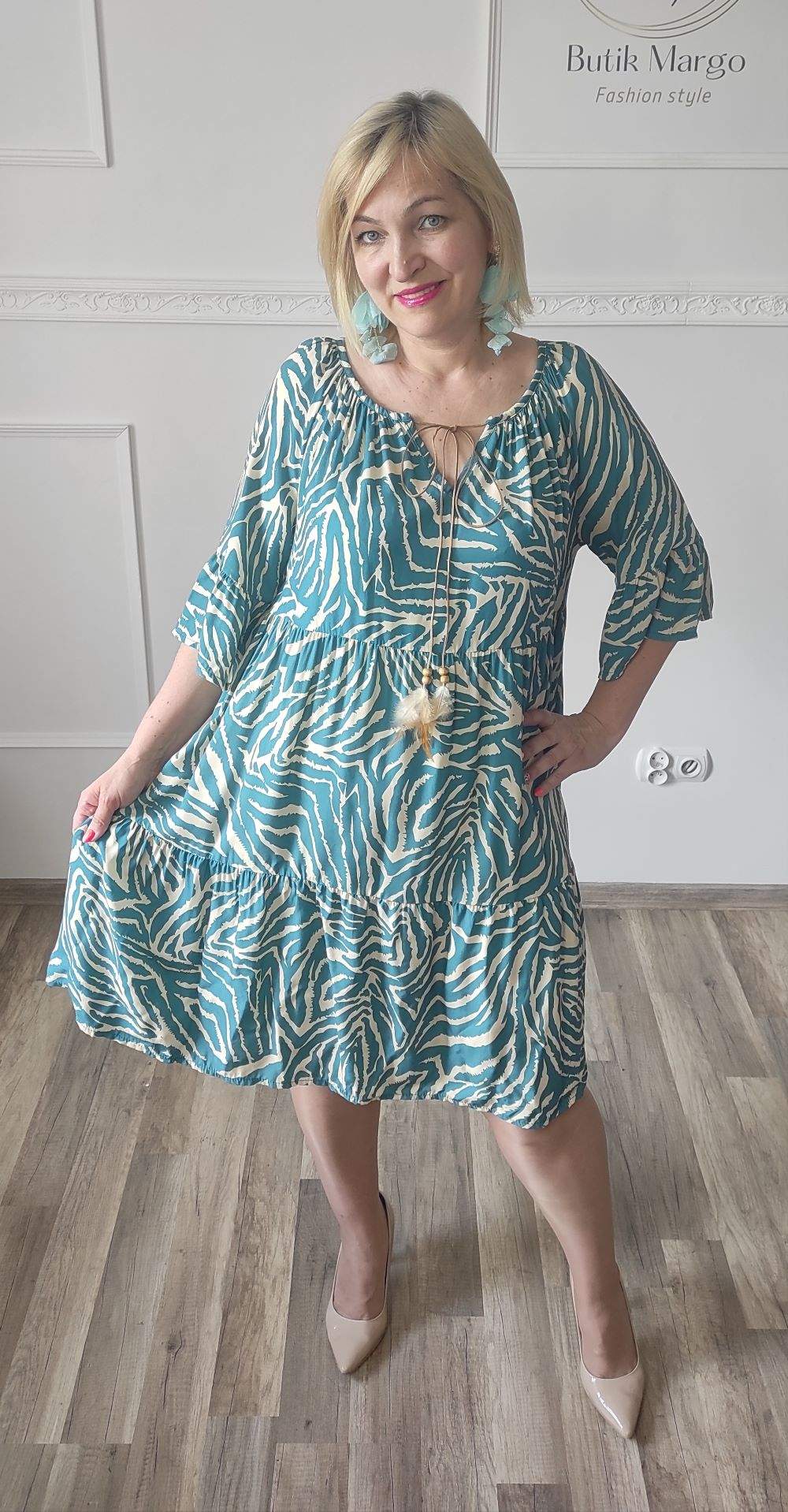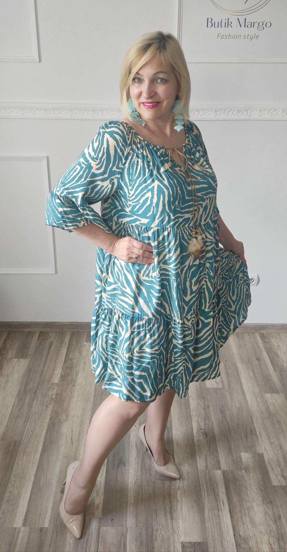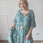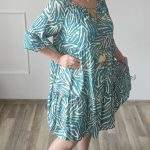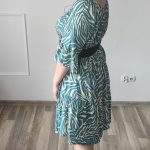 Sukienka ZEBRA, lekka i zwiewna sukienka, bez podszewki, wiskozowa o kroju oversize. Ma krótki do łokcia, dzwonowaty rękaw. Print: zebra, kolor turkusowo-beżowy. Sukienka ma krój luźny w kształt litery A. Idealna propozycja do pracy lub na co dzień, do pracy w biurze, urzędzie. Założysz ją z powodzeniem do trampka, szpilki, botka i kozaczka, a także do ramoneski i kurtki jeansowej, pod kardigan. Świetnie sprawdzi się z paskiem i będzie pięknie podkreślać talię. Możesz nosić ją każdego dnia ciesząc się lekkością noszenia.