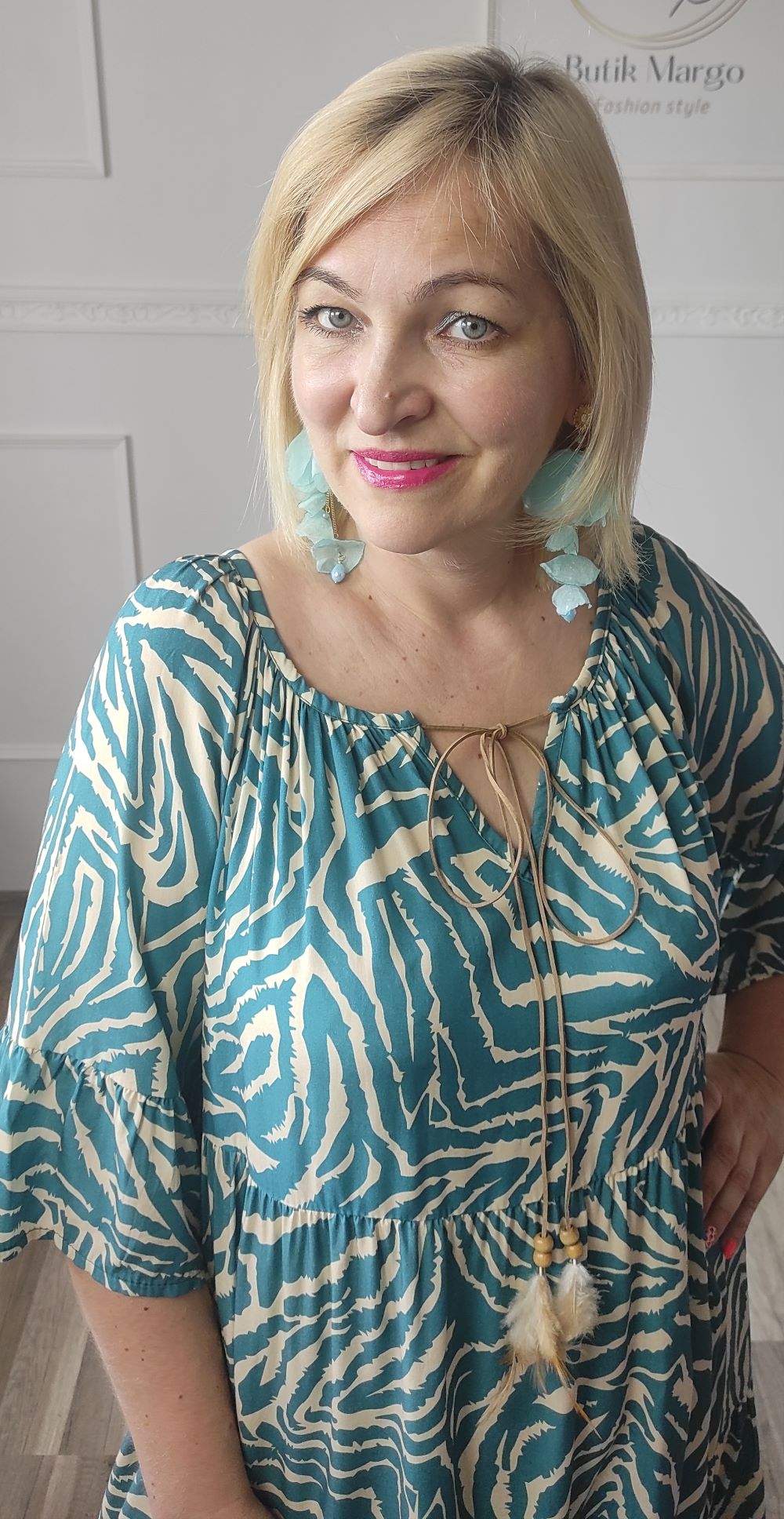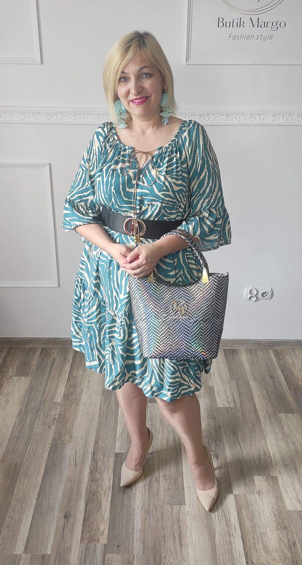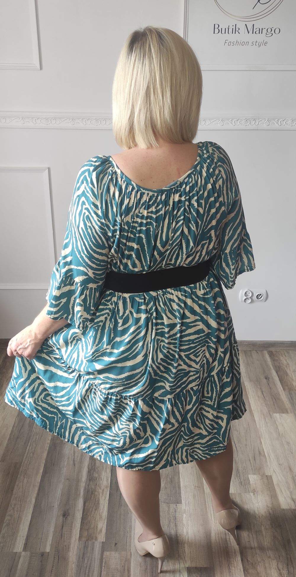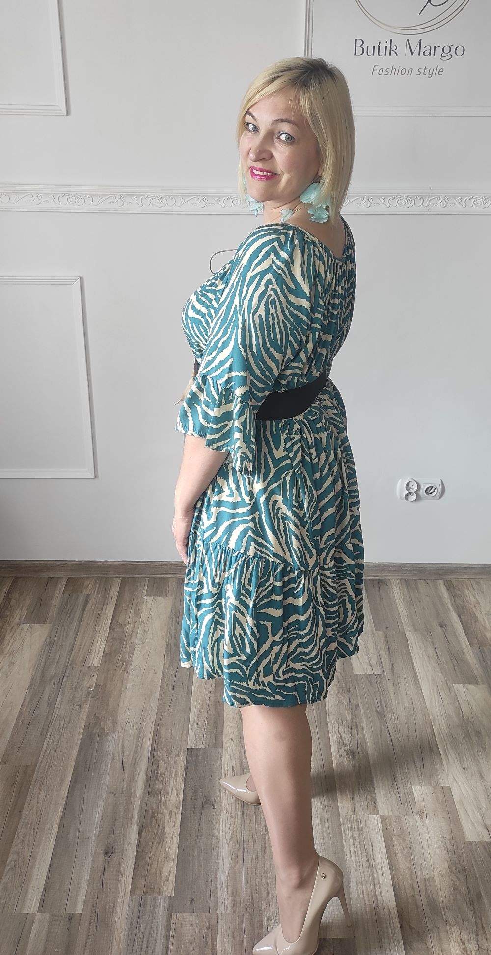 Sukienka ZEBRA, lekka i zwiewna sukienka, bez podszewki, wiskozowa o kroju oversize. Ma krótki do łokcia, dzwonowaty rękaw. Print: zebra, kolor turkusowo-beżowy. Sukienka ma krój luźny w kształt litery A. Idealna propozycja do pracy lub na co dzień, do pracy w biurze, urzędzie. Założysz ją z powodzeniem do trampka, szpilki, botka i kozaczka, a także do ramoneski i kurtki jeansowej, pod kardigan. Świetnie sprawdzi się z paskiem i będzie pięknie podkreślać talię. Możesz nosić ją każdego dnia ciesząc się lekkością noszenia.