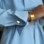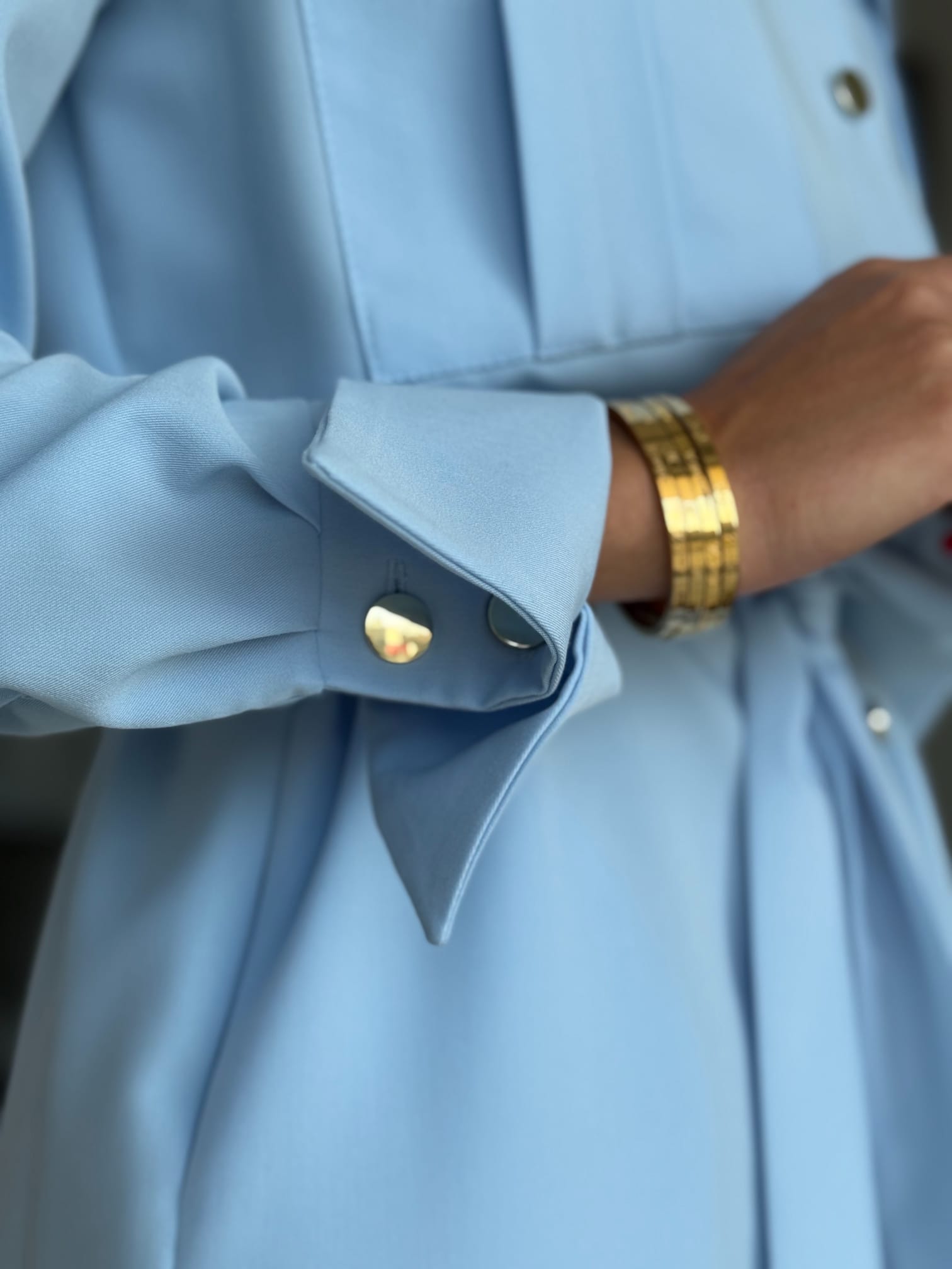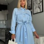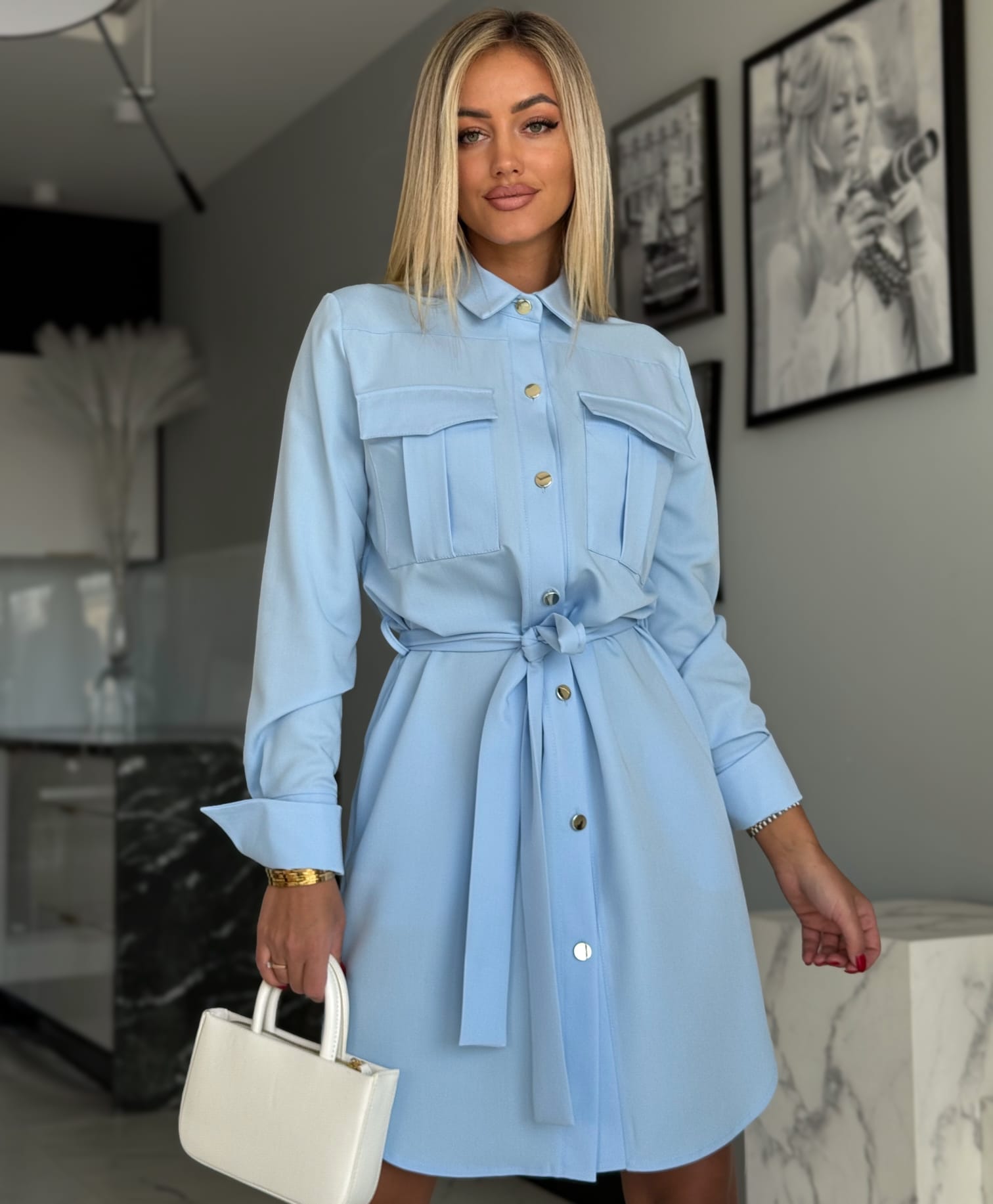 Stylowa sukienka w fasonie szmizjerki o luźnym, koszulowym kroju to idealne połączenie wygody i elegancji. Model zapinany na złote guziki, z paskiem w talii i bocznymi kieszeniami, pięknie podkreśla sylwetkę. Imitacje kieszonek na piersi oraz delikatne taliowanie z tyłu dodają jej kobiecego charakteru.