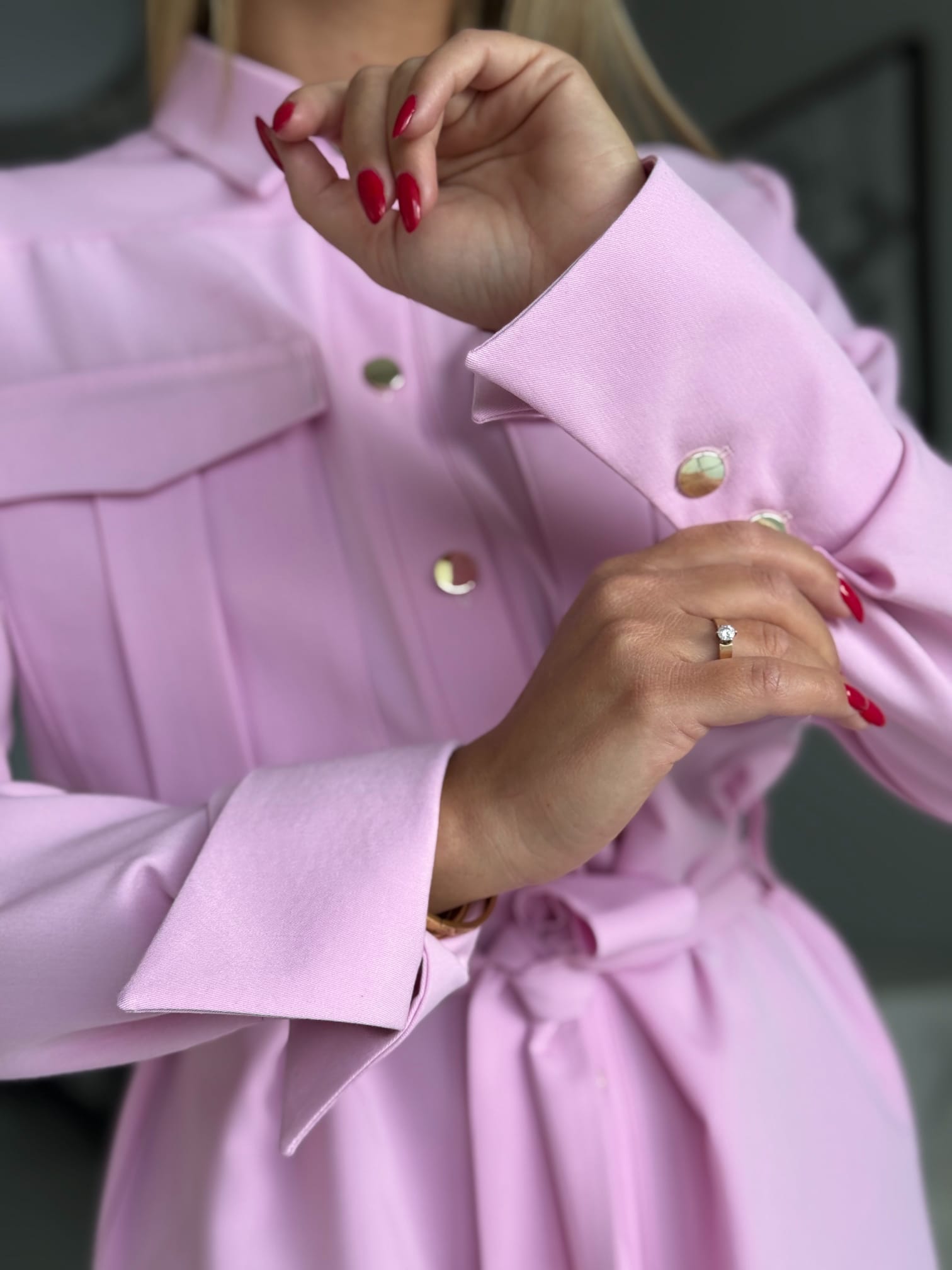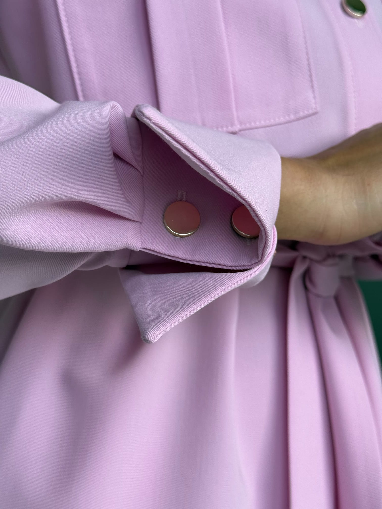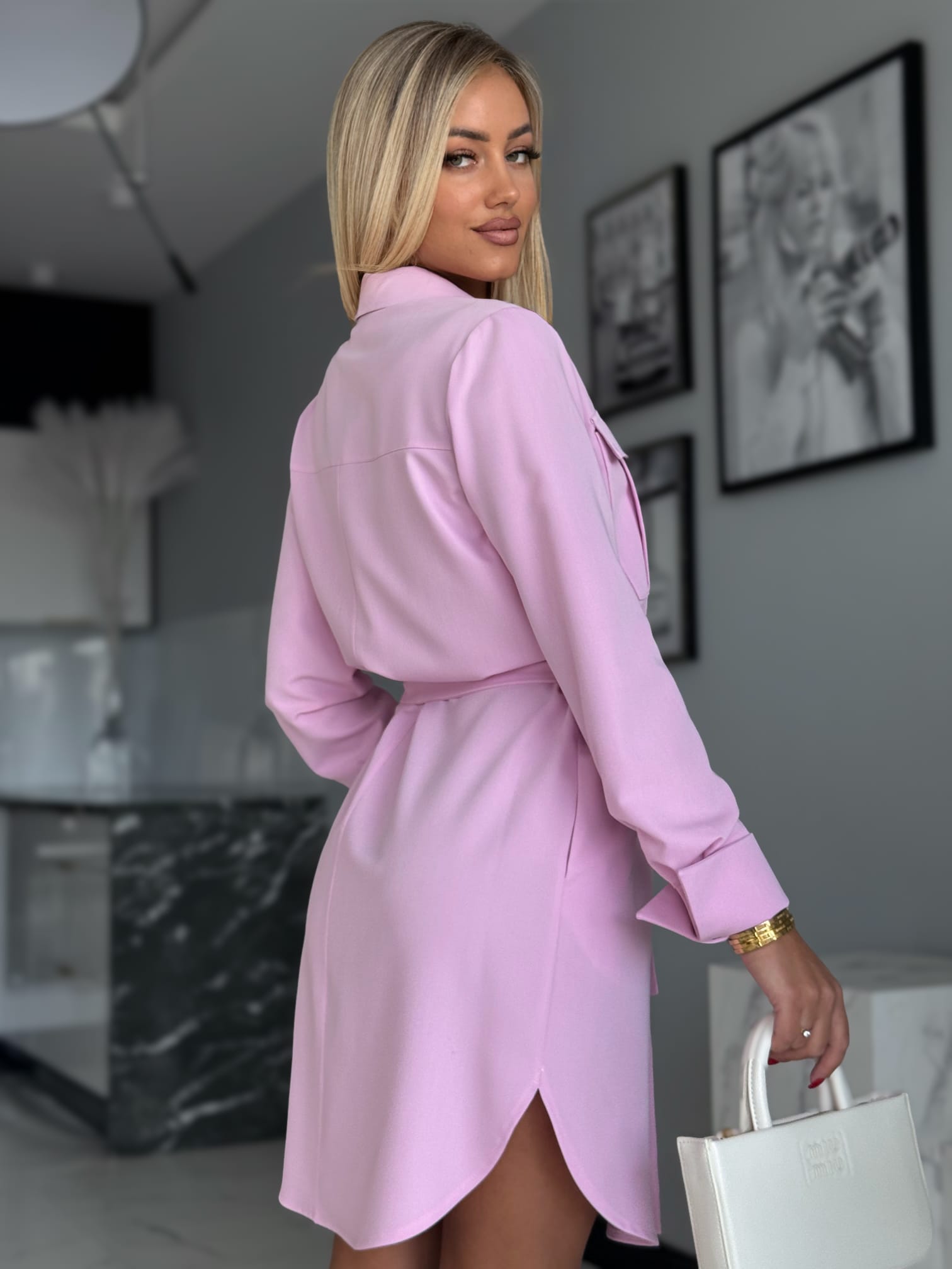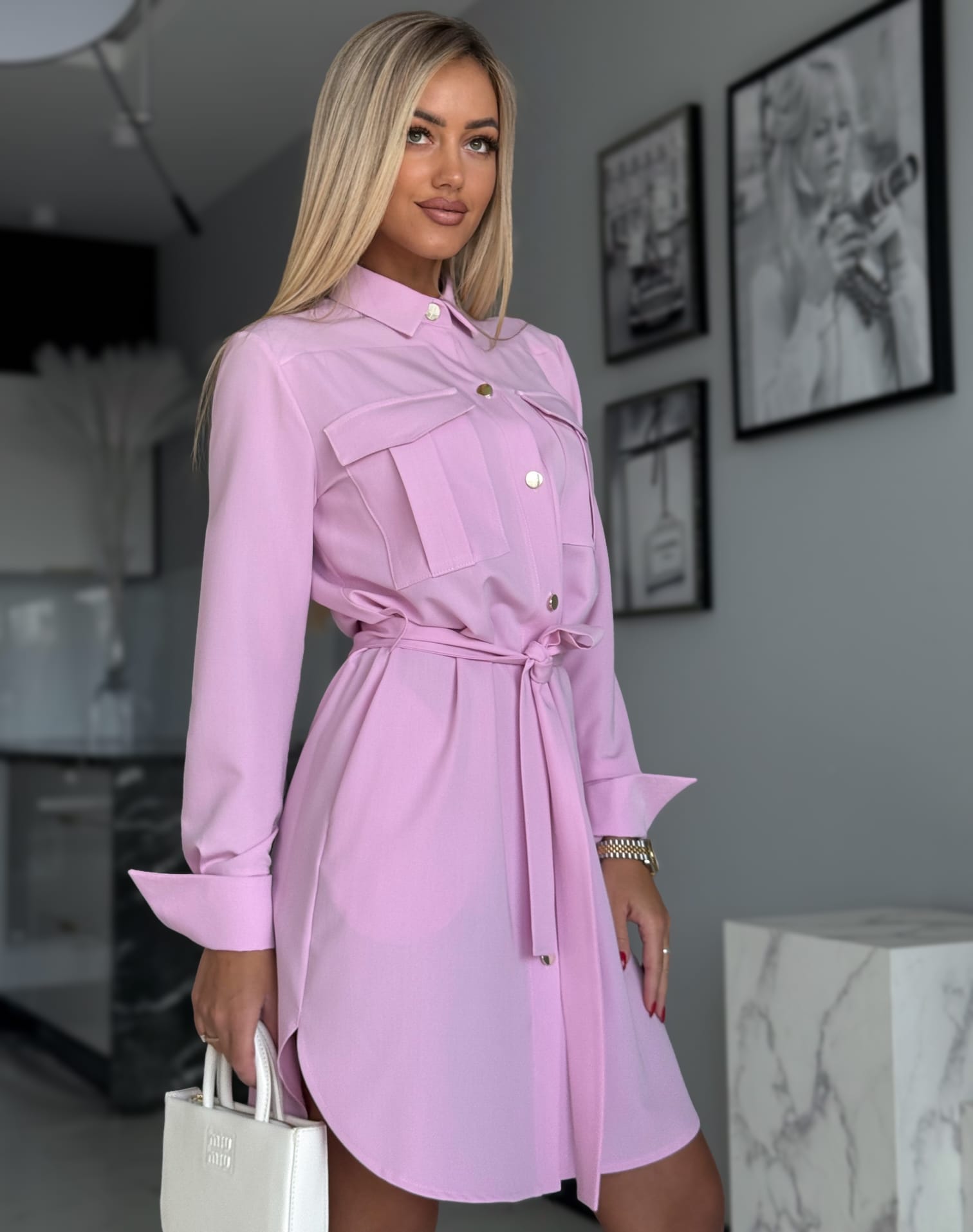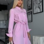 Stylowa sukienka w fasonie szmizjerki o luźnym, koszulowym kroju to idealne połączenie wygody i elegancji. Model zapinany na złote guziki, z paskiem w talii i bocznymi kieszeniami, pięknie podkreśla sylwetkę. Imitacje kieszonek na piersi oraz delikatne taliowanie z tyłu dodają jej kobiecego charakteru.