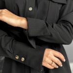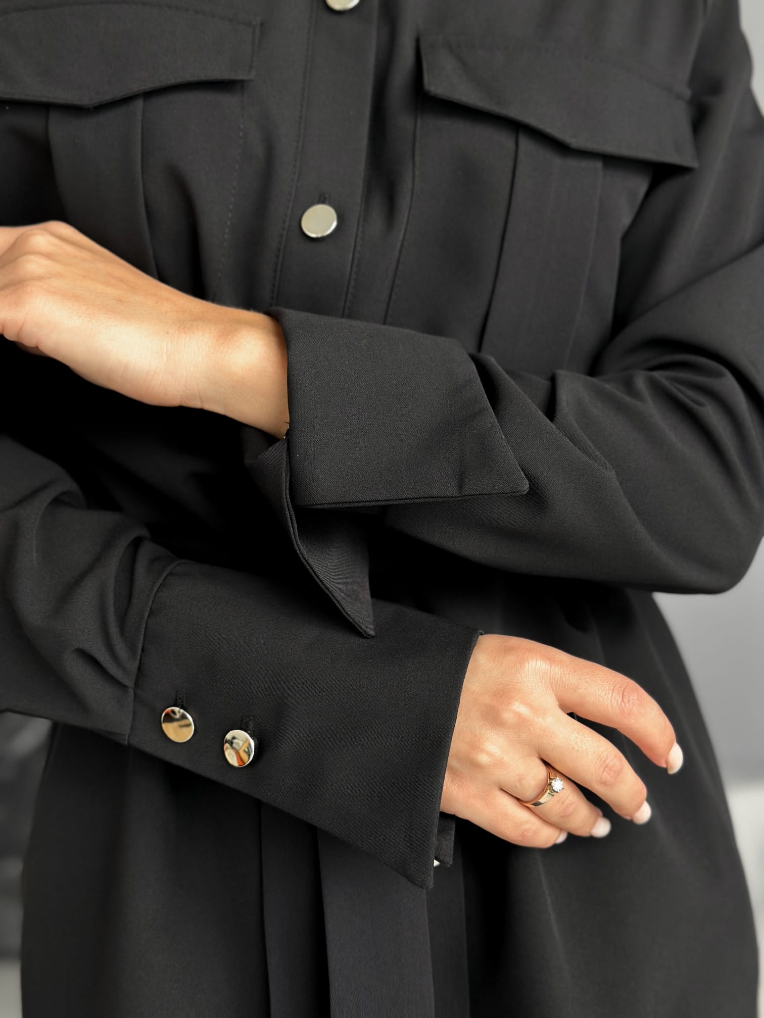 Stylowa sukienka w fasonie szmizjerki o luźnym, koszulowym kroju to idealne połączenie wygody i elegancji. Model zapinany na złote guziki, z paskiem w talii i bocznymi kieszeniami, pięknie podkreśla sylwetkę. Imitacje kieszonek na piersi oraz delikatne taliowanie z tyłu dodają jej kobiecego charakteru.