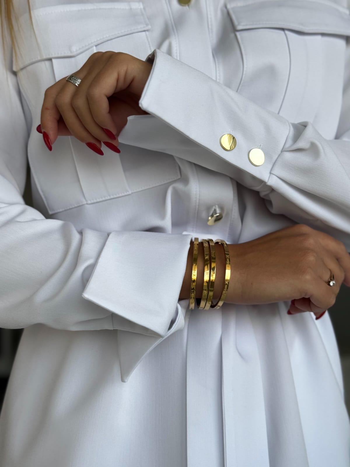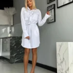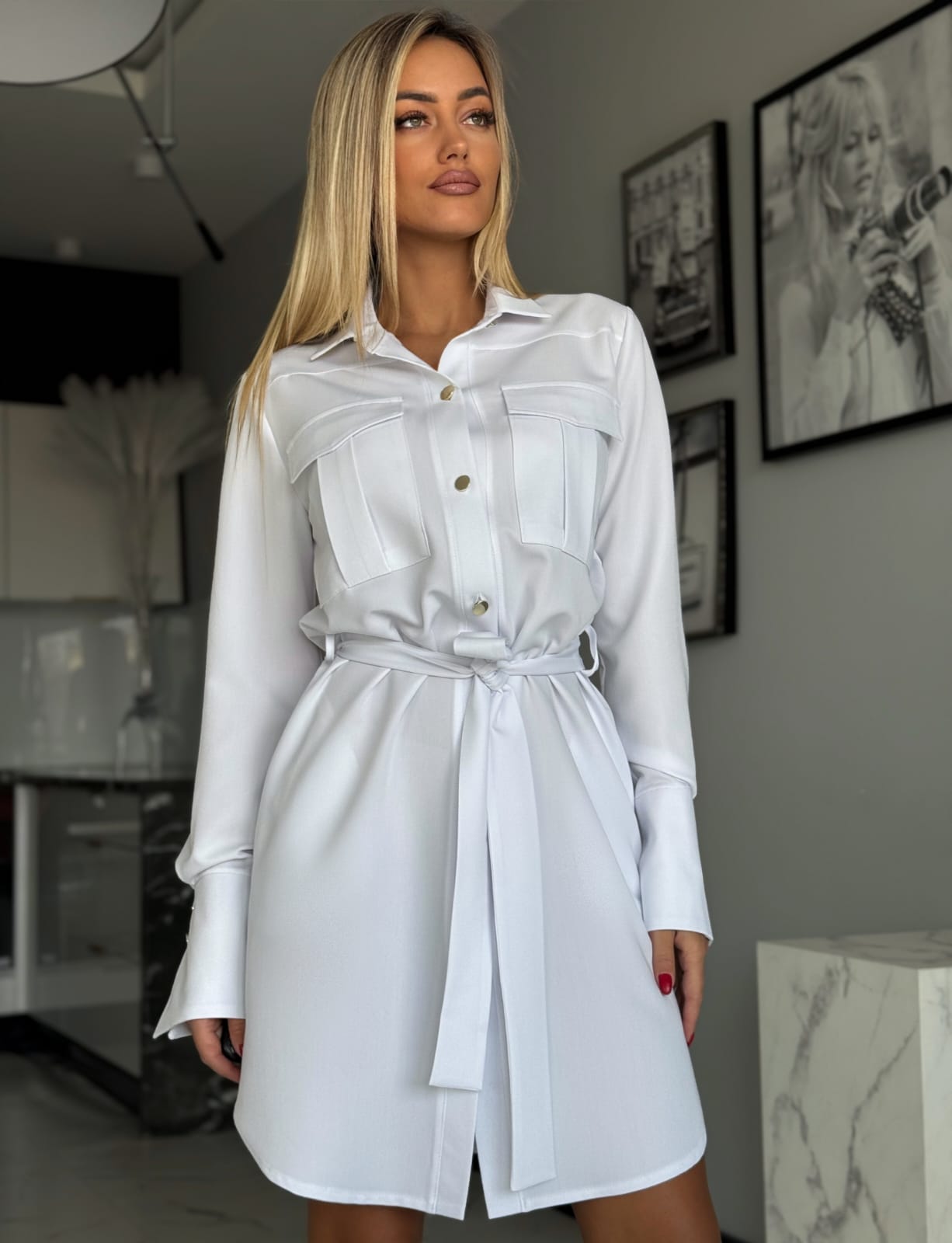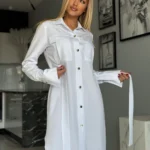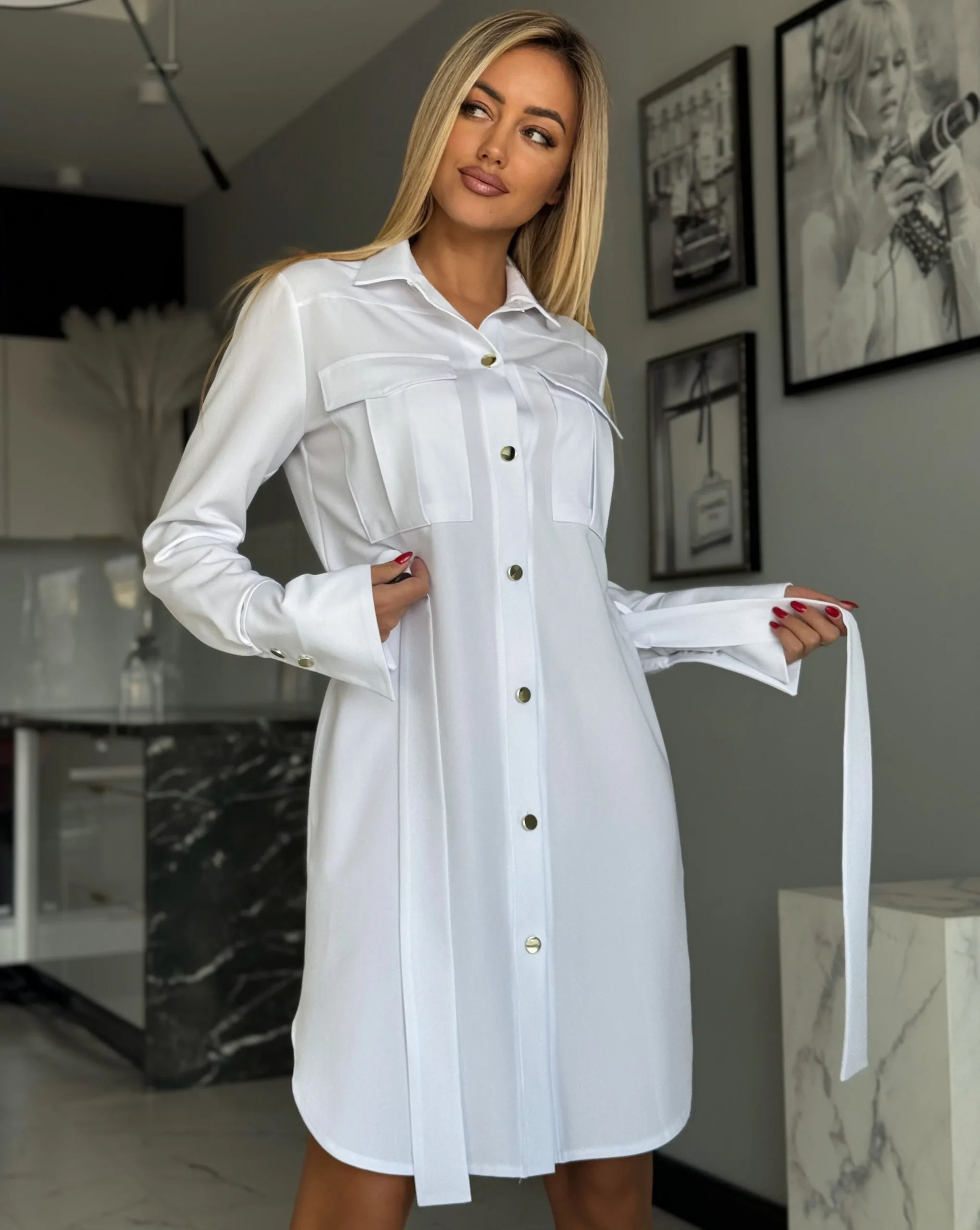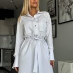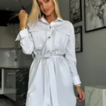 Stylowa sukienka w fasonie szmizjerki o luźnym, koszulowym kroju to idealne połączenie wygody i elegancji. Model zapinany na złote guziki, z paskiem w talii i bocznymi kieszeniami, pięknie podkreśla sylwetkę. Imitacje kieszonek na piersi oraz delikatne taliowanie z tyłu dodają jej kobiecego charakteru.