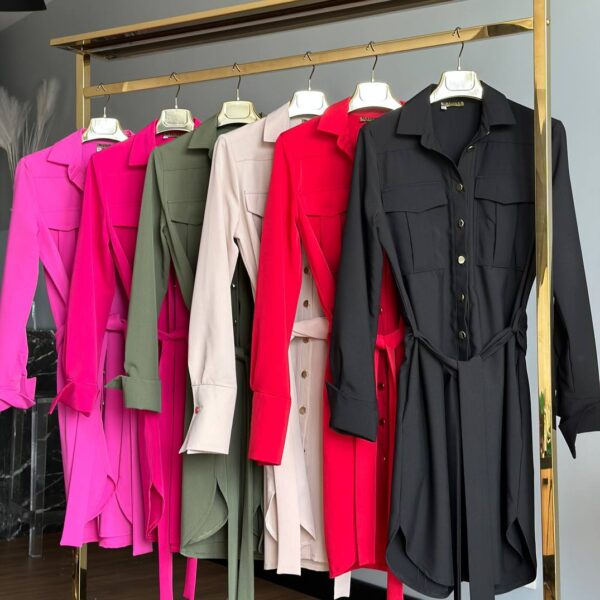 Stylowa sukienka w fasonie szmizjerki o luźnym, koszulowym kroju to idealne połączenie wygody i elegancji. Model zapinany na złote guziki, z paskiem w talii i bocznymi kieszeniami, pięknie podkreśla sylwetkę. Imitacje kieszonek na piersi oraz delikatne taliowanie z tyłu dodają jej kobiecego charakteru.